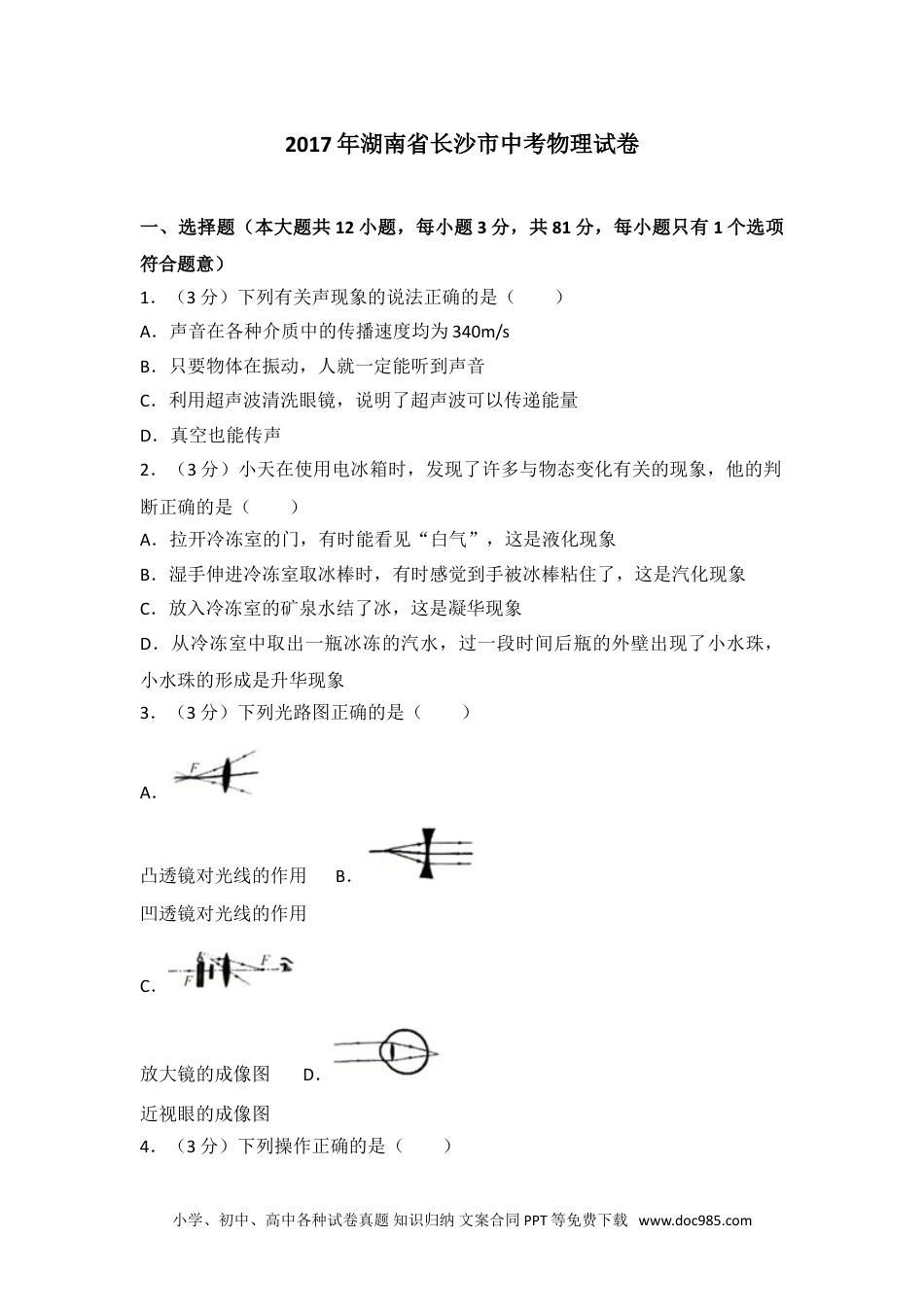 2017年湖南省长沙市中考物理试卷一、选择题(本大题共12小题,每小题3分,共81分,每小题只有1个选项符合题意)1.(3分)下列有关声现象的说法正确的是()A.声音在各种介质中的传播速度均为340m/sB.只要物体在振动,人就一定能听到声音C.利用超声波清洗眼镜,说明了超声波可以传递能量D.真空也能传声2.(3分)小天在使用电冰箱时,发现了许多与物态变化有关的现象,他的判断正确的是()A.拉开冷冻室的门,有时能看见“白气”,这是液化现象B.湿手伸进冷冻室取冰棒时,有时感觉到手被冰棒粘住了,这是汽化现象C.放入冷冻室的矿泉水结了冰,这是凝华现象D.从冷冻室中取出一瓶冰冻的汽水,过一段时间后瓶的外壁出现了小水珠,小水珠的形成是升华现象3.(3分)下列光路图正确的是()A.凸透镜对光线的作用B.凹透镜对光线的作用C.放大镜的成像图D.近视眼的成像图4.(3分)下列操作正确的是()小学、初中、高中各种试卷真题知识归纳文案合同PPT等免费下载www.doc985.comA.B.C.D.5.(3分)近年来,中国科技成就让世人瞩目:探月“嫦娥”、入海“蛟龙”、中国高铁、“天舟一号”、国产大飞机C919…一大批对国民经济和社会发展有重大影响的标志性科技创新成果不断涌现.下列说法正确的是()A.高铁因为速度快所以惯性大B.国产大飞机高度上升时,机舱外的大气压变大C.绕月飞行的“嫦娥”卫星如果不受任何外力作用,将会一直绕月作圆周运动D.“天舟一号”经火箭发射上升的过程中,“天舟一号”的重力势能变大6.(3分)班级大扫除时,小天发现许多现象与摩擦有关,其中减少摩擦的措施是()A.擦玻璃时把抹布压紧在玻璃上去擦B.书柜下装有滚轮便于移动位置C.黑板刷的刷面使用更粗糙的材料制成D.水桶的手柄上刻有凹凸不平的花纹7.(3分)现代社会倡导文明出行,过人行横道时行人应遵守交通信号灯指示.小天发现人行横道的红、绿灯是独立工作的,他设计了下列几种电路图,其中合理的是()A.B.C.D.小学、初中、高中各种试卷真题知识归纳文案合同PPT等免费下载www.doc985.com8.(3分)关于导体的电阻,下列说法中正确的是()A.导体导电说明它对电流没有任何阻碍作用B.导体的电阻越大,说明它对电流的阻碍作用越小C.相同条件下,铜导线比铁导线的导电性能好,说明导体的电阻与材料有关D.导体的电阻由它两端的电压和通过的电流决定9.(3分)下列关于家庭电路的说法正确的是()A.家庭电路中各用电器都是串联在电路中的B.发现触电事故时,应首先切断电源再想办法C.控制用电器的开关应接在该用电器和零线之间D.当干路中电流过大时,漏电保护器就会自动切断电路10.(3分)小天利用手中的条形磁体做了以下小实验,其中结论正确的是()A.条形磁体能够吸引小铁钉B.同名磁极相互吸引C.将条形磁体用细线悬挂起来,当它在水平面静止时北极会指向地理南方D.条形磁体与小磁针之间隔了一层薄玻璃后就不可能有互相作用了11.(3分)小天用电热水壶将1千克20℃的水加热至70℃,在这个过程中,下列分析正确的是(){c水=4.2×103J/(kg•℃)}.A.水吸收的热量为2.1×105JB.电热水壶消耗的电能全部转化为水的内能C.水的温度升高,它的内能减小D.水的温度升高,它的比热容变大12.(3分)在两个完全相同的容器中分别倒入甲和乙两种不同的液体,如图所示,下列分析正确的是()A.若甲和乙的质量相等,则甲的密度小于乙的密度B.若甲和乙对容器底部的压强相等,则甲的密度小于乙的密度C.若甲和乙对容器底部的压强相等,则甲的质量小于乙的质量小学、初中、高中各种试卷真题知识归纳文案合同PPT等免费下载www.doc985.comD.若甲和乙的质量相等,则甲对容器底部的压强小于乙对容器底部的压强二、填空题(本大题共5小题,11空,每空2分,共22分)13.(4分)2017年5月,我国在南海北部神狐海域进行的可燃冰试开采获得成功.我国可燃冰的总资源是常规天然气、页岩气资源总和的两倍,它与天然气、石油一样,都是(选填“可再生”或“不可再生”)能源;可燃冰燃烧时将化学能转化成为能.14.(4分)“共享单车”是互联网、智能手机、GPS定位系统和单车的资源整...