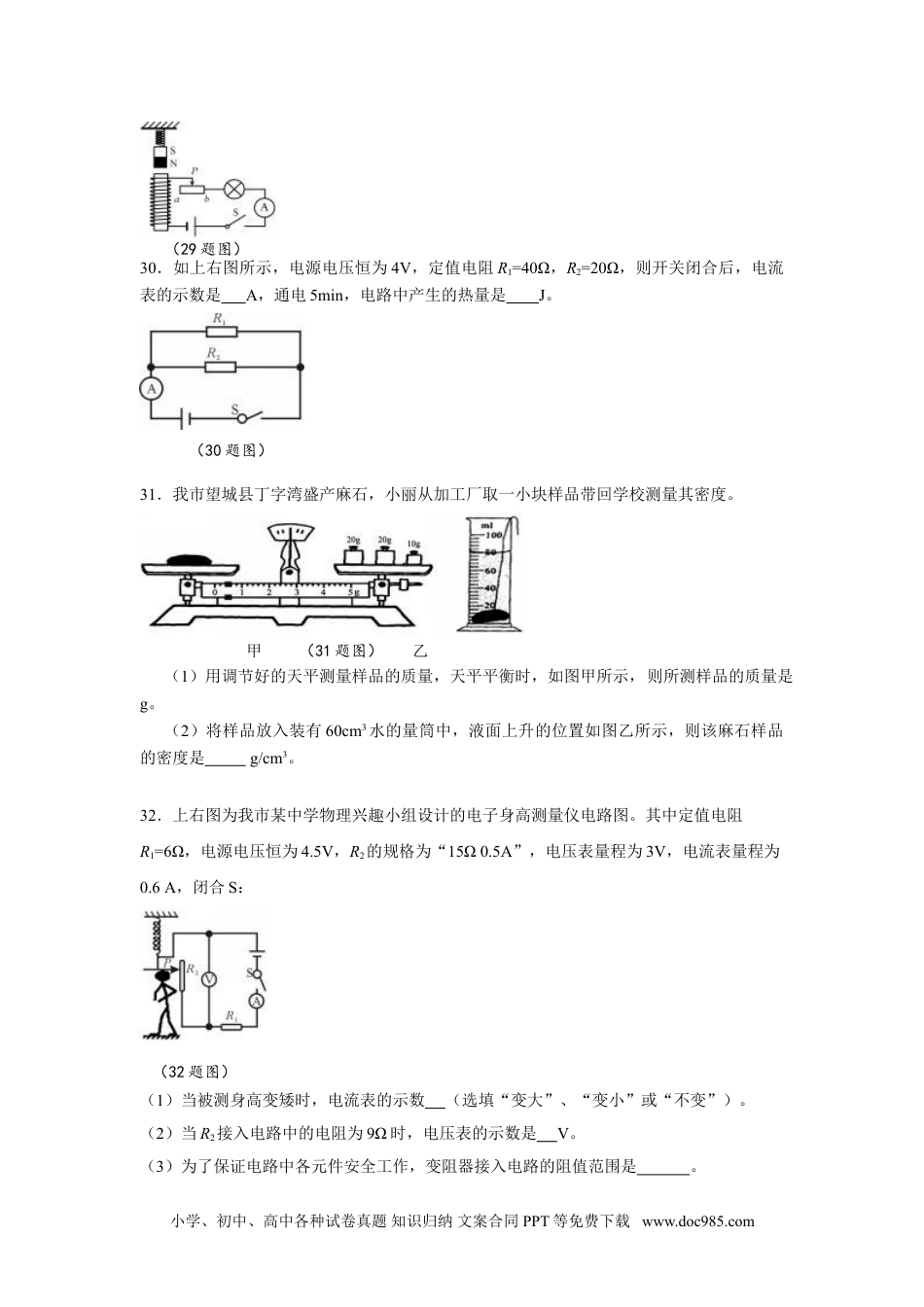 2011年长沙市初中毕业学业水平考试试卷物理一、选择题(本大题包括12个小题,每小题3分,共36分。每小题只有1个选项符合题意。请将符合题意的选项用2B铅笔填涂在答题卡相应位置。)16.下列短语或词句涉及到的知识与光的直线传播无关的是A.立竿见影B.鱼翔浅底C.三点一线D.一叶障目17.我国自主研制的“中华牌”月球车将在2013年送上月球,该月球车装有6只车轮。其车轮上刻有螺旋花纹的目的是A.减小摩擦B.增大摩擦C.增大压力D.减小压力18.2011年5月10日出版的《解放军报》刊发题为《亚丁湾,记者体验护航“十八般兵器”》的报道称,中国海军第五批护航编队的护航舰艇上,出现了一种神秘的声波武器——“金嗓子”,对索马里海盗构成了有效威慑。若要阻挡这一武器的袭击,可以用薄薄的一层A.半导体网B.磁性物质网C.真空带D.金属物质网19.如图所示是一种声光报警器电路,各元件均能正常工作。下列现象描述正确的是A.只闭合S2时,铃响灯不亮B.只闭合S1时,灯亮铃不响C.同时闭合S1、S2,铃响灯不亮D.同时闭合S1、S2,灯亮铃不响20.以下做法中,符合安全用电原则的是A.保险丝熔断后,用铜丝来代替B.趁停电时来检修电路而不需要关闭总闸C.将家用电器的金属外壳接地D.将电吹风放在浴缸旁,以便洗完澡后马上吹干头发21.目前,很多汽车的驾驶室里装有一个叫GPS(全球卫星定位系统)接收器的装置。GPS接收器通过接收卫星发射的信号,实现对车辆的精确定位并导航。卫星向GPS接收器传送信息依靠的是A.红外线B.紫外线C.电磁波D.激光22.下列实验中没有用到控制变量法的是A.探究杠杆的平衡条件B.探究电磁铁的磁性强弱与什么因素有关小学、初中、高中各种试卷真题知识归纳文案合同PPT等免费下载www.doc985.comC.探究液体内部压强特点D.探究导体的电流与它的电压、电阻的关系23.下列说法正确的是A.放在磁场中的导体一定会受到磁场力的作用B.发电机是把电能转化为机械能的装置C.电动机是把电能转化为机械能的装置D.电热水壶是利用电流的磁效应工作的24.日本福岛第一核电站发生核泄漏事件后,湖南长沙三一重工股份有限公司向日本捐赠一台62米混凝土泵车,参与福岛核电站反应堆冷却作业。这台62米泵车在给高温机组注入海水进行降温时,机组上空腾起白雾。关于白雾,下列说法正确的是A.白雾是由于海水的升华形成的B.白雾是由于海水遇热汽化后形成的水蒸气C.白雾是由于水蒸气遇冷液化而成的D.白雾是水蒸气凝华而成的25.如图所示,一个质量为45kg的人,在10s内连续5次跳上每级高度为0.2m的台阶,则此人在这段时间内的功率是(g取10N/kg)A.450WB.45WC.4.5WD.4500W26.纳米陶瓷作为高新科技材料应用广泛,它具有耐磨、耐腐蚀、耐高温、防渗透、完全无磁性等特点,但它不可以应用于下列哪项技术中A.公交IC卡B.纳米陶瓷刀C.“嫦娥二号”外表涂层D.装浓硫酸的容器27.将一物块轻轻放入盛满水的大烧杯中,静止后有81g水从大烧杯中溢出;将其轻轻放入盛满酒精的大烧杯中,静止后有72g酒精从大烧杯中溢出。已知ρ酒精=0.8×103kg/m3,则物块在水中的状态及物块的密度是A.悬浮1.0×103kg/m3B.漂浮0.92×103kg/m3C.下沉1.2×103kg/m3D.漂浮0.90×103kg/m3二、(本大题共5小题,11空,每空2分,共22分)28.小红家有一焦距为50mm的照相机,她利用该相机做了如下实验:(1)取下镜头,让太阳光正对镜头,可将太阳光会聚成一点,说明镜头相当于。(2)用该照相机镜头当作放大镜来观察地上的蚂蚁时,发现蚂蚁被放大了,此时镜头距蚂蚁的距离(填“大于”、“等于”、“小于”)50mm。29.如图所示,在电磁铁的正上方用弹簧秤挂着一条形磁铁,当开关闭合后,电磁铁与条形磁铁的相互作用为(填“吸引”或“排斥”);当滑片P从b端向a端滑动过程中,弹簧的长度会变(填“长”或“短”)。小学、初中、高中各种试卷真题知识归纳文案合同PPT等免费下载www.doc985.com(29题图)30.如上右图所示,电源电压恒为4V,定值电阻R1=40Ω,R2=20Ω,则开关闭合后,电流表的示数是A,通电5min,电路中产生的热量是J。(30题图)31.我市望城县丁字湾盛产麻石,小丽从加工厂取一小...