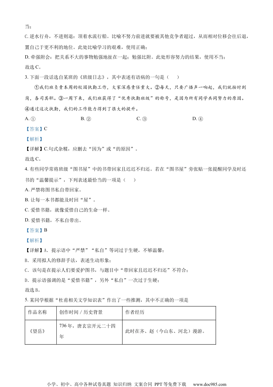小学、初中、高中各种试卷真题知识归纳文案合同PPT等免费下载www.doc985.com2022年长沙市初中学业水平考试试卷语文注意事项:1.答题前,请考生先将自己的姓名、准考证号填写清楚,并认真核对条形码上的姓名、准考证号、考室和座位号:2.必须在答题卡上答题,在草稿纸,试题卷上答题无效;3.答题时,请考生注意各题题号后面的答题要求;4.请勿折叠答题卡,保持字体工整、笔迹清晰、卡面清洁:5.答题卡上不准使用涂改液,涂改胶和贴纸:6.本学科试卷共23道题目,考试时量150分钟,满分120分。一、积累与运用(共18分)1.下面是某同学做的字音字形梳理记录,其中有错误的一项是()A.注意纠正因为方言发音造成的误读,如:“南(lán)方”应读成“南(nán)方”,“洞庭湖(fu)”应读成“洞庭湖(hū)”。B.注意纠正人名,地名的误读,如:“晏(àn)殊”应读成“晏(yàn)殊”,“汴(xià)京”应读成“汴(biàn)京”。C.注意因音近或形似造成的误写,如:“怂恿”不能写成“怂勇”,“崇拜”不能写成“祟拜”。D.注意成语字形的误写,如:“心无旁鹜”应写成“心无旁骛”,“相得益章”应写成“相得益彰”。【答案】A【解析】【详解】A.“湖(hū)”有误,应该为“hú”。故选A。2.下面是初三某同学写的毕业留言,其中加点词使用最恰当的一项是回首三年同窗生活,历历在目。课堂上,我们勤学好问,吹毛求疵;活动中,我们收获欢乐,可歌可泣。同学们,学习如逆水行舟,不进则退。我们一起努力拼搏,哪怕结果牵强附会,也问心无愧。A.吹毛求疵B.可歌可泣C.逆水行舟,不进则退D.牵强附会【答案】C【解析】【详解】A.吹毛求疵:把皮上的毛吹开,寻找疵点。比喻故意挑毛病找错。此处形容我们勤学好问的精神,使用不当;B.可歌可泣:值得歌颂,使人感动得流泪,指悲壮的事迹使人非常感动。此处形容同学们的快乐,使用不小学、初中、高中各种试卷真题知识归纳文案合同PPT等免费下载www.doc985.com当;C.逆水行舟,不进则退:顶着水流行船。比喻不努力前进就要被其他竞争者超过,从而相对位移会往后退,置自己于更不利的地位。此处比喻学习的艰难,使用正确;D.牵强附会:把关系不大的事物勉强地扯在一起;勉强比附。此处形容努力的结果,使用不当;故选C。3.下面一段话选自某班的《班级日志》,其中表述有语病的一句是()①我们班负责本周的校园执勤工作,大家深感责任重大。②每天,只要广播声一响起,我们就按时到岗,各司其职。③一周下来,我们班获得了“优秀执勤班级”的称号,是因为所有同学共同努力的原因。④通过这次执勤,我们的工作能力得到了很大的提升。A.①B.②C.③D.④【答案】C【解析】【详解】C.句式杂糅,应删去“因为”或“的原因”。故选C。4.有些同学常将班级“图书屋”中的书带回家且迟迟不归还。若在“图书屋”旁张贴一张提醒同学及时还书的“温馨提示”,下列表述最恰当的一项是()A.严禁将图书私自带回家。B.让每一本书都能及时回“屋”。C.爱惜书籍,就像爱惜自己的生命一样。D.爱惜书籍,不私自带出。【答案】B【解析】【详解】A.提示语中“严禁”“私自”等词过于生硬,不够温馨;B.采用拟人的修辞手法,表述生动形象;C.该句是在提示人们要爱护图书,与题目中“带回家且迟迟不归还”不符合;D.提示语强调的是“爱惜书籍”,另外“私自”一次过于生硬;故选B。5.某同学根据“杜甫相关文学知识表”作出了一些推测,其中不正确的一项是作品名称创作时间/历史背景作者经历《望岳》736年,唐玄宗开元二十四年此时在齐、赵(今山东、河北)漫游。小学、初中、高中各种试卷真题知识归纳文案合同PPT等免费下载www.doc985.com《春望》757年,安史之乱时期756年,将家小安置在鄜州,只身前往灵武投命肃宗,途中为叛军所绊,困居长安。《石壕吏》759年春,安史之乱时期,唐军退守河阳,四处抽丁补充兵力途经新安、石壕等地,根据目睹的现实写了这首诗。《月夜忆舍弟》759年秋,安史之乱中客居泰州(今甘禽天水),兄弟五人散处甘肃、河南、山东等地,只有最小的弟弟在身边。《茅屋为秋风所破歌》761年,安史之乱还未平定居住在成都近郊草堂。《江南逢...