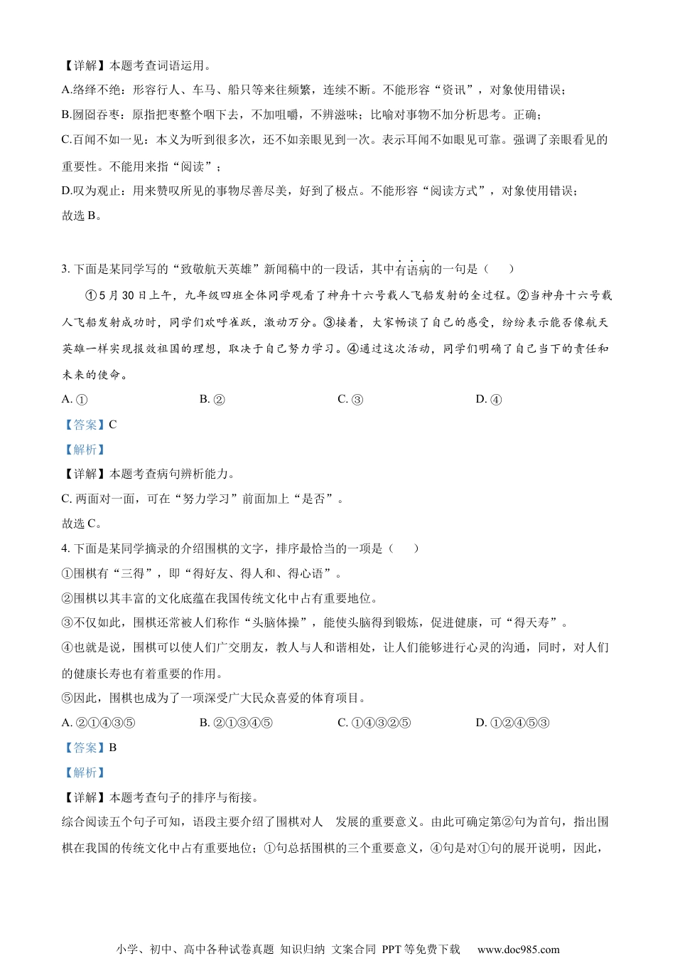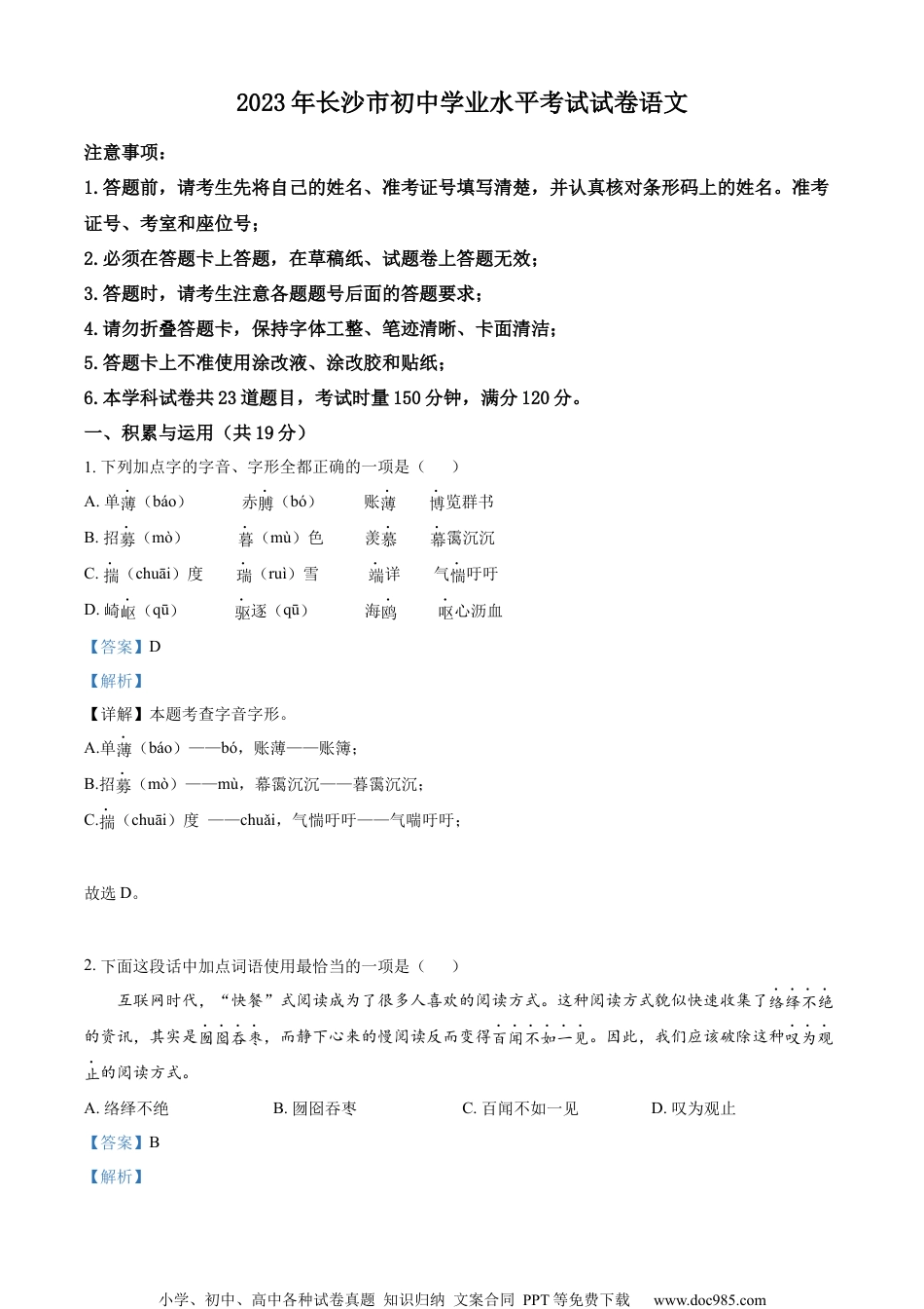 小学、初中、高中各种试卷真题知识归纳文案合同PPT等免费下载www.doc985.com2023年长沙市初中学业水平考试试卷语文注意事项:1.答题前,请考生先将自己的姓名、准考证号填写清楚,并认真核对条形码上的姓名。准考证号、考室和座位号;2.必须在答题卡上答题,在草稿纸、试题卷上答题无效;3.答题时,请考生注意各题题号后面的答题要求;4.请勿折叠答题卡,保持字体工整、笔迹清晰、卡面清洁;5.答题卡上不准使用涂改液、涂改胶和贴纸;6.本学科试卷共23道题目,考试时量150分钟,满分120分。一、积累与运用(共19分)1.下列加点字的字音、字形全都正确的一项是()A.单薄(báo)赤膊(bó)账薄博览群书B.招募(mò)暮(mù)色羡慕幕霭沉沉C.揣(chuāi)度瑞(ruì)雪端详气惴吁吁D.崎岖(qū)驱逐(qū)海鸥呕心沥血【答案】D【解析】【详解】本题考查字音字形。A.单薄(báo)——bó,账薄——账簿;B.招募(mò)——mù,幕霭沉沉——暮霭沉沉;C.揣(chuāi)度——chuǎi,气惴吁吁——气喘吁吁;故选D。2.下面这段话中加点词语使用最恰当的一项是()互联网时代,“快餐”式阅读成为了很多人喜欢的阅读方式。这种阅读方式貌似快速收集了络绎不绝的资讯,其实是囫囵吞枣,而静下心来的慢阅读反而变得百闻不如一见。因此,我们应该破除这种叹为观止的阅读方式。A.络绎不绝B.囫囵吞枣C.百闻不如一见D.叹为观止【答案】B【解析】小学、初中、高中各种试卷真题知识归纳文案合同PPT等免费下载www.doc985.com【详解】本题考查词语运用。A.络绎不绝:形容行人、车马、船只等来往频繁,连续不断。不能形容“资讯”,对象使用错误;B.囫囵吞枣:原指把枣整个咽下去,不加咀嚼,不辨滋味;比喻对事物不加分析思考。正确;C.百闻不如一见:本义为听到很多次,还不如亲眼见到一次。表示耳闻不如眼见可靠。强调了亲眼看见的重要性。不能用来指“阅读”;D.叹为观止:用来赞叹所见的事物尽善尽美,好到了极点。不能形容“阅读方式”,对象使用错误;故选B。3.下面是某同学写的“致敬航天英雄”新闻稿中的一段话,其中有语病的一句是()①5月30日上午,九年级四班全体同学观看了神舟十六号载人飞船发射的全过程。②当神舟十六号载人飞船发射成功时,同学们欢呼雀跃,激动万分。③接着,大家畅谈了自己的感受,纷纷表示能否像航天英雄一样实现报效祖国的理想,取决于自己努力学习。④通过这次活动,同学们明确了自己当下的责任和未来的使命。A.①B.②C.③D.④【答案】C【解析】【详解】本题考查病句辨析能力。C.两面对一面,可在“努力学习”前面加上“是否”。故选C。4.下面是某同学摘录的介绍围棋的文字,排序最恰当的一项是()①围棋有“三得”,即“得好友、得人和、得心语”。②围棋以其丰富的文化底蕴在我国传统文化中占有重要地位。③不仅如此,围棋还常被人们称作“头脑体操”,能使头脑得到锻炼,促进健康,可“得天寿”。④也就是说,围棋可以使人们广交朋友,教人与人和谐相处,让人们能够进行心灵的沟通,同时,对人们的健康长寿也有着重要的作用。⑤因此,围棋也成为了一项深受广大民众喜爱的体育项目。A.②①④③⑤B.②①③④⑤C.①④③②⑤D.①②④⑤③【答案】B【解析】【详解】本题考查句子的排序与衔接。综合阅读五个句子可知,语段主要介绍了围棋对人的发展的重要意义。由此可确定第②句为首句,指出围棋在我国的传统文化中占有重要地位;①句总括围棋的三个重要意义,④句是对①句的展开说明,因此,小学、初中、高中各种试卷真题知识归纳文案合同PPT等免费下载www.doc985.com①④句应按顺序捆绑在一起承接在②句之后;③句“不仅如此”进一步说明了围棋还有其他方面的作用,由此③句承接④句之后;最后⑤句进行总结,说明围棋是一项深受民众喜爱的体育项目。故排序为:②①③④⑤;故选B。5.下面是某同学根据以下知识卡片做出的分析或推断,其中有明显错误的一项是()标题作者/朝代游历地点创作背景情感《小石潭记》柳宗元/唐小石潭写于作者被贬永州期间从“心乐之”到“悄怆幽邃”《醉翁亭记》欧阳修/北宋琅琊山写于作者被贬滁州期间寄情山水,与民同乐《记...