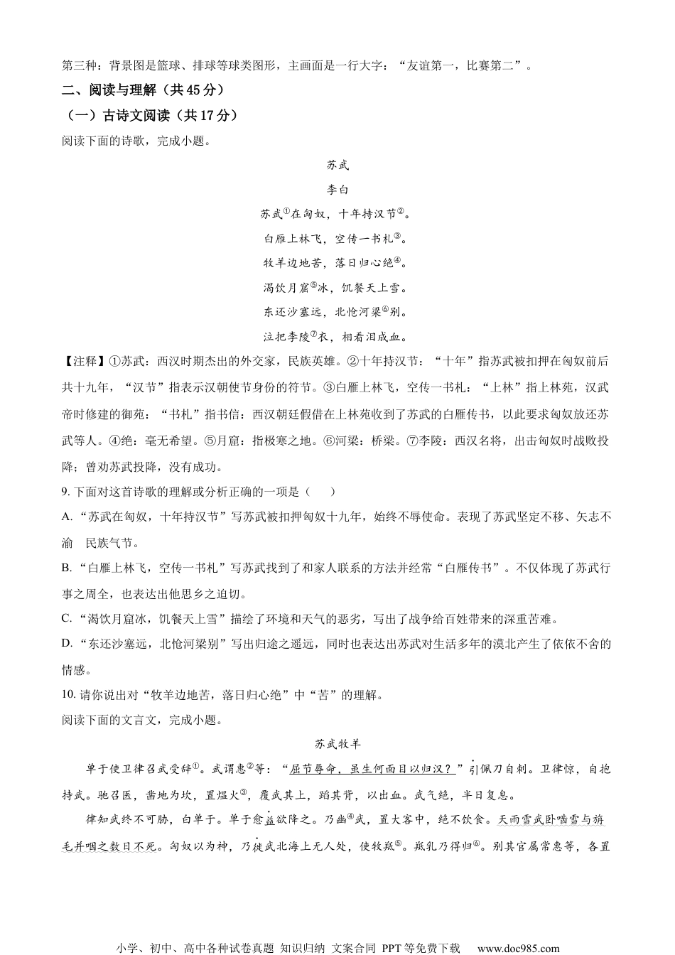 小学、初中、高中各种试卷真题知识归纳文案合同PPT等免费下载www.doc985.com2023年长沙市初中学业水平考试试卷语文注意事项:1.答题前,请考生先将自己的姓名、准考证号填写清楚,并认真核对条形码上的姓名。准考证号、考室和座位号;2.必须在答题卡上答题,在草稿纸、试题卷上答题无效;3.答题时,请考生注意各题题号后面的答题要求;4.请勿折叠答题卡,保持字体工整、笔迹清晰、卡面清洁;5.答题卡上不准使用涂改液、涂改胶和贴纸;6.本学科试卷共23道题目,考试时量150分钟,满分120分。一、积累与运用(共19分)1.下列加点字的字音、字形全都正确的一项是()A.单薄(báo)赤膊(bó)账薄博览群书B.招募(mò)暮(mù)色羡慕幕霭沉沉C.揣(chuāi)度瑞(ruì)雪端详气惴吁吁D.崎岖(qū)驱逐(qū)海鸥呕心沥血2.下面这段话中加点词语使用最恰当的一项是()互联网时代,“快餐”式阅读成为了很多人喜欢的阅读方式。这种阅读方式貌似快速收集了络绎不绝的资讯,其实是囫囵吞枣,而静下心来的慢阅读反而变得百闻不如一见。因此,我们应该破除这种叹为观止的阅读方式。A.络绎不绝B.囫囵吞枣C.百闻不如一见D.叹为观止3.下面是某同学写的“致敬航天英雄”新闻稿中的一段话,其中有语病的一句是()①5月30日上午,九年级四班全体同学观看了神舟十六号载人飞船发射的全过程。②当神舟十六号载人飞船发射成功时,同学们欢呼雀跃,激动万分。③接着,大家畅谈了自己的感受,纷纷表示能否像航天英雄一样实现报效祖国的理想,取决于自己努力学习。④通过这次活动,同学们明确了自己当下的责任和未来的使命。A.①B.②C.③D.④4.下面是某同学摘录的介绍围棋的文字,排序最恰当的一项是()①围棋有“三得”,即“得好友、得人和、得心语”。②围棋以其丰富的文化底蕴在我国传统文化中占有重要地位。③不仅如此,围棋还常被人们称作“头脑体操”,能使头脑得到锻炼,促进健康,可“得天寿”。④也就是说,围棋可以使人们广交朋友,教人与人和谐相处,让人们能够进行心灵的沟通,同时,对人们小学、初中、高中各种试卷真题知识归纳文案合同PPT等免费下载www.doc985.com的健康长寿也有着重要的作用。⑤因此,围棋也成为了一项深受广大民众喜爱的体育项目。A.②①④③⑤B.②①③④⑤C.①④③②⑤D.①②④⑤③5.下面是某同学根据以下知识卡片做出的分析或推断,其中有明显错误的一项是()标题作者/朝代游历地点创作背景情感《小石潭记》柳宗元/唐小石潭写于作者被贬永州期间从“心乐之”到“悄怆幽邃”《醉翁亭记》欧阳修/北宋琅琊山写于作者被贬滁州期间寄情山水,与民同乐《记承天寺夜游》苏轼/北宋承天寺写于作者被贬黄州期间既有赏月的闲适,也有被贬的落寞悲凉A.“记”是古代一种文体,大多是记述旅途见闻,描摹山水风光,吟咏人文胜迹,记录风土人情等。B.柳宗元、欧阳修、苏轼均有散文名篇传世,他们与韩愈、苏洵、苏辙、王安石、曾巩并称“唐宋八大家”。C.柳宗元、欧阳修、苏轼仕途都比较坎坷,都有被贬的经历,以上三篇文章都是在被贬期间写的。D.古代文人在仕途不顺、心情低落时都会写寄情于山水的文章,这些文章都表达出他们无法自拔的落寞悲伤情绪。6.古诗文默写。(1)王维在《使至塞上》中以“______,______”的诗句展现了雄奇壮丽的塞外风光。(2)范仲淹在《岳阳楼记》中写的一句“______,______”体现了古仁人志士宠辱不惊的旷达胸襟。综合性学习(共5分)光明中学举办以“青春赛场·活力绽放”为主题的体育节,请你参与体育节的以下宣传活动。7.【拟写宣传口号】学校为运动项目征集宣传口号,请你仿照下面的示例,结合项目特点,给“3000米长跑”项目拟写一句宣传口号。示例“4×100米接力赛”项目:合力奔跑,共创佳绩!“3000米长跑”项目:______8.【设计封面图案】学校将制作一本图文并茂的体育节纪念册,下面是同学们提供的三种纪念册封面设计构想,请结合体育节主题选择你认为最恰当的一种并说明理由。第一种:背景图是漫长的跑道和宽阔的看台,主画面是一根鲜艳的红色终点线。第二种:背景图是宽阔的跑道,主画面是一群奔跑的朝气蓬勃的青少年。小学、初...