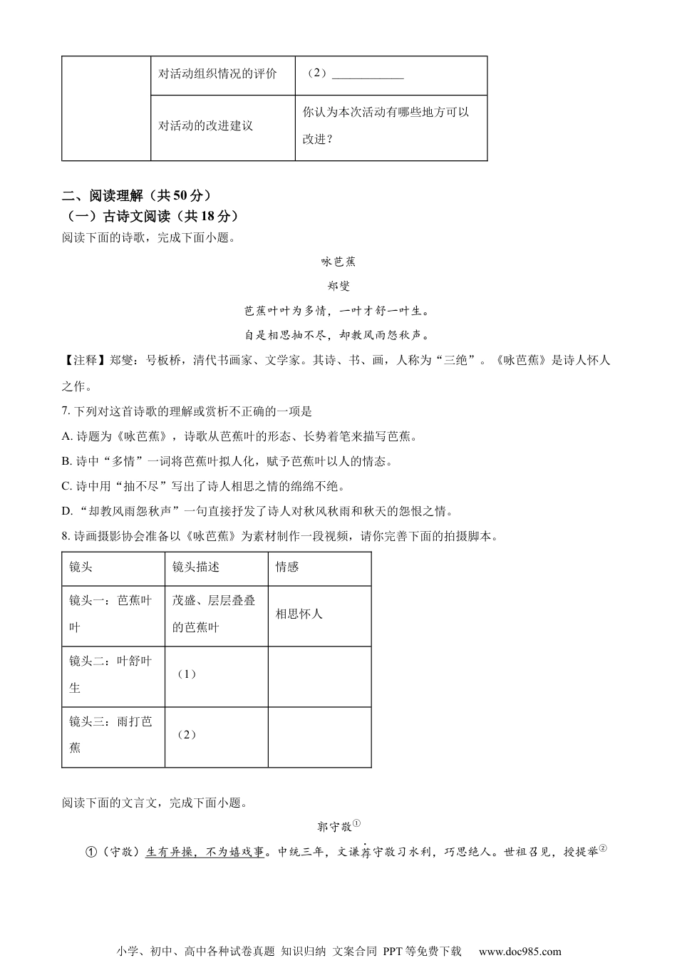 小学、初中、高中各种试卷真题知识归纳文案合同PPT等免费下载www.doc985.com2024长沙市中考语文真题卷一、积累与运用(共20分)学校开展爱心义卖活动,请你参加并完成下面的语文实践任务1.下面是某同学为义卖品写的推荐语,对加点字读音或字形分析正确的一项是()欢迎大家光临我们的展区,这里有琳琅满目的图书:精典的文学名著、有趣的动漫读本……有惟妙惟肖的泥塑作品:奔驰的骏马、憨厚的小熊……各个自出新裁,别俱一格。所有商品一律打折销售。A.“惟妙惟肖”的“肖”读xiào,“打折”的“折”读“shé”B.“泥塑”的“塑”读“suò”,“憨厚”的“憨”读“hān”C.“精典”的“精”应写为“经”,“奔驰”的“驰”应写为“弛”D.“自出新裁”的“新”应写为“心”,“别俱一格”的“俱”应写为“具”2.班级住呢比制作义卖诗画书签,请你根据画面和寓意匹配诗文画面寓意诗文一朵洁净的莲花虽处浊世,亦保持高洁(1)_____,________周敦颐《爱莲说》远山·菊花·诗人悠然闲适,热爱自然(2)_______,_______陶渊明《饮酒·其五》3.下面是对某同学写的活动邀请信的修改,不正确的一项是()邀请信尊敬的家长您好!①感谢您于百忙之中阅读我们的邀请信。②山区孩子的教育一直是全社会关注的焦点,处心积虑帮扶山区教育是每个人义不容辞的责任。③为了支援山区教育,培养学生助人为乐的行为,我校将举行爱心义卖活动。④活动将于5月18日下午2点在学校体育馆举行。⑤届时将有学生制作的书签,泥塑作品和手工花卉出售。⑥请您务必来参加。光明中学学生会2024年五月11日A.第②句中应将“处心积虑”改为“想方设法”B.第③句中应将“培养”改为“树立”C.第⑤句中逗号应改为顿号小学、初中、高中各种试卷真题知识归纳文案合同PPT等免费下载www.doc985.comD.第⑥句应该为“敬请您参加”4.义卖展台前,某同学询问:“不倒翁为什么不倒呢?”请你根据物理课代表提供的下列知识,用简洁的语言予以解答。(不超过50字)相关物理知识不倒翁的特点由于地球的吸引而使物体受到的力叫做重力,重力作用在某一个点上,这个点叫做物体的重心。物体重心越低,它的稳定性越高,越不容易倒。不倒翁成椭圆体,往往绘有可爱的图案,它一般用较轻的材料制成,底部大而圆滑,且放有较重的铁块,上轻下重,从而使得不倒翁的重心始终保持在底部中央。5.学生会对上午的活动情况进行小结,下面是各组反馈的问题A组:有些同学在展区追赶打闹,发生了碰撞B组:有些同学乱扔垃圾,破坏了展区卫生。C组:有些同学不守秩序,不排队购物。为了让下午的活动开展得更好,学生会拟写“三要三不要”得温馨提示,请你帮他们完成三要三不要要注意安全,不要追赶打闹(1)_________________(2)_________________6.活动调查小组拟开展调查采访,请你参加。A.请你根据要求,帮助调查小组设计一个采访问题。采访对象:家长采访目的:了解活动开展过程中家长的参与情况采访问题:(1)____________B.调查小组拟针对活动效果进行问卷调查,请你完成下面的表格。调查对象调查目的调查问题参与活动的同学对活动意义的理解与感受你认为本次活动有哪些意义?小学、初中、高中各种试卷真题知识归纳文案合同PPT等免费下载www.doc985.com对活动组织情况的评价(2)____________对活动的改进建议你认为本次活动有哪些地方可以改进?二、阅读理解(共50分)(一)古诗文阅读(共18分)阅读下面的诗歌,完成下面小题。咏芭蕉郑燮芭蕉叶叶为多情,一叶才舒一叶生。自是相思抽不尽,却教风雨怨秋声。【注释】郑燮:号板桥,清代书画家、文学家。其诗、书、画,人称为“三绝”。《咏芭蕉》是诗人怀人之作。7.下列对这首诗歌的理解或赏析不正确的一项是A.诗题为《咏芭蕉》,诗歌从芭蕉叶的形态、长势着笔来描写芭蕉。B.诗中“多情”一词将芭蕉叶拟人化,赋予芭蕉叶以人的情态。C.诗中用“抽不尽”写出了诗人相思之情的绵绵不绝。D.“却教风雨怨秋声”一句直接抒发了诗人对秋风秋雨和秋天的怨恨之情。8.诗画摄影协会准备以《咏芭蕉》为素材制作一段视频,请你完善下面的拍摄脚本。镜头镜头描述情感镜头一:芭蕉叶叶茂盛、层层叠叠的芭蕉...
