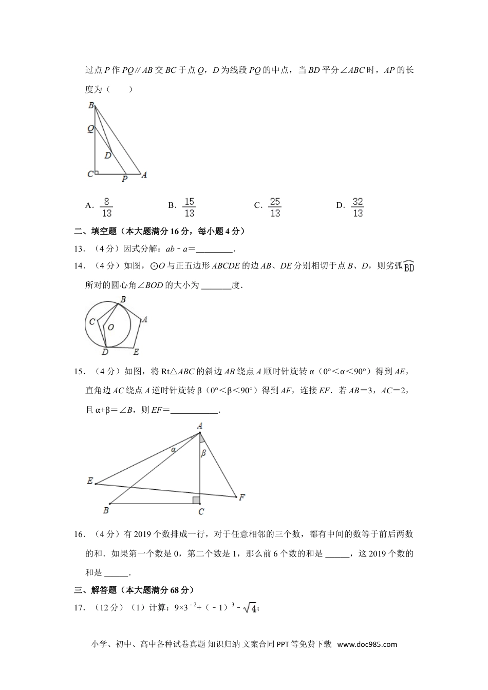 2019年海南省中考数学试卷一、选择题(本大题满分36分,每小题3分)在下列各题的四个备选答案中,有且只有一个是正确的,请在答题卡上把你认为正确的答案的字母代号按要求用2B铅笔涂黑1.(3分)如果收入100元记作+100元,那么支出100元记作()A.﹣100元B.+100元C.﹣200元D.+200元2.(3分)当m=﹣1时,代数式2m+3的值是()A.﹣1B.0C.1D.23.(3分)下列运算正确的是()A.a•a2=a3B.a6÷a2=a3C.2a2﹣a2=2D.(3a2)2=6a44.(3分)分式方程=1的解是()A.x=1B.x=﹣1C.x=2D.x=﹣25.(3分)海口市首条越江隧道﹣﹣文明东越江通道项目将于2020年4月份完工,该项目总投资3710000000元.数据3710000000用科学记数法表示为()A.371×107B.37.1×108C.3.71×108D.3.71×1096.(3分)如图是由5个大小相同的小正方体摆成的几何体,它的俯视图是()A.B.C.D.7.(3分)如果反比例函数y=(a是常数)的图象在第一、三象限,那么a的取值范围是()A.a<0B.a>0C.a<2D.a>28.(3分)如图,在平面直角坐标系中,已知点A(2,1),点B(3,﹣1),平移线段小学、初中、高中各种试卷真题知识归纳文案合同PPT等免费下载www.doc985.comAB,使点A落在点A1(﹣2,2)处,则点B的对应点B1的坐标为()A.(﹣1,﹣1)B.(1,0)C.(﹣1,0)D.(3,0)9.(3分)如图,直线l1∥l2,点A在直线l1上,以点A为圆心,适当长度为半径画弧,分别交直线l1、l2于B、C两点,连接AC、BC.若∠ABC=70°,则∠1的大小为()A.20°B.35°C.40°D.70°10.(3分)某路口的交通信号灯每分钟红灯亮30秒,绿灯亮25秒,黄灯亮5秒,当小明到达该路口时,遇到绿灯的概率是()A.B.C.D.11.(3分)如图,在▱ABCD中,将△ADC沿AC折叠后,点D恰好落在DC的延长线上的点E处.若∠B=60°,AB=3,则△ADE的周长为()A.12B.15C.18D.2112.(3分)如图,在Rt△ABC中,∠C=90°,AB=5,BC=4.点P是边AC上一动点,小学、初中、高中各种试卷真题知识归纳文案合同PPT等免费下载www.doc985.com过点P作PQ∥AB交BC于点Q,D为线段PQ的中点,当BD平分∠ABC时,AP的长度为()A.B.C.D.二、填空题(本大题满分16分,每小题4分)13.(4分)因式分解:ab﹣a=.14.(4分)如图,⊙O与正五边形ABCDE的边AB、DE分别相切于点B、D,则劣弧所对的圆心角∠BOD的大小为度.15.(4分)如图,将Rt△ABC的斜边AB绕点A顺时针旋转α(0°<α<90°)得到AE,直角边AC绕点A逆时针旋转β(0°<β<90°)得到AF,连接EF.若AB=3,AC=2,且α+β=∠B,则EF=.16.(4分)有2019个数排成一行,对于任意相邻的三个数,都有中间的数等于前后两数的和.如果第一个数是0,第二个数是1,那么前6个数的和是,这2019个数的和是.三、解答题(本大题满分68分)17.(12分)(1)计算:9×3﹣2+(﹣1)3﹣;小学、初中、高中各种试卷真题知识归纳文案合同PPT等免费下载www.doc985.com(2)解不等式组,并求出它的整数解.18.(10分)时下正是海南百香果丰收的季节,张阿姨到“海南爱心扶贫网”上选购百香果,若购买2千克“红土”百香果和1千克“黄金”百香果需付80元,若购买1千克“红土”百香果和3千克“黄金”百香果需付115元.请问这两种百香果每千克各是多少元?19.(8分)为宣传6月8日世界海洋日,某校九年级举行了主题为“珍惜海洋资源,保护海洋生物多样性”的知识竞赛活动.为了解全年级500名学生此次竞赛成绩(百分制)的情况,随机抽取了部分参赛学生的成绩,整理并绘制出如下不完整的统计表(表1)和统计图(如图).请根据图表信息解答以下问题:(1)本次调查一共随机抽取了个参赛学生的成绩;(2)表1中a=;(3)所抽取的参赛学生的成绩的中位数落在的“组别”是;(4)请你估计,该校九年级竞赛成绩达到80分以上(含80分)的学生约有人.表1知识竞赛成绩分组统计表组别分数/分频数A60≤x<70aB70≤x<8010C80≤x<9014D90≤x<1001820.(10分)如图是某区域的平面示意图,码头A在观测站B的正东方向,码头A的北偏西60°方向上有一小岛C,小岛C在观测站B的北偏西15°方向...