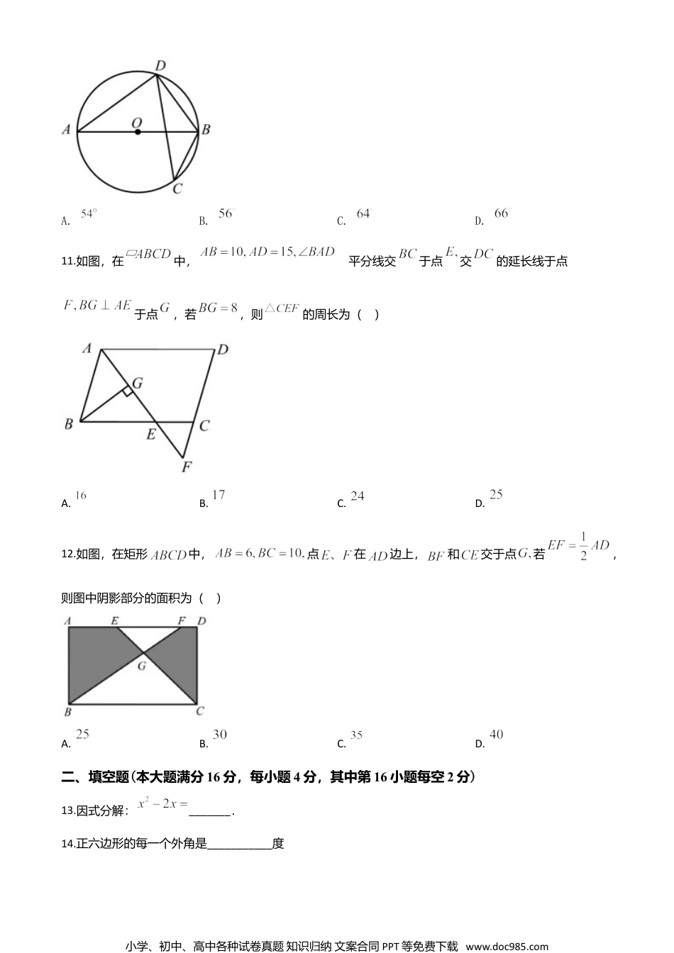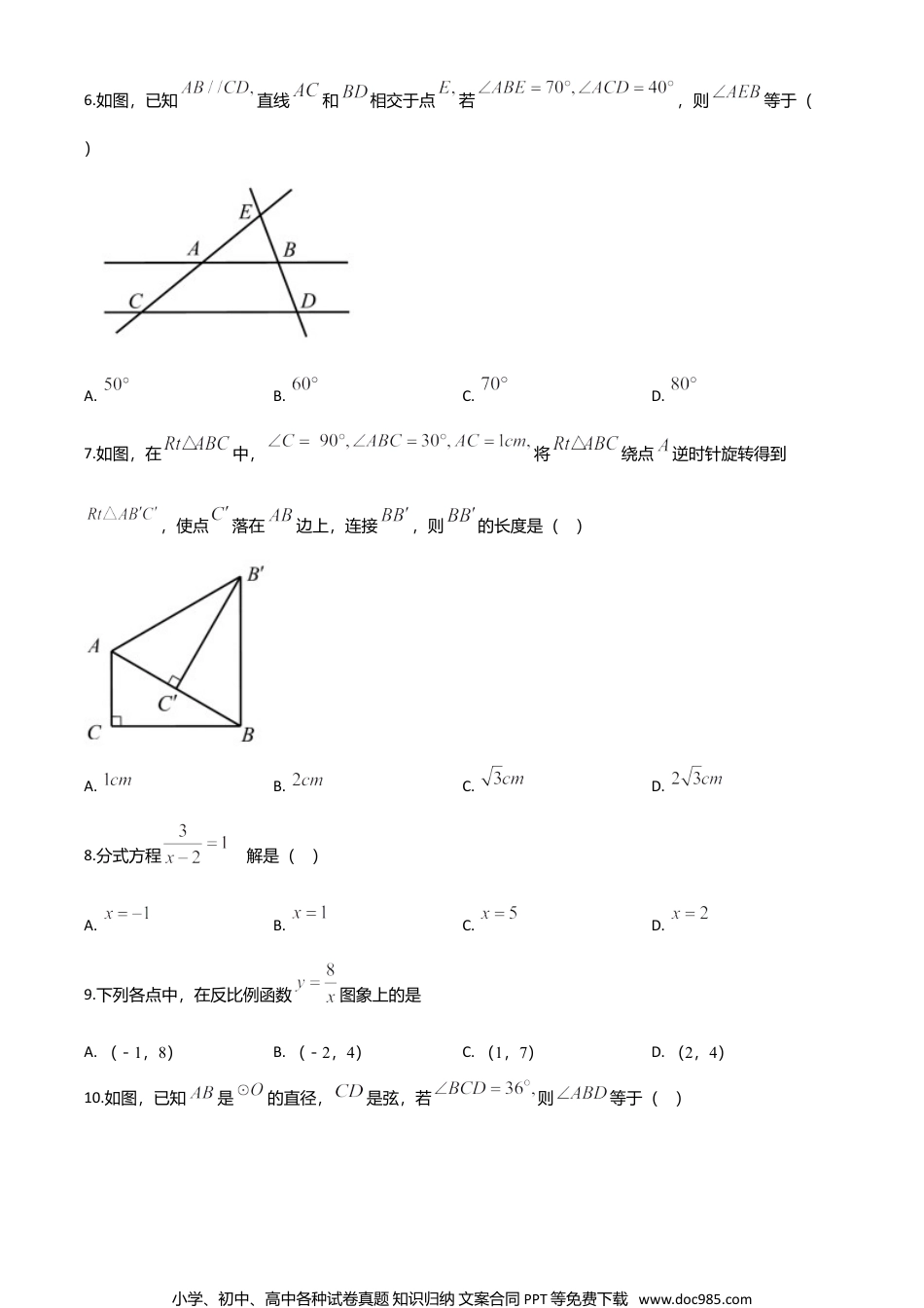 海南省2020年初中学业水平考试数学(考试时间100分钟,满分120分)一、选择题(本大题满分36分,每小题3分)在下列各题的四个备选答案中,有且只有一个是正确的,请在答题卡上把你认为正确的答案的字母代号按要求用2B铅笔涂黑.1.实数3的相反数是()A.B.C.3D.2.从海南省可再生能源协会2020年会上获悉,截至4月底,今年我省风电、光伏及生物质能的新能源发电量约千瓦时.数据可用科学记数法表示为()A.B.C.D.3.如图是由个相同的小正方体组成的几何体,则它的俯视图是()A.B.C.D.4.不等式的解集是()A.B.C.D.5.在学校开展的环保主题实践活动中,某小组的位同学捡拾废弃塑料袋的个数分别为:.这组数据的众数、中位数分别为()A.B.C.D.小学、初中、高中各种试卷真题知识归纳文案合同PPT等免费下载www.doc985.com6.如图,已知直线和相交于点若,则等于()A.B.C.D.7.如图,在中,将绕点逆时针旋转得到,使点落在边上,连接,则的长度是()A.B.C.D.8.分式方程的解是()A.B.C.D.9.下列各点中,在反比例函数图象上的是A.(-1,8)B.(-2,4)C.(1,7)D.(2,4)10.如图,已知是的直径,是弦,若则等于()小学、初中、高中各种试卷真题知识归纳文案合同PPT等免费下载www.doc985.comA.B.C.D.11.如图,在中,的平分线交于点交的延长线于点于点,若,则的周长为()A.B.C.D.12.如图,在矩形中,点在边上,和交于点若,则图中阴影部分的面积为()A.B.C.D.二、填空题(本大题满分16分,每小题4分,其中第16小题每空2分)13.因式分解:_______.14.正六边形的每一个外角是___________度小学、初中、高中各种试卷真题知识归纳文案合同PPT等免费下载www.doc985.com15.如图,在中,,分别以点为圆心,大于的长为半径画弧,两弧相交于点作直线,交边于点,连接,则的周长为________.16.海南黎锦有着悠久的历史,已被列入世界非物质文化遗产名录.图是黎锦上的图案,每个图案都是由相同菱形构成的,若按照第个图至第个图中的规律编织图案,则第个图中有_____________个菱形,第个图中有____________个菱形(用含的代数式表示).三、解答题(本大题满分68分)17.计算:(1);(2).18.某村经济合作社决定把吨竹笋加工后再上市销售,刚开始每天加工吨,后来在乡村振兴工作队的指导下改进加工方法,每天加工吨,前后共用天完成全部加工任务,问该合作社改进加工方法前后各用了多少天?19.“”新冠疫情防控期间,全国中小学开展停课不停学活动.某市为了解初中生每日线上学习时长(单位:小时)的情况,在全市范围内随机抽取了名初中生进行调查,并将所收集的数据分组整理,绘制了如图所示的不完整的频数分布直方图和扇形统计图.小学、初中、高中各种试卷真题知识归纳文案合同PPT等免费下载www.doc985.com根据图中信息,解答下列问题:(1)在这次调查活动中,采取的调查方式是_(“”“”填写全面调查或抽样调查),_.(2“)从该样本中随机抽取一名初中生每日线上学习时长,其恰好在”范围的概率是;(3)若该市有“名初中生,请你估计该市每日线上学习时长在”范围的初中生有_名.20.为了促进海口主城区与江东新区联动发展,文明东越江通道将于今年底竣工通车.某校数学实践活动小组利用无人机测算该越江通道的隧道长度.如图,隧道在水平直线上,且无人机和隧道在同一个铅垂面内,无人机在距离隧道米的高度上水平飞行,到达点处测得点的俯角为继续飞行米到达点处,测得点的俯角为.(1)填空:__________度,_________度;(2)求隧道的长度(结果精确到米).(参考数据:)21.四边形是边长为的正方形,是的中点,连结,点是射线上一动点(不与点重合),连结,交于点.小学、初中、高中各种试卷真题知识归纳文案合同PPT等免费下载www.doc985.com(1)如图1,当点是边的中点时,求证:;(2)如图2,当点与点重合时,求的长;(3)在点运动的过程中,当线段为何值时,?请说明理由.22.抛物线经过点和点,与轴交于点.(1)求该抛物线的函数表达式;(2)点是该抛物线上的动点,且位于轴的左侧.①如图1,过点作轴于点,作轴于点,当时,求的长;小学、初中、高中各种试卷真题知识归纳文案合同PPT等免费下...