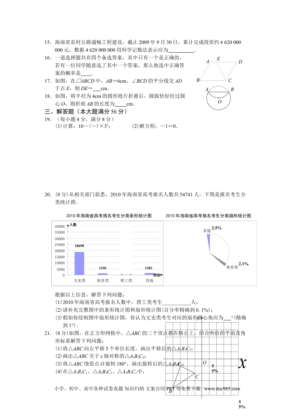 ABDCABCDO海南省2010年初中毕业学业考试数学科试题一、选择题(本大题满分36分,每小题3分)1.-2的绝对值等于()A.-2B.-C.D.22.计算-a-a的结果是()A.0B.2aC.-2aD.a23.在平面直角坐标系中,点P(2,3)在()A.第一象限B.第二象限C.第三象限D.第四象限4.如图所示几何体的主视图是()5.同一平面内,半径是2cm和3cm的两圆的圆心距为5cm,则它们的位置关系是()A.相离B.相交C.外切D.内切6.若分式有意义,则x的取值范围是()A.x>1B.x<1C.x≠1D.x≠07.如图,a、b、c分别表示△ABC的三边长,则下面与△ABC一定全等的三角形是()8.方程3x-1=0的根是()A.3B.C.-D.-39.在正方形网格中,∠的位置如图所示,则tan的值是()A.B.C.D.210.如图,在梯形ABCD中,AD∥BC,AC与BD相交于点O,则下列三角形中,与△BOC一定相似的是()A.△ABDB.△DOAC.△ACDD.△ABO11.如图,在△ABC中,AB=AC,AD⊥BC于点D,则下列结论不一定成立的是()A.AD=BDB.BD=CDC.∠BAD=∠CADD.∠B=∠C12.在双曲线y=的任一支上,y都随x的增大而增大,则k的值可以是()A.-1B.0C.1D.2二、填空题(本大题满分18分,每小题3分)13.计算:a2·a3=.14.某工厂计划天生产60件产品,则平均每天生产该产品__________件.小学、初中、高中各种试卷真题知识归纳文案合同PPT等免费下载www.doc985.comABCDACBacb72°50°aaaabbb50°50°50°58°72°ABCD15.海南省农村公路通畅工程建设,截止2009年9月30日,累计完成投资约4620000000元,数据4620000000用科学记数法表示应为.16.一道选择题共有四个备选答案,其中只有一个是正确的,若有一位同学随意选了其中一个答案,那么他选中正确答案的概率是.17.如图,在□ABCD中,AB=6cm,∠BCD的平分线交AD于点E,则DE=cm.18.如图,将半径为4cm的圆形纸片折叠后,圆弧恰好经过圆心O,则折痕AB的长度为cm.三、解答题(本大题满分56分)19.(每小题4分,满分8分)(1)计算:10―(―)×32;(2)解方程:-1=0.20.(8分)从相关部门获悉,2010年海南省高考报名人数共54741人,下图是报名考生分类统计图.根据以上信息,解答下列问题:(1)2010年海南省高考报名人数中,理工类考生___________人;(2)请补充完整图中的条形统计图和扇形统计图(百分率精确到0.1%);(3)假如你绘制图中扇形统计图,你认为文史类考生对应的扇形圆心角应为°(精确到1°).21.(8分)如图,在正方形网格中,△ABC的三个顶点都在格点上,结合所给的平面直角坐标系解答下列问题:(1)将△ABC向右平移5个单位长度,画出平移后的△A1B1C1;(2)画出△ABC关于x轴对称的△A2B2C2;(3)将△ABC绕原点O旋转180°,画出旋转后的△A3B3C3;(4)在△A1B1C1、△A2B2C2、△A3B3C3中,小学、初中、高中各种试卷真题知识归纳文案合同PPT等免费下载www.doc985.comABCEDAOByCABxO文史类体育类理工类其他0500010000150002000025000300003500040000文史类体育类理工类其他2.5%55%1869813831150类别2010年海南省高考报名考生分类条形统计图人数2010年海南省高考报名考生分类扇形统计图2.1%55%AEBCDFGH△________与△________成轴对称;△________与△________成中心对称.22.(8分)2010年上海世博会入园门票有11种之多,其中“指定日普通票”价格为200元一张,“指定日优惠票”价格为120元一张,某门票销售点在5月1日开幕式这一天共售出这两种门票1200张,收入216000元,该销售点这天分别售出这两种门票多少张?23.(11分)如图,四边形ABCD和四边形AEFG均为正方形,连接BG与DE相交于点H.(1)证明:△ABG≌△ADE;(2)试猜想∠BHD的度数,并说明理由;(3)将图中正方形ABCD绕点A逆时针旋转(0°<∠BAE<180°),设△ABE的面积为S1,△ADG的面积为S2,判断S1与S2的大小关系,并给予证明.24.(13分)如图,在平面直角坐标系中,直线y=-x+3与x轴、y轴分别交于点B、C;抛物线y=-x2+bx+c经过B、C两点,并与x轴交于另一点A.小学、初中、高中各种试卷真题知识归纳文案合同PPT等免费下载www.doc985.comAOMBNCPxyl(1)求该抛物线所对应的函数关系式;(2)设P(x,y)...