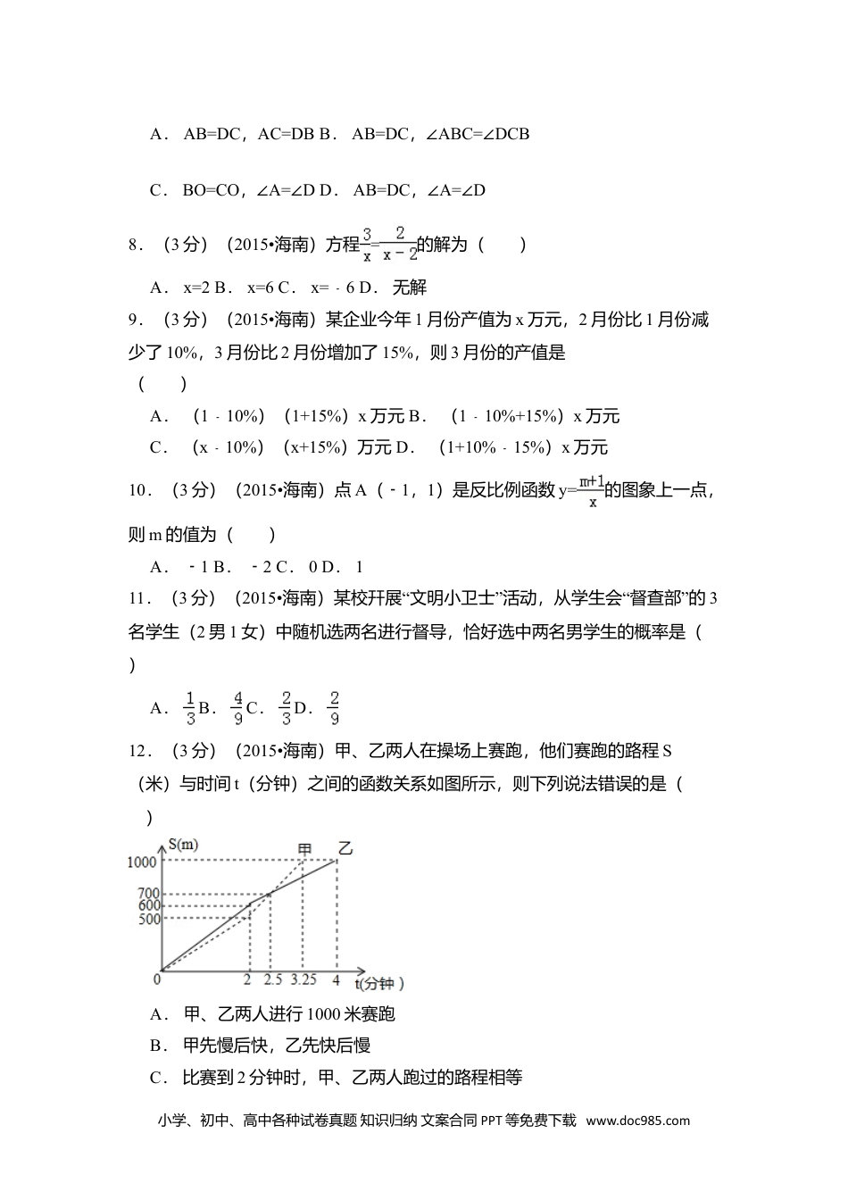 2015年海南省中考数学试卷一、选择题(每小题3分,共42分)1.(3分)(2015•海南)﹣2015的倒数是()A.﹣B.C.﹣2015D.20152.(3分)(2015•海南)下列运算中,正确的是()A.a2+a4=a6B.a6÷a3=a2C.(﹣a4)2=a6D.a2•a4=a63.(3分)(2015•海南)已知x=1,y=2,则代数式xy﹣的值为()A.1B.﹣1C.2D.﹣34.(3分)(2015•海南)有一组数据:1,4,﹣3,3,4,这组数据的中位数为()A.﹣3B.1C.3D.45.(3分)(2015•海南)如图是由5个完全相同的小正方体组成的几何体.则这个几何体的主视图是()A.B.C.D.6.(3分)(2015•海南)据报道,2015年全国普通高考报考人数约为9420000人,数据9420000用科学记数法表示为9.42×10n,则n的值是()A.4B.5C.6D.77.(3分)(2015•海南)如图,下列条件中,不能证明△ABC≌△DCB的是()小学、初中、高中各种试卷真题知识归纳文案合同PPT等免费下载www.doc985.comA.AB=DC,AC=DBB.AB=DC,∠ABC=∠DCBC.BO=CO,∠A=∠DD.AB=DC,∠A=∠D8.(3分)(2015•海南)方程=的解为()A.x=2B.x=6C.x=6D﹣.无解9.(3分)(2015•海南)某企业今年1月份产值为x万元,2月份比1月份减少了10%,3月份比2月份增加了15%,则3月份的产值是()A.(110%﹣)(1+15%)x万元B.(110%+15%﹣)x万元C.(x10%﹣)(x+15%)万元D.(1+10%15%﹣)x万元10.(3分)(2015•海南)点A(﹣1,1)是反比例函数y=的图象上一点,则m的值为()A.﹣1B.﹣2C.0D.111.(3分)(2015•“”“”海南)某校幵展文明小卫士活动,从学生会督查部的3名学生(2男1女)中随机选两名进行督导,恰好选中两名男学生的概率是()A.B.C.D.12.(3分)(2015•海南)甲、乙两人在操场上赛跑,他们赛跑的路程S(米)与时间t(分钟)之间的函数关系如图所示,则下列说法错误的是()A.甲、乙两人进行1000米赛跑B.甲先慢后快,乙先快后慢C.比赛到2分钟时,甲、乙两人跑过的路程相等小学、初中、高中各种试卷真题知识归纳文案合同PPT等免费下载www.doc985.comD.甲先到达终点13.(3分)(2015•海南)如图,点P是▱ABCD边AB上的一点,射线CP交DA的延长线于点E,则图中相似的三角形有()A.0对B.1对C.2对D.3对14.(3分)(2015•海南)如图,将⊙O沿弦AB折叠,圆弧恰好经过圆心O,点P是优弧上一点,则∠APB的度数为()A.45°B.30°C.75°D.60°二、填空题(每小题4分,共16分)15.(4分)(2015•海南)分解因式:x29=﹣.16.(4分)(2015•海南)点(﹣1,y1)、(2,y2〕是直线y=2x+1上的两点,则y1y2“”“(填>或=”“”或<)17.(4分)(2015•海南)如图,在平面直角坐标系中,将点P(﹣4,2)绕原点顺时针旋转90°,则其对应点Q的坐标为.18.(4分)(2015•海南)如图,矩形ABCD中,AB=3,BC=4,则图中五个小矩形的周长之和为.小学、初中、高中各种试卷真题知识归纳文案合同PPT等免费下载www.doc985.com三、解答题(本题共6小题,共62分)19.(10分)(2015•海南)(1)计算:(﹣1)3﹣12×2﹣2﹣;(2)解不等式组:.20.(8分)(2015•“”海南)小明想从天猫某网店购买计算器,经査询,某品牌A号计算器的单价比B型号计算器的单价多10元,5台A型号的计算器与7台B型号的计算器的价钱相同,问A、B两种型号计算器的单价分别是多少?小学、初中、高中各种试卷真题知识归纳文案合同PPT等免费下载www.doc985.com21.(8分)(2015•海南)为了治理大气污染,我国中部某市抽取了该市2014年中120天的空气质量指数,绘制了如下不完整的统计图表:空气质量指数统计表级别指数天数百分比优050﹣24m良51100﹣a40%轻度污染101150﹣1815%中度污染151200﹣1512.5%重度污染201300﹣97.5%严重污染大于30065%合计120100%请根据图表中提供的信息,解答下面的问题:(1)空气质量指数统计表中的a=,m=;(2)请把空气质量指数条形统计图补充完整:(3“”“”)若绘制空气质量指数扇形统计图,级别为优所对应扇形的圆心角是度;(4)估计该市2014年(365天)中空气质量指数大于100的天数约有天.小学、初中、高中各种试...