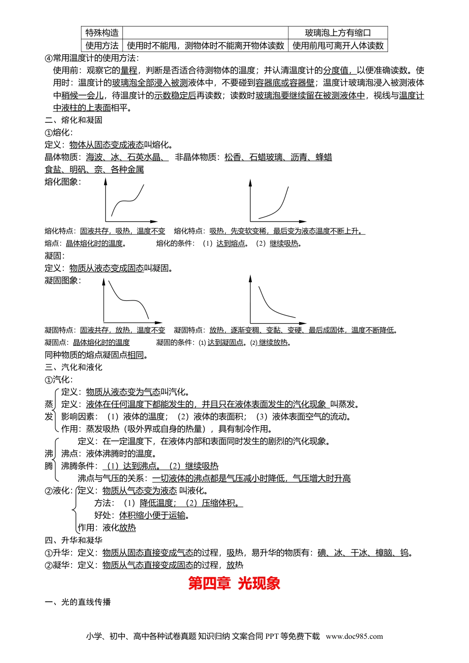 初中物理知识归纳总结(打印版)第一章机械运动一、长度和时间的测量1、测量某个物理量时用来进行比较的标准量叫做单位。为方便交流,国际计量组织制定了一套国际统一的单位,叫国际单位制(简称SI)。2、长度的单位:在国际单位制中,长度的基本单位是米(m),其他单位有:千米(km)、分米(dm)、厘米(cm)、毫米(mm)、微米(μm)、纳米(nm)。1km=1000m;1dm=0.1m;1cm=0.01m;1mm=0.001m;1μm=0.000001m;1nm=0.000000001m。测量长度的常用工具:刻度尺。刻度尺的使用方法:①注意刻度标尺的零刻度线、最小分度值和量程;②测量时刻度尺的刻度线要紧贴被测物体,位置要放正,不得歪斜,零刻度线应对准所测物体的一端;③读数时视线要垂直于尺面,并且对正观测点,不能仰视或者俯视。3、国际单位制中,时间的基本单位是秒(s)。时间的单位还有小时(h)、分(min)。1h=60min1min=60s。4、测量值和真实值之间的差异叫做误差,我们不能消灭误差,但应尽量减小误差。误差的产生与测量仪器、测量方法、测量的人有关。减少误差方法:多次测量求平均值、选用精密测量工具、改进测量方法。误差与错误区别:误差不是错误,错误不该发生能够避免,误差永远存在不能避免。二、运动的描述1、运动是宇宙中最普遍的现象,物理学里把物体位置变化叫做机械运动。2、在研究物体的运动时,选作标准的物体叫做参照物。参照物的选择:任何物体都可做参照物,应根据需要选择合适的参照物(不能选被研究的物体作参照物)。研究地面上物体的运动情况时,通常选地面为参照物。选择不同的参照物来观察同一个物体结论可能不同。同一个物体是运动还是静止取决于所选的参照物,这就是运动和静止的相对性。三、运动的快慢1、物体运动的快慢用速度表示。在相同时间内,物体经过的路程越长,它的速度就越快;物体经过相同的路程,所花的时间越短,速度越快。在匀速直线运动中,速度等于运动物体在单位时间内通过的路程。在物理学中,为了比较物体运动的快慢,采用“相同时间比较路程”的方法,也就是将物体运动的路程除以所用时间。这样,在比较不同运动物体的快慢时,可以保证时间相同。计算公式:v=其中:s——路程——米(m);t——时间——秒(s);v——速度——米/秒(m/s)国际单位制中,速度的单位是米每秒,符号为m/s或m·s-1,交通运输中常用千米每小时做速度的单位,符号为km/h或km·h-1,1m/s=3.6km/h。v=,变形可得:s=vt,t=。2、快慢不变,沿着直线的运动叫匀速直线运动。匀速直线运动是最简单的机械运动。运动速度变化的运动叫变速运动,变速运动的快慢用平均速度来表示,粗略研究时,也可用速度的公式来计算,平均速度=总路程/总时间。四、测量平均速度1、停表的使用:第一次按下时,表针开始转动(启动);第二次按下时,表针停止转动(停止);第三次按下时,表针弹回零点(回表)。读数:表中小圆圈的数字单位为min,大圆圈的数字单位为s。2、测量原理:平均速度计算公式v=第二章声现象一、声音的产生与传播1、一切发声的物体都在振动。用手按住发音的音叉,发音也停止,该现象说明振动停止发声也停止。振动的物体叫声源。人说话,唱歌靠声带的振动发声,婉转的鸟鸣靠鸣膜的振动发声,清脆的蟋蟀叫声靠翅膀摩擦的振动发声,其振动频率一定在20-20000次/秒之间。2、声音的传播需要介质,真空不能传声。在空气中,声音以看不见的声波来传播,声波到达人耳,引起鼓膜振动,人就听到声音。气体、液体、固体都能发声,空气能传播声音。小学、初中、高中各种试卷真题知识归纳文案合同PPT等免费下载www.doc985.com3、声音在介质中的传播速度简称声速。一般情况下,v固>v液>v气声音在15℃空气中的传播速度是340m/s合1224km/h,在真空中的传播速度为0m/s。4、回声是由于声音在传播过程中遇到障碍物被反射回来而形成的。如果回声到达人耳比原声晚0.1s以上人耳能把回声跟原声区分开来,此时障碍物到听者的距离至少为17m。利用:利用回声可以测定海底深度、冰山距离、敌方潜水艇的远近测量中要先知道声音在海水中的传播速度,测量方法是:测出发出声音到受到反射回来的声音讯号的时间t,查出声音在介质中的传播速度v,则发声...