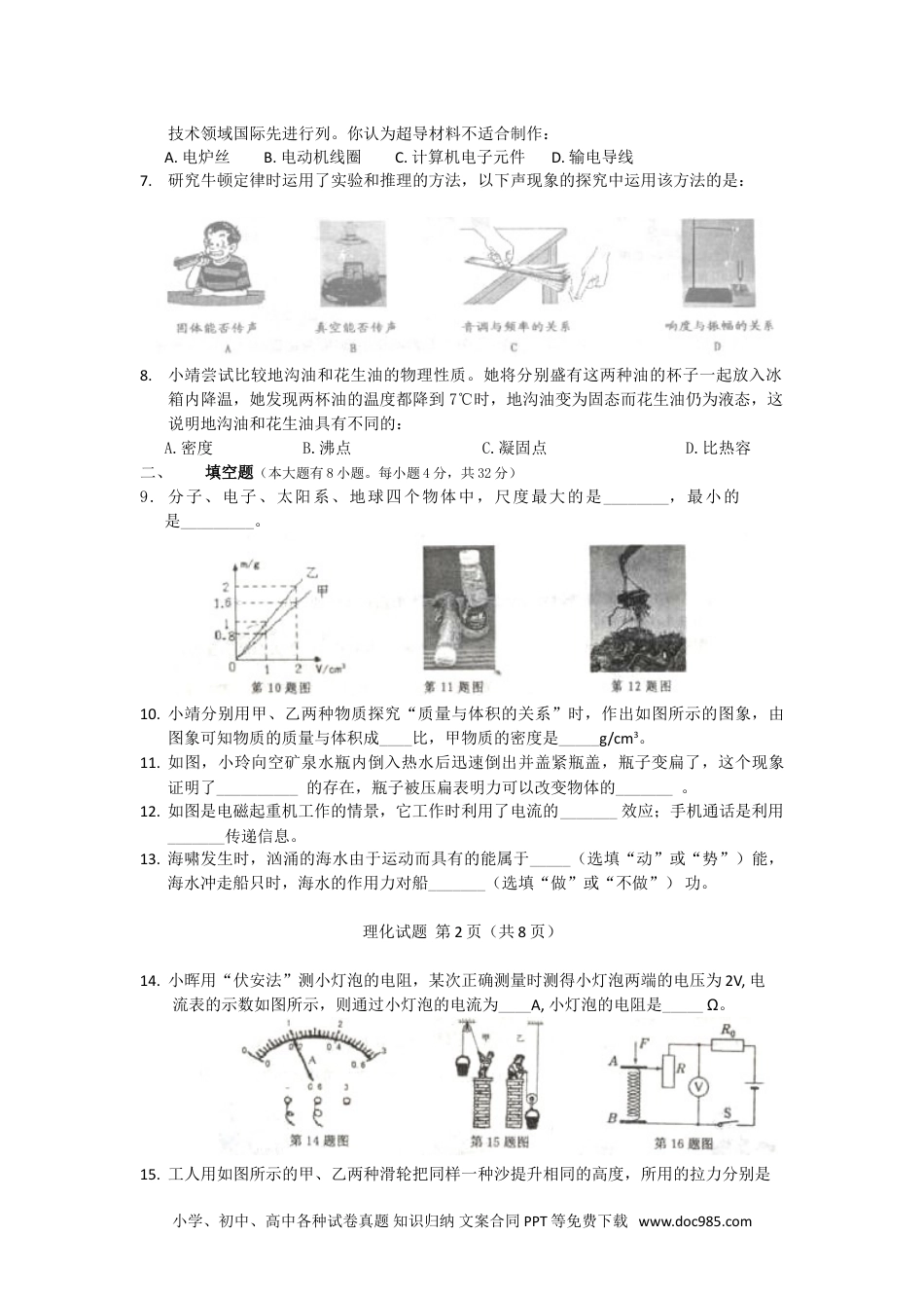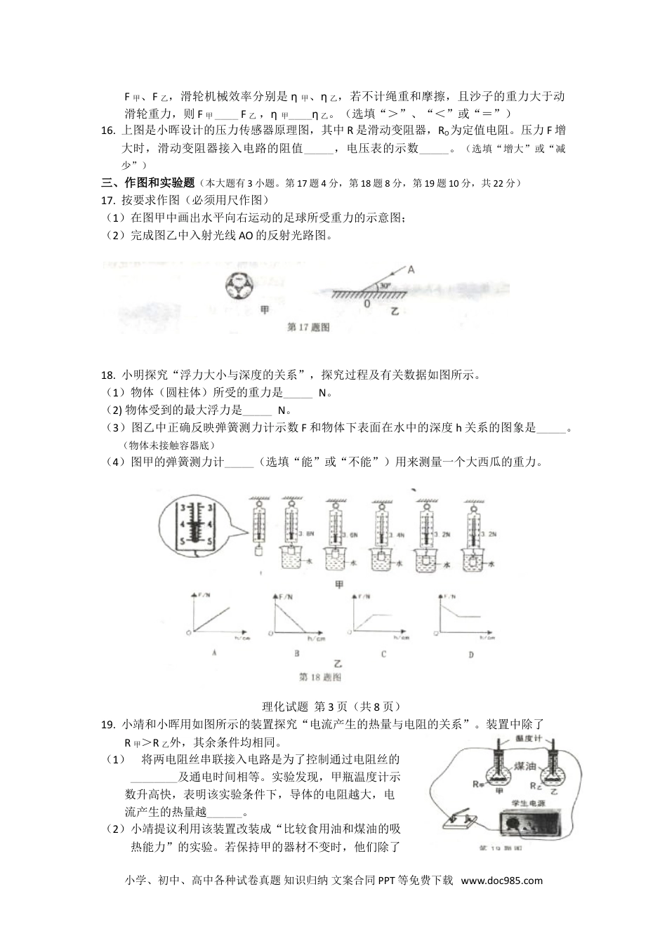 海南省2011年初中毕业生学业考试理化试题(物理、化学考试时间共130分钟)特别提醒:1.答案一律用黑色笔填写在答题卡上,写在试题上无效。2.答题前请认真阅读试题有关说明。3.要合理分配好答题时间。请沉着冷静,细心作答,祝你成功!第一部分物理科试题(满分110分)一、选择题(本大题有8小题,每小题只有一个选项符合题意。每小题4分,共32分)1.下列光现象中,由于光的直线传播形成的是:2.下列能源中属于不可再生能源的是:A.风能B.太阳能C.潮汐能D.石油3.天气由阴雨转为晴朗时室内的瓷砖地板和墙壁上有时会出现小水珠,即“回潮”现象。“回潮”时发生的物态变化是:A.汽化B.液化C.凝固D.升华4.端午节,小明给奶奶剥粽子时闻到粽子的香味,这个现象说明:A.分子间存在作用力B.分子间有空隙C.分子由原子组成D.分子在不停地运动5.如图所示的实例中,属于增大压强的是:理化试题第1页(共8页)6.上海交大研究团队于2011年初成功研发了百米级第二代高温超导带材,使我国跻身该小学、初中、高中各种试卷真题知识归纳文案合同PPT等免费下载www.doc985.com技术领域国际先进行列。你认为超导材料不适合制作:A.电炉丝B.电动机线圈C.计算机电子元件D.输电导线7.研究牛顿定律时运用了实验和推理的方法,以下声现象的探究中运用该方法的是:8.小靖尝试比较地沟油和花生油的物理性质。她将分别盛有这两种油的杯子一起放入冰箱内降温,她发现两杯油的温度都降到7℃时,地沟油变为固态而花生油仍为液态,这说明地沟油和花生油具有不同的:A.密度B.沸点C.凝固点D.比热容二、填空题(本大题有8小题。每小题4分,共32分)9.分子、电子、太阳系、地球四个物体中,尺度最大的是________,最小的是_________。10.小靖分别用甲、乙两种物质探究“质量与体积的关系”时,作出如图所示的图象,由图象可知物质的质量与体积成____比,甲物质的密度是_____g/cm3。11.如图,小玲向空矿泉水瓶内倒入热水后迅速倒出并盖紧瓶盖,瓶子变扁了,这个现象证明了__________的存在,瓶子被压扁表明力可以改变物体的_______。12.如图是电磁起重机工作的情景,它工作时利用了电流的_______效应;手机通话是利用_______传递信息。13.海啸发生时,汹涌的海水由于运动而具有的能属于_____(选填“动”或“势”)能,海水冲走船只时,海水的作用力对船_______(选填“做”或“不做”)功。理化试题第2页(共8页)14.小晖用“伏安法”测小灯泡的电阻,某次正确测量时测得小灯泡两端的电压为2V,电流表的示数如图所示,则通过小灯泡的电流为____A,小灯泡的电阻是_____Ω。15.工人用如图所示的甲、乙两种滑轮把同样一种沙提升相同的高度,所用的拉力分别是小学、初中、高中各种试卷真题知识归纳文案合同PPT等免费下载www.doc985.comF甲、F乙,滑轮机械效率分别是η甲、η乙,若不计绳重和摩擦,且沙子的重力大于动滑轮重力,则F甲____F乙,η甲____η乙。(选填“>”、“<”或“=”)16.上图是小晖设计的压力传感器原理图,其中R是滑动变阻器,RO为定值电阻。压力F增大时,滑动变阻器接入电路的阻值_____,电压表的示数_____。(选填“增大”或“减少”)三、作图和实验题(本大题有3小题。第17题4分,第18题8分,第19题10分,共22分)17.按要求作图(必须用尺作图)(1)在图甲中画出水平向右运动的足球所受重力的示意图;(2)完成图乙中入射光线AO的反射光路图。18.小明探究“浮力大小与深度的关系”,探究过程及有关数据如图所示。(1)物体(圆柱体)所受的重力是_____N。(2)物体受到的最大浮力是_____N。(3)图乙中正确反映弹簧测力计示数F和物体下表面在水中的深度h关系的图象是_____。(物体未接触容器底)(4)图甲的弹簧测力计_____(选填“能”或“不能”)用来测量一个大西瓜的重力。理化试题第3页(共8页)19.小靖和小晖用如图所示的装置探究“电流产生的热量与电阻的关系”。装置中除了R甲>R乙外,其余条件均相同。(1)将两电阻丝串联接入电路是为了控制通过电阻丝的________及通电时间相等。实验发现,甲瓶温度计示数升高快,表明该实验条件下,导体的电阻越大,电流产生的热量越______。(2)小靖...