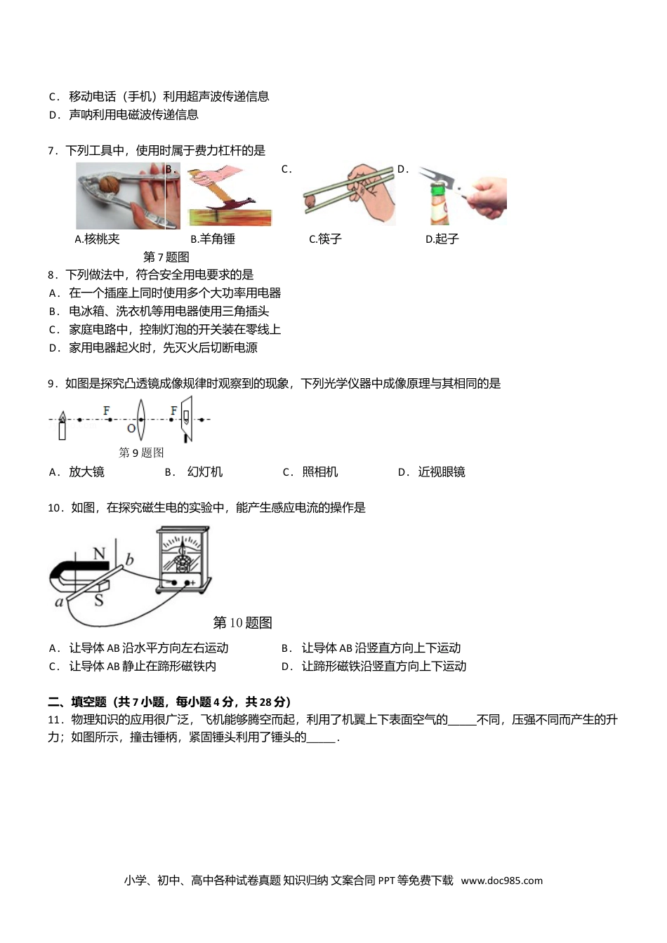 海南省2014年初中毕业生学业考试物理科试题特别提醒:1.请将答案写在答题卡上,写在试题纸上无效。2.请在考试前阅读考试的有关说明。3.请合理分配答题时间。一、选择题(共10小题,每小题3分,共30分)1.列能源中属于可再生能源的是A.石油B.天然气C.太阳能D.核能2.中考期间跳广场舞的阿姨为了减弱噪声,自觉把音响的音量调小,这种控制噪声的途径A.在声源处B.在传播过程中C.在人耳处D.在声源和人耳处3.下列物体中,通常情况下属于绝缘体的是A.铁线B.人体C.铅笔芯D.塑料尺4.内燃机工作时,将内能转化为机械能的冲程是A.吸气冲程B.压缩冲程C.排气冲程D.做功冲程5.下列现象中,由于光的折射形成的是A.小孩在平面镜中的像B.水中的筷子向上翘C.山羊的影子D.白鹭在水中的倒影第5题图6.下列关于新材料及信息传递的说法中,正确的是A.超导体主要用于制作电饭锅等电热器B.半导体可用来制作LED灯的发光二极管小学、初中、高中各种试卷真题知识归纳文案合同PPT等免费下载www.doc985.comC.移动电话(手机)利用超声波传递信息D.声呐利用电磁波传递信息7.下列工具中,使用时属于费力杠杆的是A.核桃夹B.B.羊角锤C.C.筷子D.D.起子第7题图8.下列做法中,符合安全用电要求的是A.在一个插座上同时使用多个大功率用电器B.电冰箱、洗衣机等用电器使用三角插头C.家庭电路中,控制灯泡的开关装在零线上D.家用电器起火时,先灭火后切断电源9.如图是探究凸透镜成像规律时观察到的现象,下列光学仪器中成像原理与其相同的是第9题图A.放大镜B.幻灯机C.照相机D.近视眼镜10.如图,在探究磁生电的实验中,能产生感应电流的操作是第10题图A.让导体AB沿水平方向左右运动B.让导体AB沿竖直方向上下运动C.让导体AB静止在蹄形磁铁内D.让蹄形磁铁沿竖直方向上下运动二、填空题(共7小题,每小题4分,共28分)11.物理知识的应用很广泛,飞机能够腾空而起,利用了机翼上下表面空气的不同,压强不同而产生的升力;如图所示,撞击锤柄,紧固锤头利用了锤头的.小学、初中、高中各种试卷真题知识归纳文案合同PPT等免费下载www.doc985.com第11题图第13题图12.小英参加体育测试,跳远时从起跳到上升至最高点的过程重力势能“”“”(选填逐渐增大或逐渐减小“”或不变),她800m跑步的成绩为4min,她的平均速度约为m/s(计算结果保留一位小数).13“”.小红在做探究水的沸腾实验时,绘制的水的温度随时间变化的图象如图所示,由图象可知:水的沸点为℃,由下表可知,实验中应选用测温物质为的温度计.14.今年我省加大规划建设湿地公园的力度,湿地能使周围环境昼夜的温差减小,是因为水的比热较;夏天,湿地能使气温降低,是因为水蒸发时需要“”“”(选填吸热或放热).15.如图所示,提沙子时,用质量较小的塑料桶代替铁桶后(其他条件不变)做的额外功,机械效率比用铁桶时“”“”(均选填增大或减小).16.甲、乙两只完全相同的杯子盛有浓度不同的盐水,将同一只鸡蛋先后放入其中,当鸡蛋静止时两液面相平,鸡蛋所处的位置如图所示,则鸡蛋在盐水中所受浮力F甲F乙,盐水对杯底的压强p甲p乙“”(均选填<、“”“>或=”).第16题图第17题图17.如图是小红尝试设计的体重仪原理图(R0为定值电阻,R为滑动变阻器),当被测体重增加时,电路中的电流,电压表的示数“”“”(均选填增大或减小).三、作图与实验题(第18题4分,第19题7分,第20题9分,共20分)18.按要求作图(作图时请用刻度尺)小学、初中、高中各种试卷真题知识归纳文案合同PPT等免费下载www.doc985.com测温物质凝固点/℃沸点/℃水银﹣39357酒精﹣11778(1)在图甲中画出静止在水平地面上的足球所受重力的示意图;(2)根据平面镜成像特点,在图乙中画出烛焰上A点在平面镜中所成的像A′.19.小东在做测量盐水密度的实验:(1)调节天平平衡时,若指针静止位置如图甲所示,则应将平衡螺母D向“”“”(选填左或右)调节.(2)小东的测量步骤如下:①往空烧杯倒入适量的盐水,测出烧杯和盐水的质量m1=48.2g;②将烧杯中的一部分盐水倒入量筒,读出量筒中盐水的体积V为20cm3;③测出烧杯和剩余盐...