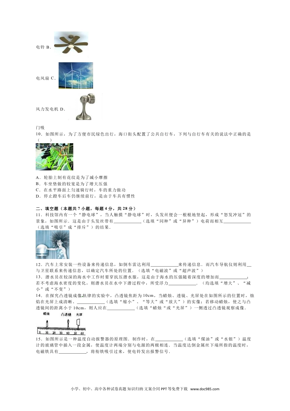 2016年海南省中考物理试卷一、选择题(本大题有10小题,每小题只有一个选项是正确的,每小题3分,共30分)1.我们现在使用的初中物理课本的宽度约为()A.18nmB.18mmC.18cmD.18dm2.编钟是我国春秋战国时期的打击乐器.用相同力度敲击大小不同的编钟时,发出的声音具有不同的()A.音调B.响度C.音色D.声速3.如图所示为一商场运行中的自动扶梯.某一顾客站在上行的自动扶梯上.当我们说该顾客“静止”时.所选的参照物是()A.顾客本身B.扶梯C.大楼地面D.随相邻扶梯下行的乘客4.水是一种重要的资源.具有一些奇特的性质,如水结成冰后体积会变大.水结成冰后下列物理量中没有发生变化的是()A.质量B.密度C.比热容D.内能5.如图所示.将重为G的铝块挂在弹簧测力计上,当它浸没在水中时,弹簧测力计的示数为F.则铝块所受的浮力大小为()A.GB.FC.G+FD.GF﹣6.从能量转换的角度看,一台四冲程内燃机在一个循环中,存在着机械能转化为内能过程的是()A.吸气冲程B.压缩冲程C.做功冲程D.排气冲程7.运动员站在地面用力竖直下抛乒乓球,球碰地后会弹跳到高于原抛球的位置.下列有关说法中正确的是()A.球开始下落时动能为零B.球弹跳到原抛球位置时仍具有动能C.球离地后的上升过程中势能转化为动能D.球在整个运动过程中机械能增加8.为了便于研究光现象,我们引入“光线”来描述光的传播路径和方向,下列研究问题的方法与此相同的是()A.通过磁感线来形象直观描述磁场的分布B.通过水流来初步认识电流C.通过观察温度计示数变化的大小来判断通电导体产生热量的多少D.通过选用两个完全相同的蜡烛来比较平面成像时像与物的大小关系9.如图所示的几种器件,工作时应用了电磁感应现象的是()A.小学、初中、高中各种试卷真题知识归纳文案合同PPT等免费下载www.doc985.com电铃B.电风扇C.风力发电机D.门吸10.如图所示,为了方便市民绿色出行,海口街头配置了公共自行车,下列与自行车有关的说法中正确的是()A.轮胎上制有花纹是为了减小摩擦B.车坐垫做的较宽是为了增大压强C.在水平路面上匀速骑行时,车的重力做功D.停止蹬车后车仍继续前行,是由于车具有惯性二、填空题(本题共7小题,每题4分,共28分)11.科技馆内有一个“静电球”,当人触摸“静电球”时,头发丝便会一根根地竖起,形成“怒发冲冠”的景象,如图所示.这是由于头发丝带有(选填“同种”或“异种”)电荷而相互(选填“吸引”成“排斥”)的结果.12.汽车上常安装一些设备来传递信息,如倒车雷达利用来传递信息.而汽车导航仪则利用与卫星联系来传递信息,以确定汽车所处的位置.(选填“电磁波”或“超声波”)13.潜水员在较深的海水中工作时要穿抗压潜水服,这是由于海水的压强随着深度的增加而;若不考虑海水密度的变化,则潜水员在水中下潜过程中,所受浮力.(均选填“增大”、“减小”或“不变”)14.在探究凸透镜成像轨律的实验中,凸透镜焦距为10cm,当蜡烛、透镜、光屏处在如图所示的位置时,烛焰在光屏上成清晰、(选填“缩小”、“等大”或“放大”)的实像;若移动蜡烛,使之与凸透镜间的距离小于10cm,则人应在(选填“蜡烛“或“光屏”)一侧透过凸透镜观察成像.15.如图所示是一种温度自动报警器的原理图.制作时,在(选填“煤油”或“水银”)温度计的玻璃管中插入一段金属,使温度计两端分别与电源的两极相连.当温度达倒金属丝下端所指的温度时,电磁铁具有,将衔铁吸引过来,使电铃发出报警信号.小学、初中、高中各种试卷真题知识归纳文案合同PPT等免费下载www.doc985.com16.如图所示,工人通过动滑轮把50kg的水泥从地面缓慢提升到4m高的楼顶,所用拉力为300N,此过程中机械所做的有用功为J,机械效率约为.(g取10N/kg)17.一电热水壶的铭牌上标有“220V2000W”字样,在额定电压下用它对质量为2kg的水加热,使水的温度升高50℃,用时6min.则水吸收的热量为J,此过程中电热水壶消耗的电能为kW•h,(C水=4.2×103J/(kg•℃)三、作图和实验题(第18题4分,第19题6分,第20题10分,共20分)18.按照要求规范作图(作图时请用刻度尺).(1)图甲为...