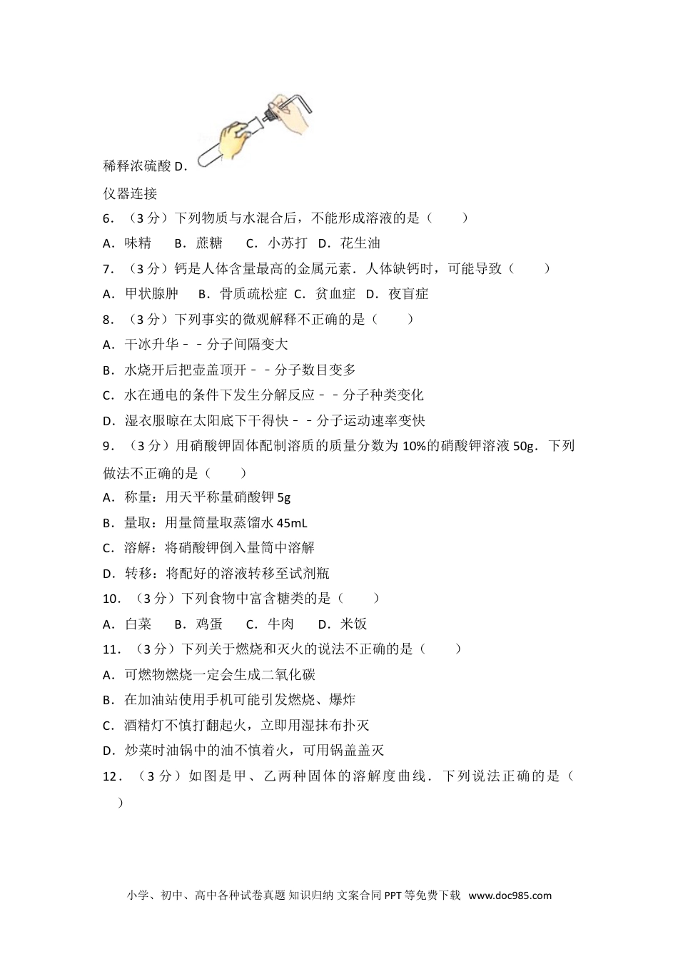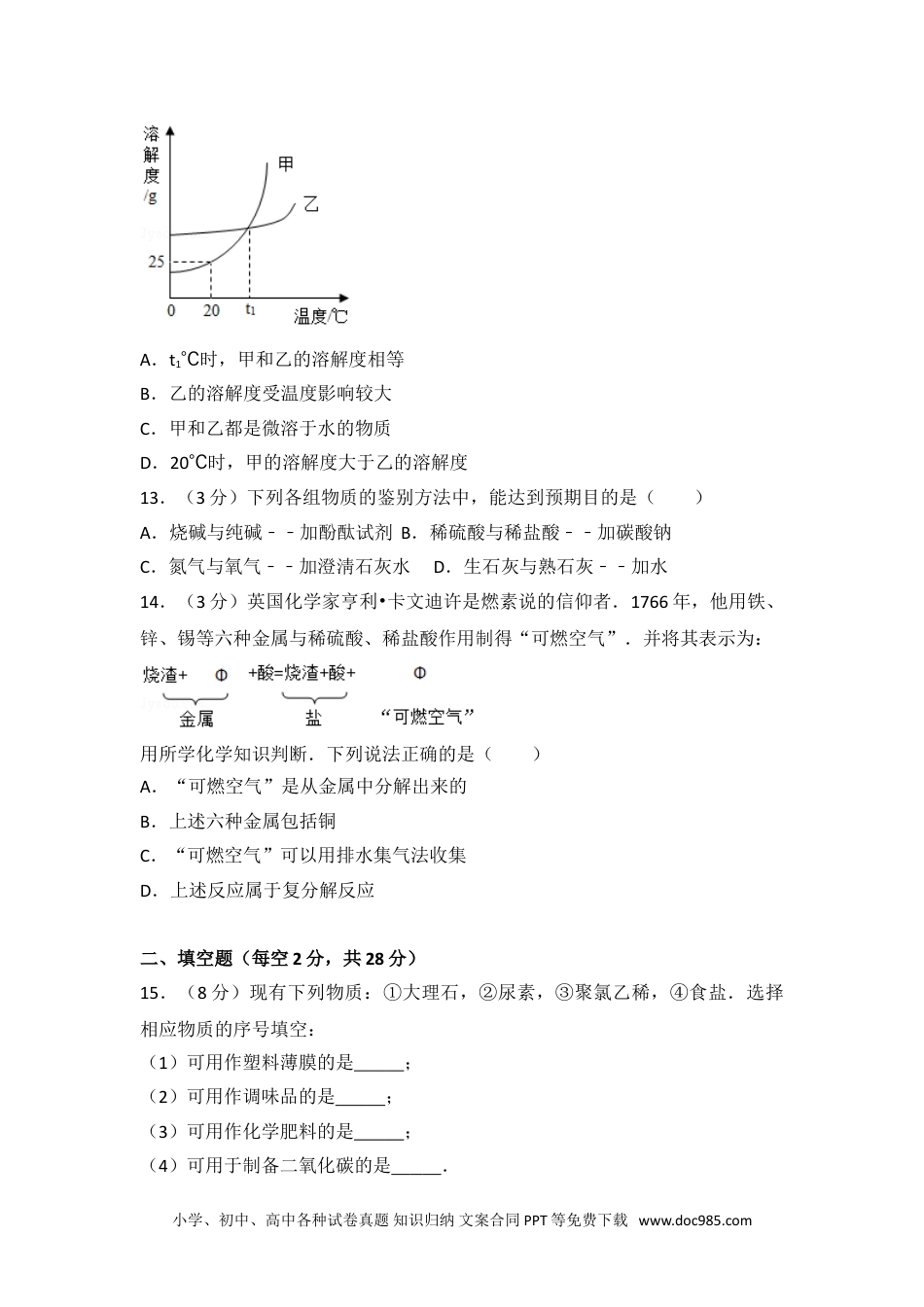 2017年海南省中考化学试卷一、选择题(本大题共14小题,每小题只有1个选项符合题意.每小题3分,共42分)1.(3分)下列标志表示可回收利用的是()A.B.C.D.2.(3分)下列物质属于纯净物的是()A.空气B.生铁C.蒸馏水D.浓盐酸3.(3分)下列属于化学变化的是()A.瓷碗破碎B.钢铁生锈C.汽油挥发D.冰雪融化4.(3分)葡萄糖(C6Hl2O6)属于()A.有机物B.氧化物C.酸D.碱5.(3分)下列实验操作不正确的是()A.铁丝燃烧B.倾倒液体C.小学、初中、高中各种试卷真题知识归纳文案合同PPT等免费下载www.doc985.com稀释浓硫酸D.仪器连接6.(3分)下列物质与水混合后,不能形成溶液的是()A.味精B.蔗糖C.小苏打D.花生油7.(3分)钙是人体含量最高的金属元素.人体缺钙时,可能导致()A.甲状腺肿B.骨质疏松症C.贫血症D.夜盲症8.(3分)下列事实的微观解释不正确的是()A.干冰升华﹣﹣分子间隔变大B.水烧开后把壶盖顶开﹣﹣分子数目变多C.水在通电的条件下发生分解反应﹣﹣分子种类变化D.湿衣服晾在太阳底下干得快﹣﹣分子运动速率变快9.(3分)用硝酸钾固体配制溶质的质量分数为10%的硝酸钾溶液50g.下列做法不正确的是()A.称量:用天平称量硝酸钾5gB.量取:用量筒量取蒸馏水45mLC.溶解:将硝酸钾倒入量筒中溶解D.转移:将配好的溶液转移至试剂瓶10.(3分)下列食物中富含糖类的是()A.白菜B.鸡蛋C.牛肉D.米饭11.(3分)下列关于燃烧和灭火的说法不正确的是()A.可燃物燃烧一定会生成二氧化碳B.在加油站使用手机可能引发燃烧、爆炸C.酒精灯不慎打翻起火,立即用湿抹布扑灭D.炒菜时油锅中的油不慎着火,可用锅盖盖灭12.(3分)如图是甲、乙两种固体的溶解度曲线.下列说法正确的是()小学、初中、高中各种试卷真题知识归纳文案合同PPT等免费下载www.doc985.comA.t1℃时,甲和乙的溶解度相等B.乙的溶解度受温度影响较大C.甲和乙都是微溶于水的物质D.20℃时,甲的溶解度大于乙的溶解度13.(3分)下列各组物质的鉴别方法中,能达到预期目的是()A.烧碱与纯碱﹣﹣加酚酞试剂B.稀硫酸与稀盐酸﹣﹣加碳酸钠C.氮气与氧气﹣﹣加澄淸石灰水D.生石灰与熟石灰﹣﹣加水14.(3分)英国化学家亨利•卡文迪许是燃素说的信仰者.1766年,他用铁、锌、锡等六种金属与稀硫酸、稀盐酸作用制得“可燃空气”.并将其表示为:用所学化学知识判断.下列说法正确的是()A.“可燃空气”是从金属中分解出来的B.上述六种金属包括铜C.“可燃空气”可以用排水集气法收集D.上述反应属于复分解反应二、填空题(每空2分,共28分)15.(8分)现有下列物质:①大理石,②尿素,③聚氯乙稀,④食盐.选择相应物质的序号填空:(1)可用作塑料薄膜的是;(2)可用作调味品的是;(3)可用作化学肥料的是;(4)可用于制备二氧化碳的是.小学、初中、高中各种试卷真题知识归纳文案合同PPT等免费下载www.doc985.com16.(6分)如图是元素周期表中部分元素的相关信息.请回答:(1)磷元素的相对原子质量是;(2)这六种元素中,有些能相互结合形成大气的主要污染物,其中一种的化学式为;(3)査阅资料得知,周期表中同一纵行的元素性质相似.由此推测SiO2与NaOH溶液反应的化学方程式为.17.(6分)自来水厂净水过程示意图如图.请回答:(1)除去水中固态杂质的设备是(填正确选项前的字母)A.过滤池B.吸附池C.清水池(2)通常向清水池投放高铁酸钠(化学式为Na2FeO4)杀菌消毒,高铁酸钠中铁元素的化合价为;(3)我国有关部门规定,经上述流程净化后进入用户的饮用水含铁<0.3mg•L﹣1,含铜<1.0mg•L1﹣,….其中的“铁、铜”指的是(填正确选项前的字母).A.原子B.分子C.元素.18.(8分)人类对材料的发现和使用经历了从石器、青铜器、铁器到铝的大规模使用等漫长的征程.请回答:(1)我国最早使用的合金是;(2)我国是最早采用湿法冶铜的国家.文献记载“胆铜法”:用铁与“胆水”(含CuSO4)反应获得铜.铁与硫酸铜溶液反应的化学方程式为;(3)下列金属矿物中,可以用来炼铁的是(填正确选项前的字母);小学、初中、高中各种...