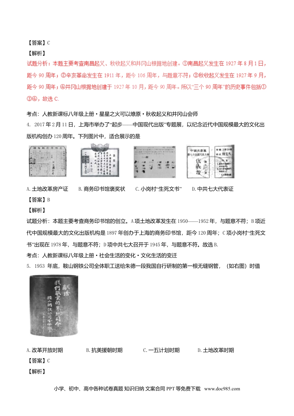 海南省2017年初中毕业生学业水平考试历史试题(考试时间:60分钟满分:100分)一、选择题(本大题有20小题,每小题四个选项中只有一项正确,每小题3分,共60分)1.——右图是近年来我省考古的重大发现三亚海棠湾的英墩遗址贝壳堆积。据考证,此遗址距今约有6000年。同一时期,黄河流域的农耕文化遗址是A.元谋人遗址B.周口店遗址C.半坡遗址D.河姆渡遗址【答案】C【解析】考点:人教新课标七年级上册·原始的农耕生活·半坡原始居民的生活2.“……”吾为官择人,唯才是与,苟或不才,虽亲不用如其有才,虽仇不弃,反映了唐太宗A.勤于政事B.善于纳谏C.节俭治国D.唯才是用【答案】D【解析】试题分析:本题主要考查贞观之治相关知识,解答此题关键在于对题干材料的准确解读。“吾为官择人,唯才是与”反映了唐太宗——的用人理念唯才是用,与勤于政事、善于纳谏、节俭治国无关,故选D.考点:人教新课标七年级下册·贞观之治·“”贞观之治3.“不久前,三个90”“周年系列发布会在江西省南昌市举行,拉开了新一轮追寻红色记忆活动的序幕。三个90”周年的历史事件包括①南昌起义②辛亥革命③秋收起义④井冈山根据地创建A.①②③B.①②④C.①③④D.②③④小学、初中、高中各种试卷真题知识归纳文案合同PPT等免费下载www.doc985.com【答案】C【解析】考点:人教新课标八年级上册·星星之火可以燎原·秋收起义和井冈山会师4.2017年2月11“——”日,上海市举办了起步中国现代出版专题展,以纪念近代中国规模最大的文化出版机构创办120周年。下列图片中,适合展示的是A.土地改革房产证B.商务印书馆褒奖状C.“”小岗村生死文书D.中共七大代表证【答案】B【解析】试题分析:本题主要考查商务印书馆的创立。A项土地改革发生在1950——1952年,与题意不符;B项近代中国规模最大的文化出版机构是1897年创办于上海的商务印书馆,距今120周年;C项“小岗村生死文”书出现在1978年,与题意不符;D项中共七大召开于1945年,与题意不符。故选B.考点:人教新课标八年级上册·社会生活的变化·文化生活的变迁5.1953年底,鞍山钢铁公司全体职工送给朱德一段我国自行研制的第一根无缝钢管,(如右图)时值A.改革开放时期B.抗美援朝时期C.一五计划时期D.土地改革时期【答案】C【解析】小学、初中、高中各种试卷真题知识归纳文案合同PPT等免费下载www.doc985.com试题分析:本题主要考查一五计划相关知识。1953——1956年我国制定实施了一五计划,1953年底,鞍山钢铁公司大型轧钢厂等三大工程建成投产,与题意相符;ABD项不符合题意。故选C.考点:人教新课标八年级下册·工业化起步·第一个五年计划6.社会发展需要正能量。王进喜、焦裕禄、邓稼先等人身上体现出的时代精神是A.国际主义B.无私奉献C.救亡图存D.居安思危【答案】B【解析】试题分析:本题主要考查艰苦创业年代的模范人物。王进喜、焦裕禄、邓稼先都是我国社会主义建设探索时期的模范人物,他们身上的精神更多的是体现自力更生、艰苦创业、无私奉献的精神,ACD项与当时的时代背景不符。故选B.考点:人教新课标八年级下册·探索社会主义道路·建设成就和模范人物7.我国重视发展睦邻友好关系。1954年,周恩来出访印度、缅甸,三国总理共同倡导了A.和平共处五项原则B.和平统一八项主张C.独立自主和平外交D“”.求同存异方针【答案】A【解析】考点:人教新课标八年级下册·外交事业的发展·和平共处五项原则8.“”“”香港回归前,美国《财富》杂志曾以香港之死为题,唱衰香港。然而,从1997年到2016年,香港本地生产总值由1.37万亿港元增至2.49万亿港元,香港依然是全球最富裕经济体之一,这充分说明了A.“”一国两制的正确性B.香港是中国的领土C.民族区域自治的优越性D.西方媒体狼子野心【答案】A【解析】试题分析:本题主要考查香港的回归相关知识。根据所学知识可知,1997年7月1日依据“”一国两制方针,我国恢复对香港地区行使主权,从1997年到2016年本地生产总值有了很大增长,“这充分说明了一国两”制的正确性。BCD项与题意不符。故选A.小学、初中、高中各种试卷真题知识归纳文案合同PPT等免费下载www.doc985.com考点:人教新课标八年级下...