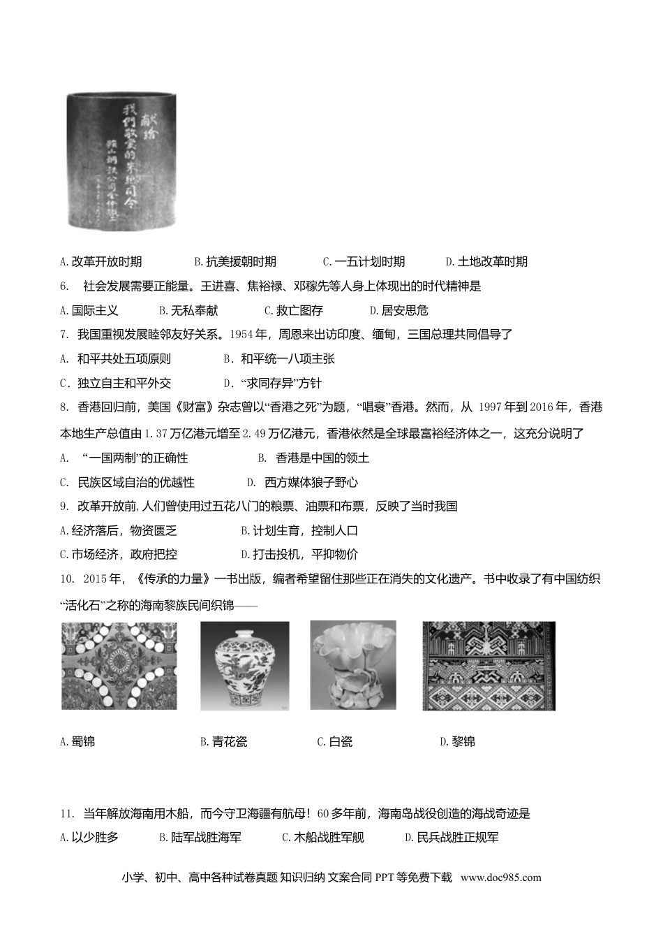 海南省2017年初中毕业生学业水平考试历史试题(考试时间:60分钟满分:100分)一、选择题(本大题有20小题,每小题四个选项中只有一项正确,每小题3分,共60分)1.——右图是近年来我省考古的重大发现三亚海棠湾的英墩遗址贝壳堆积。据考证,此遗址距今约有6000年。同一时期,黄河流域的农耕文化遗址是A.元谋人遗址B.周口店遗址C.半坡遗址D.河姆渡遗址2.“……”吾为官择人,唯才是与,苟或不才,虽亲不用如其有才,虽仇不弃,反映了唐太宗A.勤于政事B.善于纳谏C.节俭治国D.唯才是用3.“不久前,三个90”“周年系列发布会在江西省南昌市举行,拉开了新一轮追寻红色记忆活动的序幕。三个90”周年的历史事件包括①南昌起义②辛亥革命③秋收起义④井冈山根据地创建A.①②③B.①②④C.①③④D.②③④4.2017年2月11“——”日,上海市举办了起步中国现代出版专题展,以纪念近代中国规模最大的文化出版机构创办120周年。下列图片中,适合展示的是A.土地改革房产证B.商务印书馆褒奖状C.“”小岗村生死文书D.中共七大代表证5.1953年底,鞍山钢铁公司全体职工送给朱德一段我国自行研制的第一根无缝钢管,(如右图)时值小学、初中、高中各种试卷真题知识归纳文案合同PPT等免费下载www.doc985.comA.改革开放时期B.抗美援朝时期C.一五计划时期D.土地改革时期6.社会发展需要正能量。王进喜、焦裕禄、邓稼先等人身上体现出的时代精神是A.国际主义B.无私奉献C.救亡图存D.居安思危7.我国重视发展睦邻友好关系。1954年,周恩来出访印度、缅甸,三国总理共同倡导了A.和平共处五项原则B.和平统一八项主张C.独立自主和平外交D“”.求同存异方针8.“”“”香港回归前,美国《财富》杂志曾以香港之死为题,唱衰香港。然而,从1997年到2016年,香港本地生产总值由1.37万亿港元增至2.49万亿港元,香港依然是全球最富裕经济体之一,这充分说明了A.“”一国两制的正确性B.香港是中国的领土C.民族区域自治的优越性D.西方媒体狼子野心9.改革开放前,人们曾使用过五花八门的粮票、油票和布票,反映了当时我国A.经济落后,物资匮乏B.计划生育,控制人口C.市场经济,政府把控D.打击投机,平抑物价10.2015年,《传承的力量》一书出版,编者希望留住那些正在消失的文化遗产。书中收录了有中国纺织“”——活化石之称的海南黎族民间织锦A.蜀锦B.青花瓷C.白瓷D.黎锦11.当年解放海南用木船,而今守卫海疆有航母!60多年前,海南岛战役创造的海战奇迹是A.以少胜多B.陆军战胜海军C.木船战胜军舰D.民兵战胜正规军小学、初中、高中各种试卷真题知识归纳文案合同PPT等免费下载www.doc985.com12.“”西方有句谚语:人类惧怕时间,时间惧怕金字塔。创造金字塔的国度是A.中国B.古巴比伦C.古印度D.古埃及13.江山代有人才出。凯撒被刺后,屋大维迅速崛起,于公元前27年建立了A.雅典共和国B.罗马共和国C.罗马帝国D.迦太基王国14.近日,印度电影《摔跤吧!爸爸》火爆荧幕。片中导演肯定女性的才能,呼吁男女平等。早在160年“”前,印度的巾帼英雄章西女王不让须眉,参与领导了A.拉美独立运动B.印度民族大起义C.北美独立战争D.太平天国运动15.失聪并没有使他倒下,他扼住了命运的咽喉,让后人从《命运交响曲》中感受到生命的成长,在《英雄交响曲》中聆听到正义的力量。他是A.达利B.贝多芬C.梵高D.毕加索16.“斯塔夫里阿诺斯认为,在1917”年,第一次世界大战从欧洲阶段转变到全球阶段,其主要依据除了当年美国参战外,还有俄国发生了A.工业化运动B.十月革命C.八一九事件D.废除农奴制改革17.20世纪30年代的经济大危机使资本主义世界工业生产下降1/3以上,贸易总额缩减2/3。可见,这场大危机A.破坏特别大B.范围特别广C.时间特别长D.伤亡特别多18.与二战中相比,战后美苏关系发生了重大变化,(如下图)其开始标志是A.杜鲁门主义出台B.华约组织成立C.北约组织建立D.马歇尔计划实施19.20世纪五六十年代,丧失优势地位的欧洲国家在美苏争霸的夹缝中生存,为此,他们开始A.走向联合B.分庭抗礼C.追随美国D.倒向苏联20.有学者指出:20世纪50“”年代的全球化只是经济半球化,只有20世纪八九十年代的世界经济才真正具有全球性。下列事...