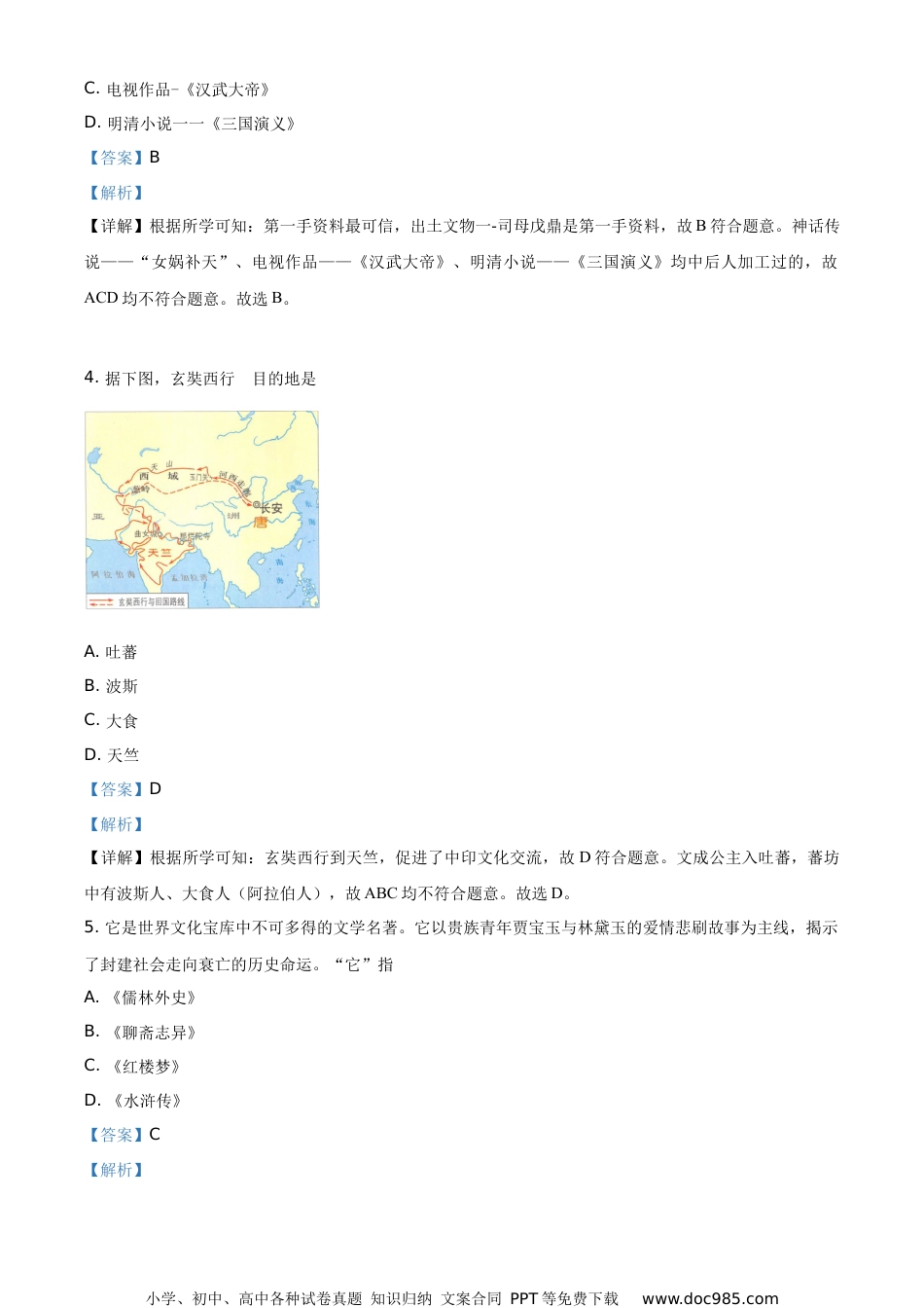 小学、初中、高中各种试卷真题知识归纳文案合同PPT等免费下载www.doc985.com2019年海南省中考历史试题吴涛整理(考试时间:60分钟,满分:100分)一、选择题(本大题有20小题,每小题四个选项中只有一个正确。每小题3分,共60分)1.相传,神农氏遍尝百草,还“制耒耜,教民农作”。这一传说反映了A.农业的起源B.手工业兴起C.商业的发展D.畜牧业繁荣【答案】A【解析】【详解】根据所学可知:“耒耜,农作”,这是农业的起源,故A符合题意。原始社会中,陶器是手工业;原始社会还没有商业;牛羊是畜牧业,故BCD均不符合题意。故选A。【点睛】耒耜是农业生产工具。2.下图记录的是北魏孝文帝改革的汉化措施。这些措施A.结束了南北分裂B.削弱了北魏实力C.促进了民族交融D.加强了君主专制【答案】C【解析】【详解】根据所学可知:鲜卑族向汉族学,这是民族交融,故C符合题意。题干是从民族交融的角度,结束了南北分裂、削弱了北魏实力、加强了君主专制均不是这个角度,故ABD均不符合题意。故选C。3.历史研究中,下列选项最可信的当属A.神话传说一-“女娲补天”B.出土文物一-司母戊鼎小学、初中、高中各种试卷真题知识归纳文案合同PPT等免费下载www.doc985.comC.电视作品-《汉武大帝》D.明清小说一一《三国演义》【答案】B【解析】【详解】根据所学可知:第一手资料最可信,出土文物一-司母戊鼎是第一手资料,故B符合题意。神话传说——“女娲补天”、电视作品——《汉武大帝》、明清小说——《三国演义》均中后人加工过的,故ACD均不符合题意。故选B。4.据下图,玄奘西行的目的地是A.吐蕃B.波斯C.大食D.天竺【答案】D【解析】【详解】根据所学可知:玄奘西行到天竺,促进了中印文化交流,故D符合题意。文成公主入吐蕃,蕃坊中有波斯人、大食人(阿拉伯人),故ABC均不符合题意。故选D。5.它是世界文化宝库中不可多得的文学名著。它以贵族青年贾宝玉与林黛玉的爱情悲刷故事为主线,揭示了封建社会走向衰亡的历史命运。“它”指A.《儒林外史》B.《聊斋志异》C.《红楼梦》D.《水浒传》【答案】C【解析】小学、初中、高中各种试卷真题知识归纳文案合同PPT等免费下载www.doc985.com【详解】根据所学可知:《红楼梦》是文学名著,以贵族青年贾宝玉与林黛玉的爱情悲刷故事为主线,揭示了封建社会走向衰亡的历史命运,故C符合题意。《儒林外史》代表着中国古代讽刺小说的高峰,它开创了以小说直接评价现实生活的范例;《聊斋志异》结构布局严谨巧妙,文笔简练,描写细腻,堪称文言短篇小说的巅峰之作;《水浒传》是中国历史上最早用白话文写成的章回小说之一,在社会上产生了巨大的影响,成了后世中国小说创作的典范,故ABD均不符合题意。故选C。6.“天父天兄手段高,打得清兵四处跑,拿下南京立天国,旗开得胜万民笑。”与歌谣相关的史实为A.太平天国运动B.洋务运动C.维新变法运动D.义和团运动【答案】A【解析】【详解】根据所学可知:太平天国运动中,定都南京,称天京,故A符合题意。洋务运动是清朝的自救运动,维新变法运动要实现君主立宪,义和团运动是扶清的,故BCD均不符合题意。故选A。7.下图所示是五四运动的A.背景B.过程C.结果D.影响【答案】A【解析】【详解】根据所学可知:图片中有“巴黎和会”,巴黎和会上中国外交的失败引发了五四运动,故A符合题意,BCD均不符合题意。故选A。8.人民群众是创造历史的主体。杰出人物在历史的长河中谱写了浓墨重彩的篇章。下列搭配正确的一组为A.林则徐——“实业救国”的践行者B.邓世昌-“开眼看世界之第一人”C.张謇一一甲午中日战争中的民族英雄小学、初中、高中各种试卷真题知识归纳文案合同PPT等免费下载www.doc985.comD.李大钊一-马克思主义思想传播的先驱【答案】D【解析】【详解】根据所学可知:新文化运动中,李大钊首先介绍了马克思主义,他是马克思主义思想传播的先驱,故D符合题意。林则徐——“开眼看世界之第一人”,邓世昌——甲午中日战争中的民族英雄,张謇——“实业救国”的践行者,故ABC均不符合题意。故选D。9.读下图,农民生活水平提高主要得益于A.土地改革B.农业合作化C.人民公社化运动D.家庭联产承包责任制【答案】D【解析...