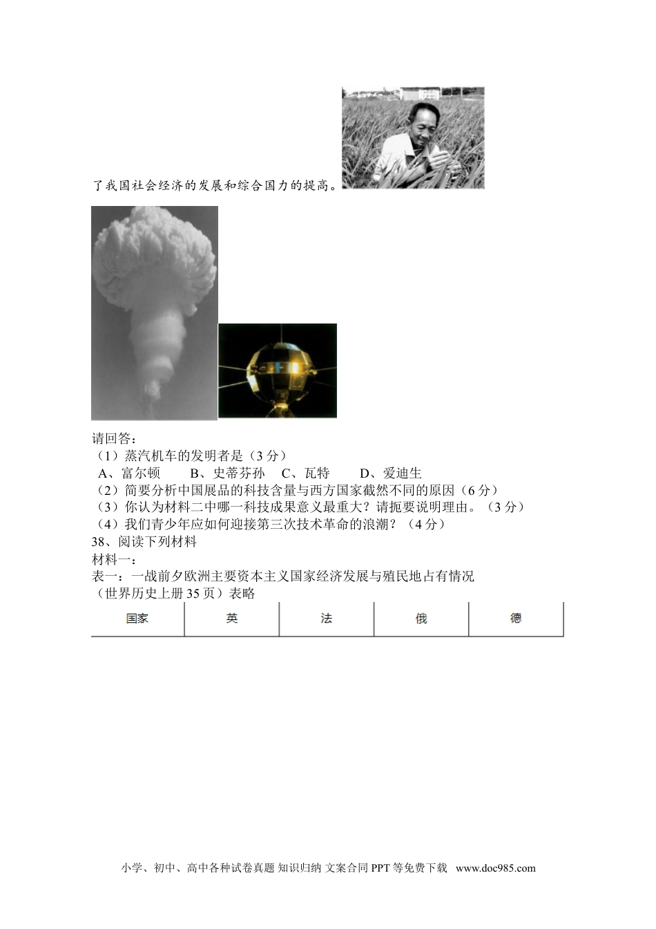 2008年海南省历史学科中考试卷第二部分历史试题(满分110分)五、选择题(本大题有16小题,每小题四个选项,只有一项正确。每小题3分,共48分)21、中华文明以农耕文化为基础。最能体现半坡原始农耕文化成就的是A、粟的种植B、水稻的种植C、陶器的炼制D、玉器的加工22、“512”汶川大地震使无数建筑垮塌,但一座有着2000多年历史的大型水利工程却经受了大地震的考验。它是A、灵渠B、都江堰C、大运河D、“三星堆”青铜文化遗址23、描绘了宋代万千气象社会生活的名画是24、近代中国屡遭列强侵略,被控签订一系列不丧权辱国的条约。其中使中国完全沦为半殖民地半封建社会的是A、《南京条约》B、《北京条约》C《马关条约》D《辛丑条约》25、井冈山有“天下第一山”的美称,主要是由于中国共产党在井冈山A、建立了第一个农村革命根据地B、打响了武装反抗国民党反动统治的第一枪C、建立了第一个抗日根据地D、召开了长征途中的第一次重要会议26、创作于抗日战争时期,反映中华民族不屈的抗争精神,后来被确定为新中国国歌的是A、《大刀进行曲》B、《黄河大合唱》C、《义勇军进行曲》D、《中国人民志愿军战歌》27、作为改革开放的前沿阵地,广东最早开放的沿海城市有:①深圳②珠海③汕头④厦门A、①②③B、②③④C、①②④D、①②③④28、右边塑像纪念的是海南历史上致力于维护祖国统一、促进民族团结的巾帼英雄(暂缺图)A、黄道婆B、冼夫人C、庞琼花D、冯白驹小学、初中、高中各种试卷真题知识归纳文案合同PPT等免费下载www.doc985.com29、2008年4月26日,我省各地张灯结彩,夜空中绽放璀璨的焰火,人们兴高采烈。这是庆祝A、世界小姐大赛圆满闭幕B、博鳌亚洲论坛成功举办C、建省办特区20周年D、海南岛解放55周年30、现代奥运会起源于西方文明的摇篮A、古埃及B、古巴比伦C、古罗马D、古希腊31、下列内容不能体现古代东西方文化交流的是A、丝绸之路B、阿拉伯数字C《马可波罗行记》D《蒙娜丽莎》32、俄国1861年改革和日本明治维新的相同点是A、推翻了旧的封建政权B、废除了农奴制C、由资产阶级领导D、有利于资本主义发展33、右图中舰艇曾参加过A、俄国十月革命B、偷袭珍珠港C、诺曼底登陆D、甲午海战34、推动美国、法国资产阶级革命爆发,为新兴资产阶级在政治上取代封建贵族提供有力支持的是A、人文主义B、启蒙思想C、马克思主义D、相对论35、决定成立联合国的国际会议是A、1919年巴黎和会B、1938年幕尼黑会议C、1945年雅尔塔会议D、1921年华盛顿会议36、二战后,中东地区战火仍频。引发第一次中东战争的是A、埃及收回运河B、以色列建国C、伊拉克入侵科威特D、巴勒斯坦宣布独立六、材料分析题(本大题有2小题,37小题16分,38小题15分,共31分)37、阅读下列材料材料一:1876年美国费城举办国际博览会。英国展出最样的蒸汽机车、美国展出大功率电动机和发电机,德国展出加工枪炮的精密机床,中国展出茶叶、丝绸、银器和小脚乡花鞋等手工产品。材料二:新中国成立50年来,取得一系列重大科技成果(如右图),有力促进小学、初中、高中各种试卷真题知识归纳文案合同PPT等免费下载www.doc985.com了我国社会经济的发展和综合国力的提高。请回答:(1)蒸汽机车的发明者是(3分)A、富尔顿B、史蒂芬孙C、瓦特D、爱迪生(2)简要分析中国展品的科技含量与西方国家截然不同的原因(6分)(3)你认为材料二中哪一科技成果意义最重大?请扼要说明理由。(3分)(4)我们青少年应如何迎接第三次技术革命的浪潮?(4分)38、阅读下列材料材料一:表一:一战前夕欧洲主要资本主义国家经济发展与殖民地占有情况(世界历史上册35页)表略小学、初中、高中各种试卷真题知识归纳文案合同PPT等免费下载www.doc985.com表二:欧洲列强扩军备战比较(阅读世界历史上册36页文字与图)图表略材料二:8月4日,德国政府声称:“战争会迅速结束……”在运送德军的火车上涂写着“去巴黎吃早饭……”的字句。法国的运兵车上也涂有藐视对方的字句和“对圣诞节回家”的口号。新招募的法国士兵高唱《马赛曲》,兴高采烈地从火车站出发,“枪尖上插着鲜花”,脸上露着微笑,似乎把这次军事行动当作“从巴黎到柏林令人振奋...