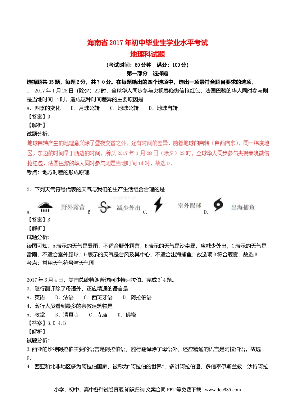 海南省2017年初中毕业生学业水平考试地理科试题(考试时间:60分钟满分:100分)第一部分选择题选择题共35题,每题2分,共70分。在每题给出的四个选项中,选出一项最符合题目要求的选项。1.2017年1月28日(除夕)22时,全球华人同步参与央视春晚微信抢红包,法国巴黎的华人同时参与则是当地时间14时,造成这种时间差异的主要原因是A.四季的变化B.月球公转C.地球公转D.地球自转【答案】D【解析】试题分析:考点:地方时差的形成原理.2.下列天气符号代表的天气与我们的生产生活组合合理的是A.B.C.D.【答案】B【解析】试题分析:读图可知:A表示的天气是暴雨,不适合野外露营;B表示的天气是沙尘暴,应减少外出;C表示的天气是雷雨,不适合室外踢球;D表示的天气是台风及其中心,不适合出海捕鱼;故选项B符合题意,故选B.考点:常用天气符号与天气图.2017年6月4日,美国总统特朗普访问沙特阿拉伯。完成3~4题。3.随行翻译除了母语外,还应精通的语言是A.英语B.法语C.西班牙语D.阿拉伯语4.随行人员看到最多的宗教建筑物是A.教堂B.清真寺C.寺庙D.佛塔【答案】3.D4.B【解析】试题分析:3.西亚的沙特阿拉伯主要的语言是阿拉伯语,随行翻译除了母语外,还应精通的语言是阿拉伯语,故选D.4.“”西亚和北非地区多为阿拉伯国家,被称为阿拉伯的世界,多讲阿拉伯语,多信奉伊斯兰教.沙特阿拉小学、初中、高中各种试卷真题知识归纳文案合同PPT等免费下载www.doc985.com伯位于西亚地区,多为阿拉伯民族,普遍信仰伊斯兰教,伊斯兰教的典型宗教建筑是清真寺,故选B.考点:世界主要语言及其分布地区.5.下列事实能证明海陆变迁的是A.太阳东升西落B.四季变化C.钱塘江的潮涨潮落D.台湾海峡的形成【答案】D【解析】试题分析:考点:海陆变迁.6.快递包装产生大量的包装纸、不可降解的胶带和塑料袋,由此带来的环境污染问题日益突出,下列做法能减少该问题的是①适度包装②用可降解的胶带和塑料袋包装③分类回收④随意使用包装盒A.①②③B.②③④C.①③④D.①②④【答案】A【解析】试题分析:快递包装产生大量的包装纸、不可降解的胶带和塑料袋,由此带来的环境污染问题日益突出,能减少该问题的是:①适度包装,②用可降解的胶带和塑料袋包装,③分类回收;④随意使用包装盒会造成环境污染,还浪费资源;故选项A符合题意,故选A.考点:爱护环境与保护自然资源的重要性.读美国本土图(图2),完成7~8题。小学、初中、高中各种试卷真题知识归纳文案合同PPT等免费下载www.doc985.com7.图2中阴影部分表示的农业带是A.乳畜带B.小麦区C.玉米带D.棉花带8.从图2中的信息可知A.美国地势东高西低B.美国平原狭小,山脉众多C.美国最长的河流自北向南流D.五大湖全在美国境内【答案】7.A8.C【解析】试题分析:考点:美国主要农产品和农业带的分布.9.假期,小玲到五指山区登山,发现山上气温比山下低,其成因是A.经度差异B.纬度差异C.海拔差异D.海陆差异【答案】C【解析】试题分析:地势对气候的影响,主要表现为随着地势的增高,气温降低.一般情况下,每增高100米,气温约下降0.6℃.五指山海拔高,气温低,气候出现垂直地带性规律,导致植被分布出现垂直变化.这也是形成一“”些高山一山有四季、山顶积雪终年不化的主要原因,故选C.考点:影响气候的主要因素.10.央视热播的《航拍中国》记录片中展示的坎儿井、棉田、零星分布在山麓的绿洲等画面,其航拍地是A.B.C.D.小学、初中、高中各种试卷真题知识归纳文案合同PPT等免费下载www.doc985.com【答案】A【解析】试题分析:坎儿井是新疆维吾尔自治区古老的一种灌溉工程,故A正确,故选A.考点:新疆维吾尔自治区.11.2017“年,我国自主研制的神威·”太阳之光超级计算机再次占据全球超算榜首,影响该高新技术发展的主要因素是A.交通、资源B.人才、技术市场、土地D.劳动力、矿产【答案】B【解析】试题分析:2017年5月18日,我国在南海首次成功试采可燃冰。读图4,完成12~14题。12.我国成功试采可燃冰的海域是图中的A.甲B.乙C.丙D.丁13.下列关于我国海洋国土的说法,正确的是A.约有300万平方千米的管辖海域B.四大...