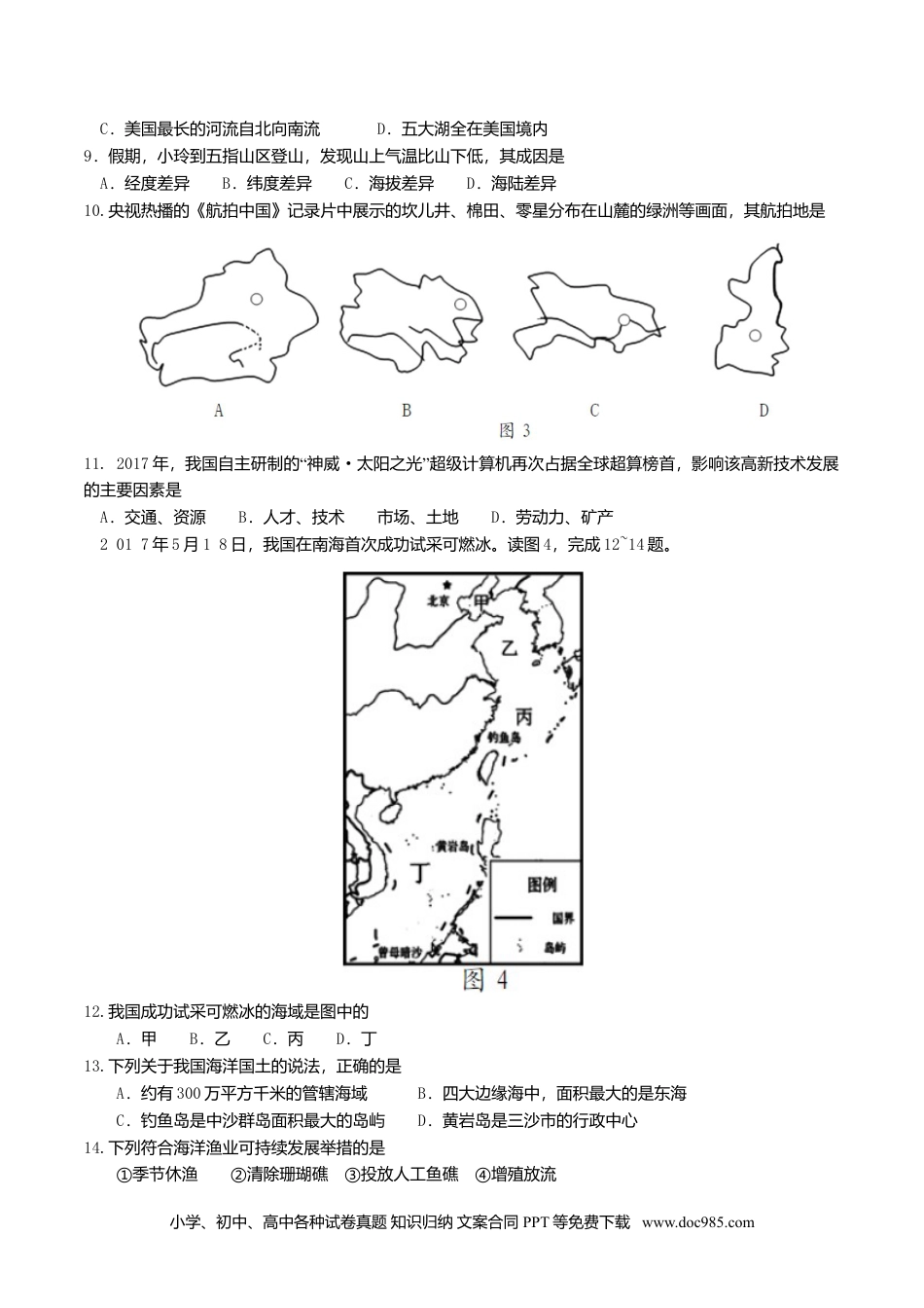 海南省2017年初中毕业生学业水平考试地理科试题(考试时间:60分钟满分:100分)第一部分选择题选择题共35题,每题2分,共70分。在每题给出的四个选项中,选出一项最符合题目要求的选项。1.2017年1月28日(除夕)22时,全球华人同步参与央视春晚微信抢红包,法国巴黎的华人同时参与则是当地时间14时,造成这种时间差异的主要原因是A.四季的变化B.月球公转C.地球公转D.地球自转2.下列天气符号代表的天气与我们的生产生活组合合理的是2017年6月4日,美国总统特朗普访问沙特阿拉伯。完成3~4题。3.随行翻译除了母语外,还应精通的语言是A.英语B.法语C.西班牙语D.阿拉伯语4.随行人员看到最多的宗教建筑物是A.教堂B.清真寺C.寺庙D.佛塔5.下列事实能证明海陆变迁的是A.太阳东升西落B.四季变化C.钱塘江的潮涨潮落D.台湾海峡的形成6.快递包装产生大量的包装纸、不可降解的胶带和塑料袋,由此带来的环境污染问题日益突出,下列做法能减少该问题的是①适度包装②用可降解的胶带和塑料袋包装③分类回收④随意使用包装盒A.①②③B.②③④C.①③④D.①②④读美国本土图(图2),完成7~8题。7.图2中阴影部分表示的农业带是A.乳畜带B.小麦区C.玉米带D.棉花带8.从图2中的信息可知A.美国地势东高西低B.美国平原狭小,山脉众多小学、初中、高中各种试卷真题知识归纳文案合同PPT等免费下载www.doc985.comC.美国最长的河流自北向南流D.五大湖全在美国境内9.假期,小玲到五指山区登山,发现山上气温比山下低,其成因是A.经度差异B.纬度差异C.海拔差异D.海陆差异10.央视热播的《航拍中国》记录片中展示的坎儿井、棉田、零星分布在山麓的绿洲等画面,其航拍地是11.2017“年,我国自主研制的神威·”太阳之光超级计算机再次占据全球超算榜首,影响该高新技术发展的主要因素是A.交通、资源B.人才、技术市场、土地D.劳动力、矿产2017年5月18日,我国在南海首次成功试采可燃冰。读图4,完成12~14题。12.我国成功试采可燃冰的海域是图中的A.甲B.乙C.丙D.丁13.下列关于我国海洋国土的说法,正确的是A.约有300万平方千米的管辖海域B.四大边缘海中,面积最大的是东海C.钓鱼岛是中沙群岛面积最大的岛屿D.黄岩岛是三沙市的行政中心14.下列符合海洋渔业可持续发展举措的是①季节休渔②清除珊瑚礁③投放人工鱼礁④增殖放流小学、初中、高中各种试卷真题知识归纳文案合同PPT等免费下载www.doc985.comA.①②③B.①②④C.①③④D.②③④15.海南夏季应重点防范的灾害性天气是A.台风B.寒潮C.沙尘暴D.地震16.我国少数民族中,吃糌粑、喝酥油茶、献哈达、赛牦牛的民族是A.壮族B.藏族C.傣族D.苗族2017年4月,中共中央、国务院决定设立雄安新区,其地处北京、天津、河北保定腹地,现有开发程度较低,能集中疏解北京非首都功能。完成17~19题。17.有关雄安新区开发建设的叙述,正确的是①毗邻京津地区,交通便利②缓解北京城市压力③现有开发程度较低④原有工业基础好A.①②③B.②③④C.①③④D.①②④18.制约京津冀农业生产的主要自然因素是A.土壤B.光照C.荒漠化D.水资源19.图6中,能正确反映京津冀地区气候特征的是20.假如你是一名导游,你向游客推荐具有海南特色的水果是A.红枣B.椰子C.苹果D.猕猴桃2017年3月22“”“”日是第二十五届世界水日,主题是废水。完成21~22题。21.下列关于我国水资源的叙述,正确的是A.水资源丰富,无需节水B.水资源分布不均,南多北少C.西北地区水资源丰宫D.北方地区人均水资源居全国首位22.在生产生活中,下列水资源利用方式可取的是小学、初中、高中各种试卷真题知识归纳文案合同PPT等免费下载www.doc985.comA.一水多用,废水利用B.大水漫灌农田C.直接排放废水D.大量使用地下水读我国四大地理区域图(图7),完成23~24题。23.下列与①④两区域界线大致一致的是A.种植业与畜牧业的界线B.湿润区与半湿润区的界线C.热带与亚热带的界线D.一月份10℃等温线24.下列关于四大地理区域的说法,正确是A.①区耕地以水田为主B.②区普遍种植油菜和玉米C.③区是我国许多大河的发源地D.④区沙尘暴气象灾害频发25.我...