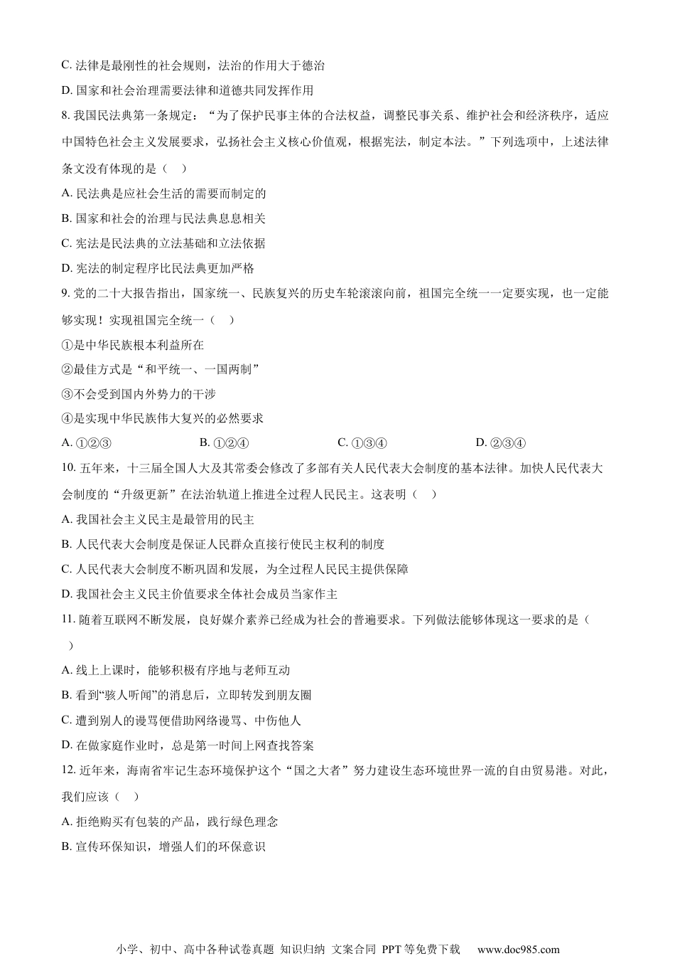 小学、初中、高中各种试卷真题知识归纳文案合同PPT等免费下载www.doc985.com2023年海南省中考道德与法治真题(全卷满分100分,考试时间60分钟)一、选择题(下列各题的备选答案中,只有一项符合题意,每小题3分,共48分)1.进入青春期,小海对自己发生的变化做出了以下判断,其中符合正确认识自己要求的是()①虽然胖了点,但也长高了——这是正常的②有解决不了的问题,不再去求助他人——我很独立③不再和异性同学交往——我很理智④不再人云亦云,勇于对不合理的事情说“不”——我思想更成熟A.①②B.①④C.②③D.③④2.小丽积极参加了班级组织的关爱独居老人的学雷锋活动。对此,家人发表了以下看法,你不认同的是()A.爷爷:这能给这些老人送去温暖,你真棒B.奶奶:这能够让你更好地融入班集体,多参加C.爸爸:纯属浪费时间,耽误学习。以后别去了D.妈妈:学雷锋对你的全面发展有帮助,我支持3.“知人者智,自知者明。胜人者有力,自胜者强。”人们常用这句话激励自己,因为()①仅凭自我评价就能正确认识自己②正确认识自己可以促进自我发展③勇于战胜自己,才能成为真正的强者④自强能让我们展现优势,高人一等A.①③B.①④C.②③D.②④4.海口市某医院里,一位不幸离世的爱心捐献者。捐出了他的器官。让多名患者“重生”,为生命“续约”,对捐献者评价最恰当的是()A.延长生命时间.实现生命可逆B.珍爱他人生命。体现生命至上C.拒绝生命平凡,伟大才有价值D.增强生命韧性,绽放生命之花5.下面图组《文明出行》共同告诉我们()小学、初中、高中各种试卷真题知识归纳文案合同PPT等免费下载www.doc985.comA.做文明的人要从小事、从细节做起B.做文明的人。主要靠他人监督、提醒和帮助C.以礼待人有助于人们友好交往D.文明出行与法律无关。但也应严于律己6.漫画《阖家登高迎新年》启示我们()①充盈生命,最好的方式是建立与自然的联系②爱护身体,适量运动,养成健康的生活方式③体味亲情,认真感受与家人相处的美好瞬间④品味情感,创造正面情感体验让家庭更和谐A.①②③B.①②④C.①③④D.②③④7.“人无德不立,国无德不兴:法治兴则国兴,法治强则国强。”对这句话理解正确的是()A.道德是社会关系的基石,德治的作用大于法治B.调节人们行为的社会规则只有道德和法律小学、初中、高中各种试卷真题知识归纳文案合同PPT等免费下载www.doc985.comC.法律是最刚性的社会规则,法治的作用大于德治D.国家和社会治理需要法律和道德共同发挥作用8.我国民法典第一条规定:“为了保护民事主体的合法权益,调整民事关系、维护社会和经济秩序,适应中国特色社会主义发展要求,弘扬社会主义核心价值观,根据宪法,制定本法。”下列选项中,上述法律条文没有体现的是()A.民法典是应社会生活的需要而制定的B.国家和社会的治理与民法典息息相关C.宪法是民法典的立法基础和立法依据D.宪法的制定程序比民法典更加严格9.党的二十大报告指出,国家统一、民族复兴的历史车轮滚滚向前,祖国完全统一一定要实现,也一定能够实现!实现祖国完全统一()①是中华民族根本利益所在②最佳方式是“和平统一、一国两制”③不会受到国内外势力的干涉④是实现中华民族伟大复兴的必然要求A.①②③B.①②④C.①③④D.②③④10.五年来,十三届全国人大及其常委会修改了多部有关人民代表大会制度的基本法律。加快人民代表大会制度的“升级更新”在法治轨道上推进全过程人民民主。这表明()A.我国社会主义民主是最管用的民主B.人民代表大会制度是保证人民群众直接行使民主权利的制度C.人民代表大会制度不断巩固和发展,为全过程人民民主提供保障D.我国社会主义民主价值要求全体社会成员当家作主11.随着互联网不断发展,良好媒介素养已经成为社会的普遍要求。下列做法能够体现这一要求的是()A.线上上课时,能够积极有序地与老师互动B.看到“骇人听闻”的消息后,立即转发到朋友圈C.遭到别人的谩骂便借助网络谩骂、中伤他人D.在做家庭作业时,总是第一时间上网查找答案12.近年来,海南省牢记生态环境保护这个“国之大者”努力建设生态环境世界一流的自由贸易港。对此,我们应该()A.拒绝购买有包装的产...