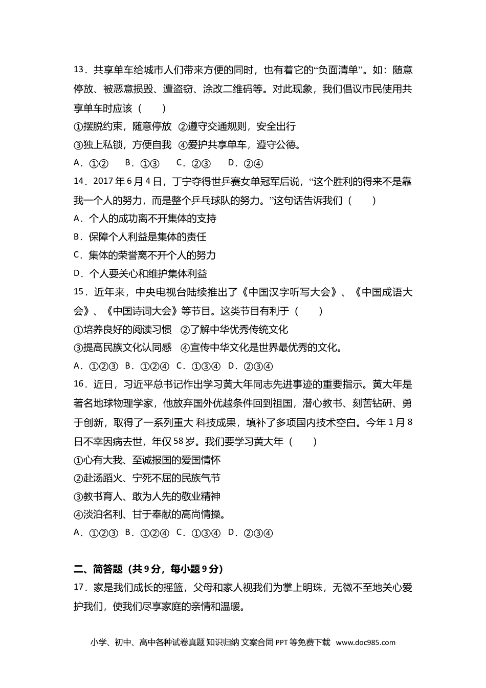 2017年海南省中考思想品德试卷一、选择题(共16小题,每小题3分,满分48分)1.2016年8月5日,第31届夏季奥林匹克运动会在()举行。A.北京B.伦敦C.里约热内卢D.东京2.2017年4月1日,中共中央、国务院印发通知,决定设立新区。这是继深圳经济特区和上海浦东新区之后又一具有全国意义的新区,是千年大计、国家大事。()A.天津滨海B.河北雄安C.广州越秀D.重庆涪陵3.2017年4月20日,()在海南文昌发射成功。这是我国空间货物运输系统的首次飞行试验,标志着我国空间站时代大幕正式开启。A.天舟一号B.神舟十一号C.天宫一号D.嫦娥一号4.如图漫画反映了()A.情绪是复杂多变的B.情绪充实人的体力和精力C.情绪是不可调控的D.不良情绪影响人的身心健康5.有一本励志书叫《感谢折磨你的人》.书名中这句话蕴含的人生哲理是()A.人生难免有挫折,挫折越多越好B.只要经历挫折就一定能够成功C.不同的人面对挫折的态度是一样的D.在坚强的人面前挫折也是财富6“.马云说:没有人是完美的,社会不可能完美,因为社会是由所有不完美的”人组成的。这句话启示我们()A.保持自尊自信,自傲自负B.正确认识自我,悦纳自我小学、初中、高中各种试卷真题知识归纳文案合同PPT等免费下载www.doc985.comC.放大自己优势,相信自我D.保持谦卑态度,依赖他人7.感动中国2016年度十大人物﹣﹣张超,在驾驶舰载战斗机进行训练时,突发电传故障,危机关头,他果断处置,尽最大努力保住战机。最后,推杆无效,被迫跳伞,坠地受重伤,经抢救无效壮烈牺牲。下列对张超英雄事迹评价正确的是()A.能获得众人称赞是他人生的追求B.生命是可贵的,他不珍爱自己的生命C.为了国家和人民利益牺牲自己,值得崇敬与追念D.在他人生命危急之时敢于牺牲自己,是有价值的8.今年3月15日,十二届全国人大五次会议表决通过了《中华人民共和国民法总则》.这表明法律()A.是自然形成的B.对全体社会成员具有普遍约束力C.是由国家制定或认可的D.靠国家强制力保证实施,具有强制性9“”.我省刘某某因散布甲醇泡海鱼谣言被行政拘留5日并罚款500元;王某因与朋友发生口角,把对方打成重伤,被法院判处有期徒刑。他们行为的共同点是()A.都是违法行为B.都具有严重社会危害性C.都是犯罪行为D.都受到了刑罚的处罚10.某超市为防止员工私带货物出店,员工下班被搜身后方可离店。此举侵犯了员工的()A.荣誉权B.人身自由权C.财产所有权D.生命健康权11“”.文明是最美的风景。下列反映这一公益广告词的行为是()A.在食堂随意插队打饭B.上学回家路上闯红灯C.随意乱扔零食包装盒D.轻声有序地上下楼梯12“”.某商家进行微信集赞活动,宣称集满38“”个赞可领一台电饭锅。戴先生“”集满赞后到店领取电饭锅时,却被告知需先支付80元才能领取。商家的虚假宣传侵犯了消费者的()A.安全权B.知情权C.自主选择权D.公平交易权小学、初中、高中各种试卷真题知识归纳文案合同PPT等免费下载www.doc985.com13“”.共享单车给城市人们带来方便的同时,也有着它的负面清单。如:随意停放、被恶意损毁、遭盗窃、涂改二维码等。对此现象,我们倡议市民使用共享单车时应该()①摆脱约束,随意停放②遵守交通规则,安全出行③独上私锁,方便自我④爱护共享单车,遵守公德。A.①②B.①③C.②③D.②④14.2017年6月4“日,丁宁夺得世乒赛女单冠军后说,这个胜利的得来不是靠”我一个人的努力,而是整个乒乓球队的努力。这句话告诉我们()A.个人的成功离不开集体的支持B.保障个人利益是集体的责任C.集体的荣誉离不开个人的努力D.个人要关心和维护集体利益15.近年来,中央电视台陆续推出了《中国汉字听写大会》、《中国成语大会》、《中国诗词大会》等节目。这类节目有利于()①培养良好的阅读习惯②了解中华优秀传统文化③提高民族文化认同感④宣传中华文化是世界最优秀的文化。A.①②③B.①②④C.①③④D.②③④16.近日,习近平总书记作出学习黄大年同志先进事迹的重要指示。黄大年是著名地球物理学家,他放弃国外优越条件回到祖国,潜心教书、刻苦钻研、勇于创新,取得了一系列重大科...