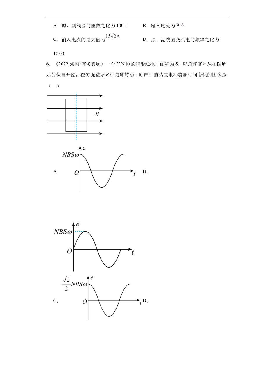 专题11交变电流传感器一、单选题1.(2023·山东·统考高考真题)某节能储能输电网络如图所示,发电机的输出电压U1=250V,输出功率500kW。降压变压器的匝数比n3:n4=50:1,输电线总电阻R=62.5Ω。其余线路电阻不计,用户端电压U4=220V,功率88kW,所有变压器均为理想变压器。下列说法正确的是()A.发电机的输出电流为368AB.输电线上损失的功率为4.8kWC.输送给储能站的功率为408kWD.升压变压器的匝数比n1:n2=1:442.(2023·北京·统考高考真题)自制一个原、副线圈匝数分别为600匝和190匝的变压器,原线圈接12V的正弦交流电源,副线圈接额定电压为3.8V的小灯泡。实际测得小灯泡两端电压为2.5V。下列措施有可能使小灯泡正常发光的是()A.仅增加原线圈匝数B.仅增加副线圈匝数C.将原、副线圈匝数都增为原来的两倍D.将两个3.8V小灯泡并联起来接入副线圈3.(2023·浙江·统考高考真题)我国1100kV特高压直流输电工程的送电端用“整流”设备将交流变换成直流,用户端用“逆变”设备再将直流变换成交流。下列说法正确的是()A.送电端先升压再整流B.用户端先降压再变交流C.1100kV是指交流电的最大值D.输电功率由送电端电压决定4.(2022·重庆·高考真题)低压卤素灯在家庭电路中使用时需要变压器降压。若将“”的交流卤素灯直接通过变压器(视为理想变压器)接入电压为的交流电后能正常工作,则()A.卤素灯两端的电压有效值为B.变压器原、副线圈的匝数比为553∶C.流过卤素灯的电流为D.卤素灯的电阻为5.(2022·北京·高考真题)某理想变压器的原线圈接在的正弦交流电源上,副线圈输出电压为,输出电流为。该变压器()A.原、副线圈的匝数之比为1001∶B.输入电流为C.输入电流的最大值为D.原、副线圈交流电的频率之比为1100∶6.(2022·海南·高考真题)一个有N匝的矩形线框,面积为S,以角速度从如图所示的位置开始,在匀强磁场B中匀速转动,则产生的感应电动势随时间变化的图像是()A.B.C.D.7.(2022·河北·统考高考真题)张家口市坝上地区的风力发电场是北京冬奥会绿色电能的主要供应地之一,其发电、输电简易模型如图所示,已知风轮机叶片转速为每秒z转,通过转速比为的升速齿轮箱带动发电机线圈高速转动,发电机线圈面积为S,匝数为N,匀强磁场的磁感应强度为B,时刻,线圈所在平面与磁场方向垂直,发电机产生的交变电流经过理想变压器升压后。输出电压为U。忽略线圈电阻,下列说法正确的是()A.发电机输出的电压为B.发电机输出交变电流的频率为C.变压器原、副线圈的匝数比为D.发电机产生的瞬时电动势8.(2022·浙江·统考高考真题)下列说法正确的是()A.恒定磁场对静置于其中的电荷有力的作用B.小磁针N极在磁场中的受力方向是该点磁感应强度的方向C.正弦交流发电机工作时,穿过线圈平面的磁通量最大时,电流最大D.升压变压器中,副线圈的磁通量变化率大于原线圈的磁通量变化率9.(2022·广东·高考真题)图是简化的某种旋转磁极式发电机原理图。定子是仅匝数n不同的两线圈,,二者轴线在同一平面内且相互垂直,两线圈到其轴线交点O的距离相等,且均连接阻值为R的电阻,转子是中心在O点的条形磁铁,绕O点在该平面内匀速转动时,两线圈输出正弦式交变电流。不计线圈电阻、自感及两线圈间的相互影响,下列说法正确的是()A.两线圈产生的电动势的有效值相等B.两线圈产生的交变电流频率相等C.两线圈产生的电动势同时达到最大值D.两电阻消耗的电功率相等10.(2022·湖南·统考高考真题)如图,理想变压器原、副线圈总匝数相同,滑动触头P1初始位置在副线圈正中间,输入端接入电压有效值恒定的交变电源。定值电阻R1的阻值为R,滑动变阻器R2的最大阻值为9R,滑片P2初始位置在最右端。理想电压表V的示数为U,理想电流表A的示数为I。下列说法正确的是()A.保持P1位置不变,P2向左缓慢滑动的过程中,I减小,U不变B.保持P1位置不变,P2向左缓慢滑动的过程中,R1消耗的功率增大C.保持P2位置不变,P1向下缓慢滑动的过程中,I减小,U增大D.保持P2位置不变,P1向下缓慢滑动的过程中,R1消耗的功率减小11.(2022·山东·统考高考真题)...