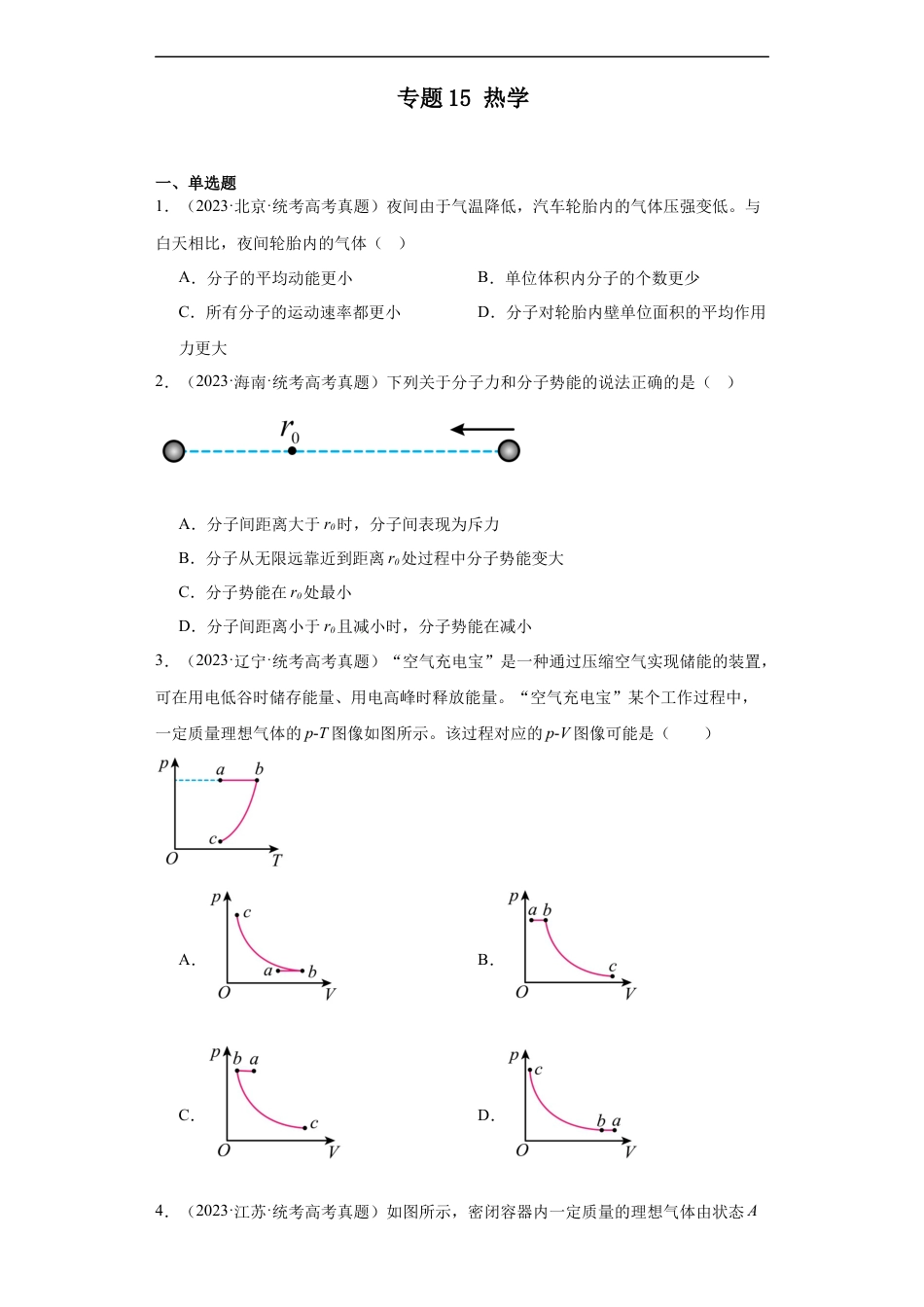 专题15热学一、单选题1.(2023·北京·统考高考真题)夜间由于气温降低,汽车轮胎内的气体压强变低。与白天相比,夜间轮胎内的气体()A.分子的平均动能更小B.单位体积内分子的个数更少C.所有分子的运动速率都更小D.分子对轮胎内壁单位面积的平均作用力更大2.(2023·海南·统考高考真题)下列关于分子力和分子势能的说法正确的是()A.分子间距离大于r0时,分子间表现为斥力B.分子从无限远靠近到距离r0处过程中分子势能变大C.分子势能在r0处最小D.分子间距离小于r0且减小时,分子势能在减小3.(2023·辽宁·统考高考真题)“空气充电宝”是一种通过压缩空气实现储能的装置,可在用电低谷时储存能量、用电高峰时释放能量。“空气充电宝”某个工作过程中,一定质量理想气体的p-T图像如图所示。该过程对应的p-V图像可能是()A.B.C.D.4.(2023·江苏·统考高考真题)如图所示,密闭容器内一定质量的理想气体由状态A变化到状态B。该过程中()A.气体分子的数密度增大B.气体分子的平均动能增大C.单位时间内气体分子对单位面积器壁的作用力减小D.单位时间内与单位面积器壁碰撞的气体分子数减小5.(2023·天津·统考高考真题)如图是爬山所带氧气瓶,氧气瓶里的气体容积质量不变,爬高过程中,温度减小,则气体()A.对外做功B.内能减小C.吸收热量D.压强不变6.(2022·重庆·高考真题)2022年5月15日,我国自主研发的“极目一号”Ⅲ型浮空艇创造了海拔9032米的大气科学观测世界纪录。若在浮空艇某段上升过程中,艇内气体温度降低,体积和质量视为不变,则艇内气体()(视为理想气体)A.吸收热量B.压强增大C.内能减小D.对外做负功7.(2022·北京·高考真题)2021年5月,中国科学院全超导托卡马克核聚变实验装置()取得新突破,成功实现了可重复的1.2亿摄氏度101秒和1.6亿摄氏度20秒等离子体运行,创造托卡马克实验装置运行新的世界纪录,向核聚变能源应用迈出重要一步。等离子体状态不同于固体、液体和气体的状态,被认为是物质的第四态。当物质处于气态时,如果温度进一步升高,几乎全部分子或原子由于激烈的相互碰撞而离解为电子和正离子,此时物质称为等离子体。在自然界里,火焰、闪电、极光中都会形成等离子体,太阳和所有恒星都是等离子体。下列说法不正确的是()A.核聚变释放的能量源于等离子体中离子的动能B.可以用磁场来约束等离子体C.尽管等离子体整体是电中性的,但它是电的良导体D.提高托卡马克实验装置运行温度有利于克服等离子体中正离子间的库仑斥力8.(2022·北京·高考真题)如图所示,一定质量的理想气体从状态a开始,沿图示路径先后到达状态b和c。下列说法正确的是()A.从a到b,气体温度保持不变B.从a到b,气体对外界做功C.从b到c,气体内能减小D.从b到c,气体从外界吸热9.(2022·江苏·高考真题)如图所示,一定质量的理想气体分别经历和两个过程,其中为等温过程,状态b、c的体积相同,则()A.状态a的内能大于状态bB.状态a的温度高于状态cC.过程中气体吸收热量D.过程中外界对气体做正功10.(2022·江苏·高考真题)自主学习活动中,同学们对密闭容器中的氢气性质进行讨论,下列说法中正确的是()A.体积增大时,氢气分子的密集程度保持不变B.压强增大是因为氢气分子之间斥力增大C.因为氢气分子很小,所以氢气在任何情况下均可看成理想气体D.温度变化时,氢气分子速率分布中各速率区间的分子数占总分子数的百分比会变化11.(2022·辽宁·高考真题)一定质量的理想气体从状态a变化到状态b,其体积V和热力学温度T变化图像如图所示,此过程中该系统()A.对外界做正功B.压强保持不变C.向外界放热D.内能减少12.(2022·湖北·统考高考真题)一定质量的理想气体由状态a变为状态c,其过程如p—V图中a→c直线段所示,状态b对应该线段的中点。下列说法正确的是()A.a→b是等温过程B.a→b过程中气体吸热C.a→c过程中状态b的温度最低D.a→c过程中外界对气体做正功13.(2022·山东·统考高考真题)如图所示,内壁光滑的绝热汽缸内用绝热活塞封闭一定质量的理想气体,初始时汽缸开口向上放置,活塞处于静止...
