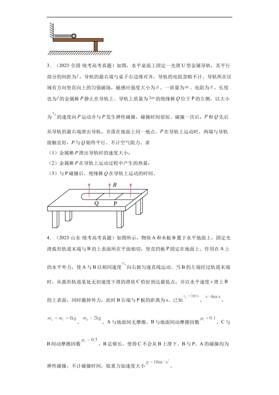 专题19力学综合计算题一、解答题1.(2023·全国·统考高考真题)如图,一竖直固定的长直圆管内有一质量为M的静止薄圆盘,圆盘与管的上端口距离为l,圆管长度为。一质量为的小球从管的上端口由静止下落,并撞在圆盘中心,圆盘向下滑动,所受滑动摩擦力与其所受重力大小相等。小球在管内运动时与管壁不接触,圆盘始终水平,小球与圆盘发生的碰撞均为弹性碰撞且碰撞时间极短。不计空气阻力,重力加速度大小为g。求(1)第一次碰撞后瞬间小球和圆盘的速度大小;(2)在第一次碰撞到第二次碰撞之间,小球与圆盘间的最远距离;(3)圆盘在管内运动过程中,小球与圆盘碰撞的次数。2.(2023·全国·统考高考真题)如图,光滑水平桌面上有一轻质弹簧,其一端固定在墙上。用质量为m的小球压弹簧的另一端,使弹簧的弹性势能为。释放后,小球在弹簧作用下从静止开始在桌面上运动,与弹簧分离后,从桌面水平飞出。小球与水平地面碰撞后瞬间,其平行于地面的速度分量与碰撞前瞬间相等;垂直于地面的速度分量大小变为碰撞前瞬间的。小球与地面碰撞后,弹起的最大高度为h。重力加速度大小为g,忽略空气阻力。求(1)小球离开桌面时的速度大小;(2)小球第一次落地点距桌面上其飞出点的水平距离。3.(2023·全国·统考高考真题)如图,水平桌面上固定一光滑U型金属导轨,其平行部分的间距为,导轨的最右端与桌子右边缘对齐,导轨的电阻忽略不计。导轨所在区域有方向竖直向上的匀强磁场,磁感应强度大小为。一质量为、电阻为、长度也为的金属棒P静止在导轨上。导轨上质量为的绝缘棒Q位于P的左侧,以大小为的速度向P运动并与P发生弹性碰撞,碰撞时间很短。碰撞一次后,P和Q先后从导轨的最右端滑出导轨,并落在地面上同一地点。P在导轨上运动时,两端与导轨接触良好,P与Q始终平行。不计空气阻力。求(1)金属棒P滑出导轨时的速度大小;(2)金属棒P在导轨上运动过程中产生的热量;(3)与P碰撞后,绝缘棒Q在导轨上运动的时间。4.(2023·山东·统考高考真题)如图所示,物块A和木板B置于水平地面上,固定光滑弧形轨道末端与B的上表面所在平面相切,竖直挡板P固定在地面上。作用在A上的水平外力,使A与B以相同速度向右做匀速直线运动。当B的左端经过轨道末端时,从弧形轨道某处无初速度下滑的滑块C恰好到达最低点,并以水平速度v滑上B的上表面,同时撤掉外力,此时B右端与P板的距离为s。已知,,,,A与地面间无摩擦,B与地面间动摩擦因数,C与B间动摩擦因数,B足够长,使得C不会从B上滑下。B与P、A的碰撞均为弹性碰撞,不计碰撞时间,取重力加速度大小。(1)求C下滑的高度H;(2)与P碰撞前,若B与C能达到共速,且A、B未发生碰撞,求s的范围;(3)若,求B与P碰撞前,摩擦力对C做的功W;(4)若,自C滑上B开始至A、B、C三个物体都达到平衡状态,求这三个物体总动量的变化量的大小。5.(2023·山东·统考高考真题)电磁炮灭火消防车(图甲)采用电磁弹射技术投射灭火弹进入高层建筑快速灭火。电容器储存的能量通过电磁感应转化成灭火弹的动能,设置储能电容器的工作电压可获得所需的灭火弹出膛速度。如图乙所示,若电磁炮正对高楼,与高楼之间的水平距离,灭火弹出膛速度,方向与水平面夹角,不计炮口离地面高度及空气阻力,取重力加速度大小,。(1)求灭火弹击中高楼位置距地面的高度H;(2)已知电容器储存的电能,转化为灭火弹动能的效率,灭火弹的质量为,电容,电容器工作电压U应设置为多少?6.(2023·北京·统考高考真题)螺旋星系中有大量的恒星和星际物质,主要分布在半径为R的球体内,球体外仅有极少的恒星。球体内物质总质量为M,可认为均匀分布,球体内外的所有恒星都绕星系中心做匀速圆周运动,恒星到星系中心的距离为r,引力常量为G。(1)求区域的恒星做匀速圆周运动的速度大小v与r的关系;(2)根据电荷均匀分布的球壳内试探电荷所受库仑力的合力为零,利用库仑力与万有引力的表达式的相似性和相关力学知识,求区域的恒星做匀速圆周运动的速度大小v与r的关系;(3)科学家根据实测数据,得到此螺旋星系中不同位置的恒星做匀速圆周运动的速度大小v随r的变化关系图像,如图所示...