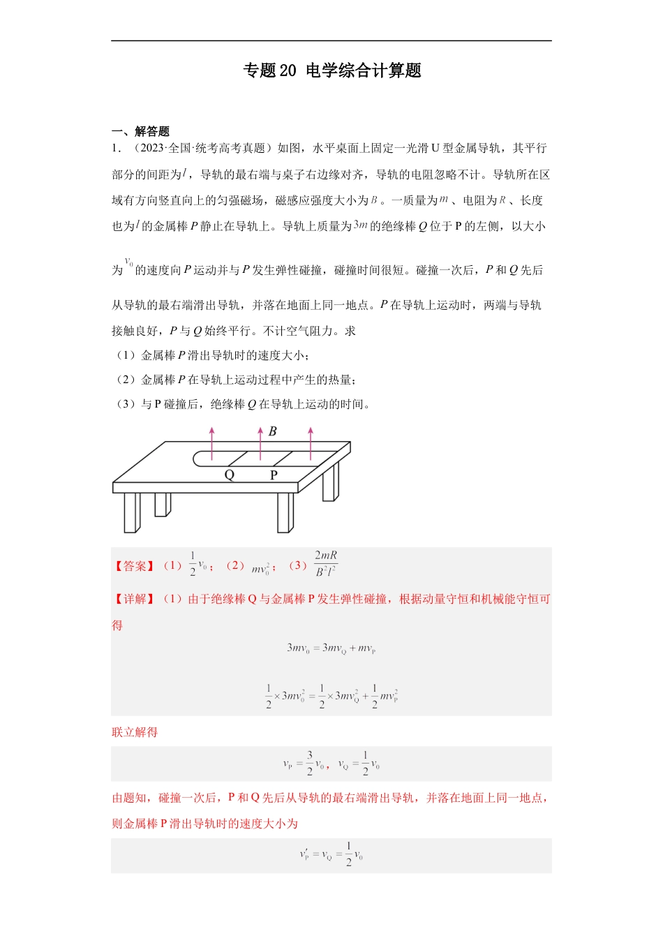 专题20电学综合计算题一、解答题1.(2023·全国·统考高考真题)如图,水平桌面上固定一光滑U型金属导轨,其平行部分的间距为,导轨的最右端与桌子右边缘对齐,导轨的电阻忽略不计。导轨所在区域有方向竖直向上的匀强磁场,磁感应强度大小为。一质量为、电阻为、长度也为的金属棒P静止在导轨上。导轨上质量为的绝缘棒Q位于P的左侧,以大小为的速度向P运动并与P发生弹性碰撞,碰撞时间很短。碰撞一次后,P和Q先后从导轨的最右端滑出导轨,并落在地面上同一地点。P在导轨上运动时,两端与导轨接触良好,P与Q始终平行。不计空气阻力。求(1)金属棒P滑出导轨时的速度大小;(2)金属棒P在导轨上运动过程中产生的热量;(3)与P碰撞后,绝缘棒Q在导轨上运动的时间。【答案】(1);(2);(3)【详解】(1)由于绝缘棒Q与金属棒P发生弹性碰撞,根据动量守恒和机械能守恒可得联立解得,由题知,碰撞一次后,P和Q先后从导轨的最右端滑出导轨,并落在地面上同一地点,则金属棒P滑出导轨时的速度大小为(2)根据能量守恒有解得(3)P、Q碰撞后,对金属棒P分析,根据动量定理得又,联立可得由于Q为绝缘棒,无电流通过,做匀速直线运动,故Q运动的时间为2.(2023·全国·统考高考真题)如图,等边三角形位于竖直平面内,AB边水平,顶点C在AB边上方,3个点电荷分别固定在三角形的三个顶点上。已知AB边中点M处的电场强度方向竖直向下,BC边中点N处的电场强度方向竖直向上,A点处点电荷的电荷量的绝对值为q,求(1)B点处点电荷的电荷量的绝对值并判断3个点电荷的正负;(2)C点处点电荷的电荷量。【答案】(1),A、B、C均为正电荷;(2)【详解】(1)因为M点电场强度竖直向下,则C为正电荷,根据场强的叠加原理,可知A、B两点的电荷在M点的电场强度大小相等,方向相反,则B点电荷带电量为,电性与A相同,又点电场强度竖直向上,可得处电荷在点的场强垂直BC沿AN连线向右上,如图所示可知A处电荷为正电荷,所以A、B、C均为正电荷。(2)如图所示由几何关系即其中解得3.(2023·天津·统考高考真题)如图,有一正方形线框,质量为m,电阻为R,边长为l,静止悬挂着,一个三角形磁场垂直于线框所在平面,磁感线垂直纸面向里,且线框中磁区面积为线框面积一半,磁感应强度变化B=kt(k>0),己知重力加速度g,求:(1)感应电动势E;(2)线框开始向上运动的时刻t0;【答案】(1);(2)【详解】(1)根据法拉第电磁感应定律有(2)由图可知线框受到的安培力为当线框开始向上运动时有mg=FA解得4.(2023·浙江·统考高考真题)某兴趣小组设计了一种火箭落停装置,简化原理如图所示,它由两根竖直导轨、承载火箭装置(简化为与火箭绝缘的导电杆MN)和装置A组成,并形成闭合回路。装置A能自动调节其输出电压确保回路电流I恒定,方向如图所示。导轨长度远大于导轨间距,不论导电杆运动到什么位置,电流I在导电杆以上空间产生的磁场近似为零,在导电杆所在处产生的磁场近似为匀强磁场,大小(其中k为常量),方向垂直导轨平面向里;在导电杆以下的两导轨间产生的磁场近似为匀强磁场,大小,方向与B1相同。火箭无动力下降到导轨顶端时与导电杆粘接,以速度v0进入导轨,到达绝缘停靠平台时速度恰好为零,完成火箭落停。已知火箭与导电杆的总质量为M,导轨间距,导电杆电阻为R。导电杆与导轨保持良好接触滑行,不计空气阻力和摩擦力,不计导轨电阻和装置A的内阻。在火箭落停过程中,(1)求导电杆所受安培力的大小F和运动的距离L;(2)求回路感应电动势E与运动时间t的关系;(3)求装置A输出电压U与运动时间t的关系和输出的能量W;(4)若R的阻值视为0,装置A用于回收能量,给出装置A可回收能量的来源和大小。【答案】(1)3Mg;;(2);(3);;(4)装置A可回收火箭的动能和重力势能;【详解】(1)导体杆受安培力方向向上,则导体杆向下运动的加速度解得a=-2g导体杆运动的距离(2)回路的电动势其中解得(3)右手定则和欧姆定律可得:可得电源输出能量的功率在时间内输出的能量对应图像的面积,可得:(4)装置A可回收火箭的动能和重力势能,及磁场能;从开始火箭从速度v0到平台速度减为零,则若...