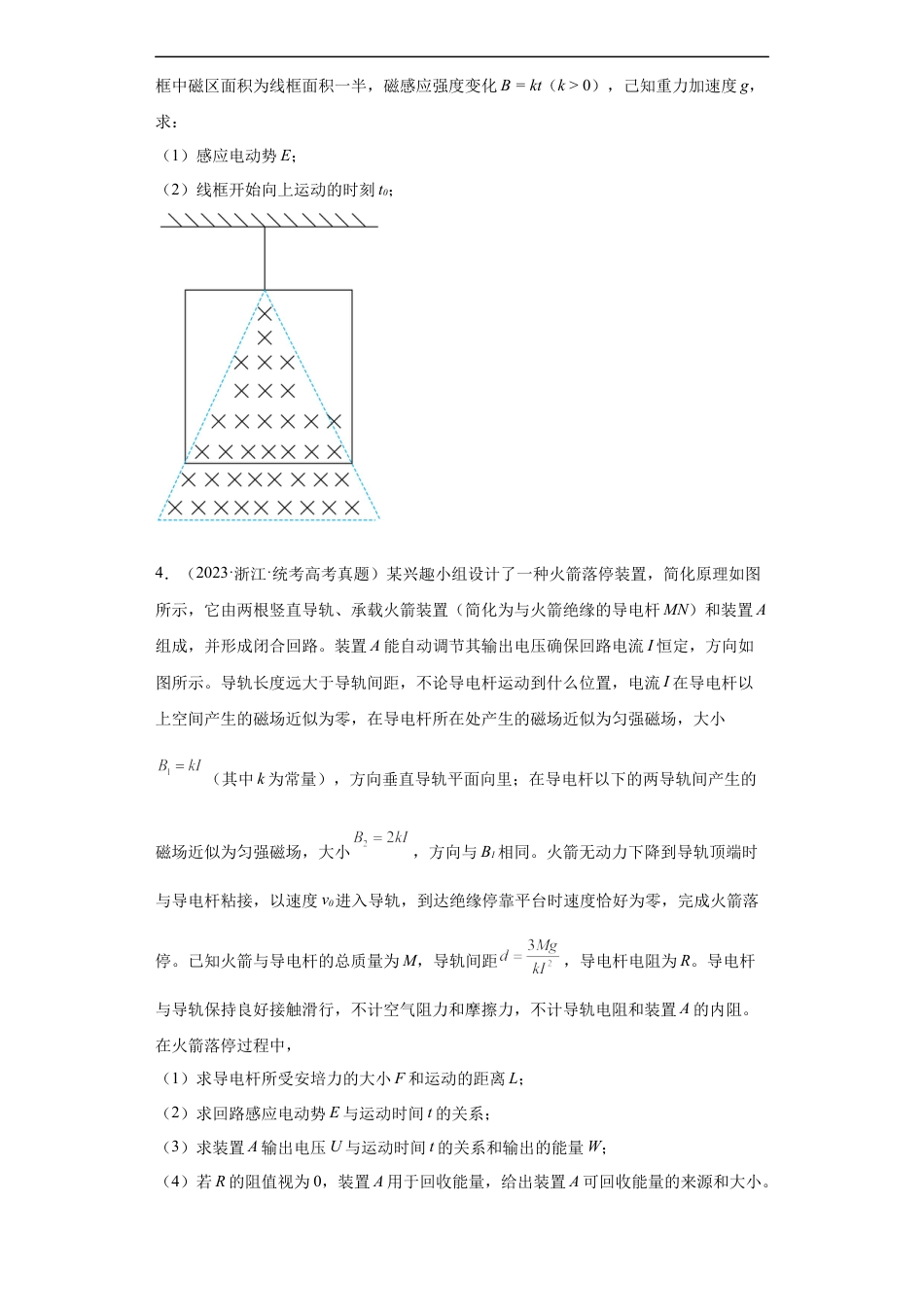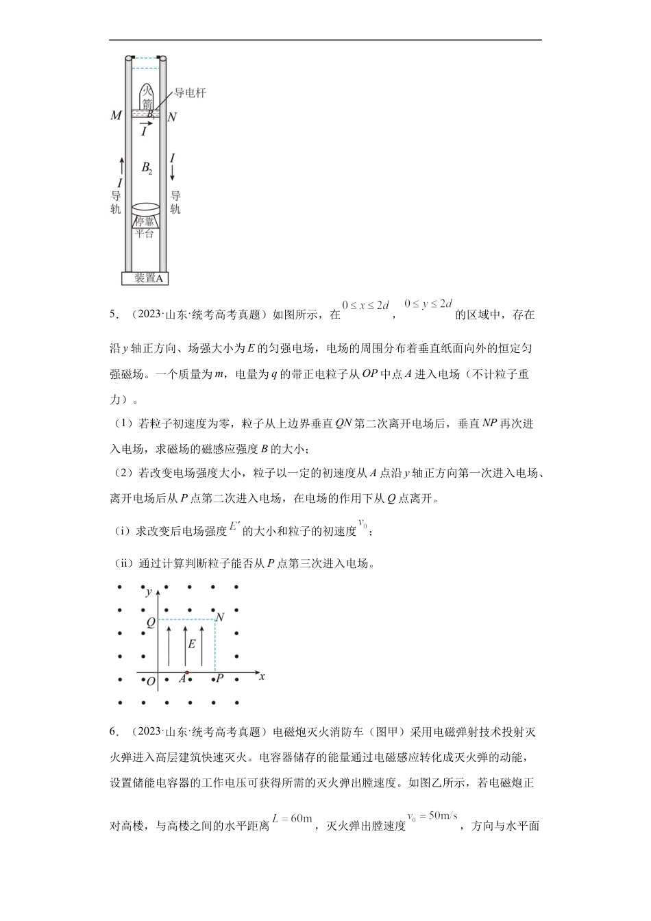 专题20电学综合计算题一、解答题1.(2023·全国·统考高考真题)如图,水平桌面上固定一光滑U型金属导轨,其平行部分的间距为,导轨的最右端与桌子右边缘对齐,导轨的电阻忽略不计。导轨所在区域有方向竖直向上的匀强磁场,磁感应强度大小为。一质量为、电阻为、长度也为的金属棒P静止在导轨上。导轨上质量为的绝缘棒Q位于P的左侧,以大小为的速度向P运动并与P发生弹性碰撞,碰撞时间很短。碰撞一次后,P和Q先后从导轨的最右端滑出导轨,并落在地面上同一地点。P在导轨上运动时,两端与导轨接触良好,P与Q始终平行。不计空气阻力。求(1)金属棒P滑出导轨时的速度大小;(2)金属棒P在导轨上运动过程中产生的热量;(3)与P碰撞后,绝缘棒Q在导轨上运动的时间。2.(2023·全国·统考高考真题)如图,等边三角形位于竖直平面内,AB边水平,顶点C在AB边上方,3个点电荷分别固定在三角形的三个顶点上。已知AB边中点M处的电场强度方向竖直向下,BC边中点N处的电场强度方向竖直向上,A点处点电荷的电荷量的绝对值为q,求(1)B点处点电荷的电荷量的绝对值并判断3个点电荷的正负;(2)C点处点电荷的电荷量。3.(2023·天津·统考高考真题)如图,有一正方形线框,质量为m,电阻为R,边长为l,静止悬挂着,一个三角形磁场垂直于线框所在平面,磁感线垂直纸面向里,且线框中磁区面积为线框面积一半,磁感应强度变化B=kt(k>0),己知重力加速度g,求:(1)感应电动势E;(2)线框开始向上运动的时刻t0;4.(2023·浙江·统考高考真题)某兴趣小组设计了一种火箭落停装置,简化原理如图所示,它由两根竖直导轨、承载火箭装置(简化为与火箭绝缘的导电杆MN)和装置A组成,并形成闭合回路。装置A能自动调节其输出电压确保回路电流I恒定,方向如图所示。导轨长度远大于导轨间距,不论导电杆运动到什么位置,电流I在导电杆以上空间产生的磁场近似为零,在导电杆所在处产生的磁场近似为匀强磁场,大小(其中k为常量),方向垂直导轨平面向里;在导电杆以下的两导轨间产生的磁场近似为匀强磁场,大小,方向与B1相同。火箭无动力下降到导轨顶端时与导电杆粘接,以速度v0进入导轨,到达绝缘停靠平台时速度恰好为零,完成火箭落停。已知火箭与导电杆的总质量为M,导轨间距,导电杆电阻为R。导电杆与导轨保持良好接触滑行,不计空气阻力和摩擦力,不计导轨电阻和装置A的内阻。在火箭落停过程中,(1)求导电杆所受安培力的大小F和运动的距离L;(2)求回路感应电动势E与运动时间t的关系;(3)求装置A输出电压U与运动时间t的关系和输出的能量W;(4)若R的阻值视为0,装置A用于回收能量,给出装置A可回收能量的来源和大小。5.(2023·山东·统考高考真题)如图所示,在,的区域中,存在沿y轴正方向、场强大小为E的匀强电场,电场的周围分布着垂直纸面向外的恒定匀强磁场。一个质量为m,电量为q的带正电粒子从OP中点A进入电场(不计粒子重力)。(1)若粒子初速度为零,粒子从上边界垂直QN第二次离开电场后,垂直NP再次进入电场,求磁场的磁感应强度B的大小;(2)若改变电场强度大小,粒子以一定的初速度从A点沿y轴正方向第一次进入电场、离开电场后从P点第二次进入电场,在电场的作用下从Q点离开。(i)求改变后电场强度的大小和粒子的初速度;(ii)通过计算判断粒子能否从P点第三次进入电场。6.(2023·山东·统考高考真题)电磁炮灭火消防车(图甲)采用电磁弹射技术投射灭火弹进入高层建筑快速灭火。电容器储存的能量通过电磁感应转化成灭火弹的动能,设置储能电容器的工作电压可获得所需的灭火弹出膛速度。如图乙所示,若电磁炮正对高楼,与高楼之间的水平距离,灭火弹出膛速度,方向与水平面夹角,不计炮口离地面高度及空气阻力,取重力加速度大小,。(1)求灭火弹击中高楼位置距地面的高度H;(2)已知电容器储存的电能,转化为灭火弹动能的效率,灭火弹的质量为,电容,电容器工作电压U应设置为多少?7.(2023·北京·统考高考真题)2022年,我国阶段性建成并成功运行了“电磁撬”,创造了大质量电磁推进技术的世界最高速度纪录。一种两级导轨式电磁推进的原理如图所示。两平行长直...