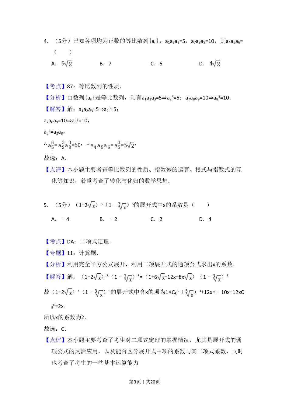 第1页|共20页2010年全国统一高考数学试卷(理科)(大纲版Ⅰ)参考答案与试题解析一、选择题(共12小题,每小题5分,满分60分)1.(5分)复数=()A.iB.﹣iC.12﹣13iD.12+13i【考点】A5:复数的运算.菁优网版权所有【专题】11:计算题.【分析】复数的分子中利用﹣i2=1代入3,然后化简即可.【解答】解:故选:A.【点评】本小题主要考查复数的基本运算,重点考查分母实数化的转化技巧.2.(5分)记cos(﹣80°)=k,那么tan100°=()A.B.﹣C.D.﹣【考点】GF:三角函数的恒等变换及化简求值;GG:同角三角函数间的基本关系;GO:运用诱导公式化简求值.菁优网版权所有【专题】11:计算题.【分析】法一:先求sin80°,然后化切为弦,求解即可.法二:先利用诱导公式化切为弦,求出求出结果.【解答】解:法一,所以tan100°=﹣tan80°=.:法二cos(﹣80°)=k⇒cos(80°)=k,第2页|共20页=【点评】本小题主要考查诱导公式、同角三角函数关系式等三角函数知识,并突出了弦切互化这一转化思想的应用.3.(5分)若变量x,y满足约束条件,则z=x﹣2y的最大值为()A.4B.3C.2D.1【考点】7C:简单线性规划.菁优网版权所有【专题】11:计算题;31:数形结合.【分析】先根据约束条件画出可行域,再利用几何意义求最值,z=x﹣2y表示直线在y轴上的截距,只需求出可行域直线在y轴上的截距最小值即可.【解答】解:画出可行域(如图),z=x﹣2y⇒y=x﹣z,由图可知,当直线l经过点A(1,﹣1)时,z最大,且最大值为zmax=1﹣2×(﹣1)=3.故选:B.【点评】本小题主要考查线性规划知识、作图、识图能力及计算能力,以及利用几何意义求最值,属于基础题.第3页|共20页4.(5分)已知各项均为正数的等比数列{an},a1a2a3=5,a7a8a9=10,则a4a5a6=()A.B.7C.6D.【考点】87:等比数列的性质.菁优网版权所有【分析】由数列{an}是等比数列,则有a1a2a3=5⇒a23=5;a7a8a9=10⇒a83=10.【解答】解:a1a2a3=5⇒a23=5;a7a8a9=10⇒a83=10,a52=a2a8,∴,∴,故选:A.【点评】本小题主要考查等比数列的性质、指数幂的运算、根式与指数式的互化等知识,着重考查了转化与化归的数学思想.5.(5分)(1+2)3(1﹣)5的展开式中x的系数是()A.﹣4B.﹣2C.2D.4【考点】DA:二项式定理.菁优网版权所有【专题】11:计算题.【分析】利用完全平方公式展开,利用二项展开式的通项公式求出x的系数.【解答】解:(1+2)3(1﹣)5=(1+6+12x+8x)(1﹣)5故(1+2)3(1﹣)5的展开式中含x的项为1×C53()3+12x=﹣10x+12xC50=2x,所以x的系数为2.故选:C.【点评】本小题主要考查了考生对二项式定理的掌握情况,尤其是展开式的通项公式的灵活应用,以及能否区分展开式中项的系数与其二项式系数,同时也考查了考生的一些基本运算能力第4页|共20页6.(5分)某校开设A类选修课3门,B类选择课4门,一位同学从中共选3门,若要求两类课程中各至少选一门,则不同的选法共有()A.30种B.35种C.42种D.48种【考点】D1:分类加法计数原理.菁优网版权所有【专题】11:计算题.【分析】两类课程中各至少选一门,包含两种情况:A类选修课选1门,B类选修课选2门;A类选修课选2门,B类选修课选1门,写出组合数,根据分类计数原理得到结果.【解答】解:可分以下2种情况:①A类选修课选1门,B类选修课选2门,有C31C42种不同的选法;②A类选修课选2门,B类选修课选1门,有C32C41种不同的选法.∴根据分类计数原理知不同的选法共有C31C42+C32C41=18+12=30种.故选:A.【点评】本小题主要考查分类计数原理、组合知识,以及分类讨论的数学思想.本题也可以从排列的对立面来考虑,写出所有的减去不合题意的,可以这样解:C73﹣C33﹣C43=30.7.(5分)正方体ABCD﹣A1B1C1D1中,BB1与平面ACD1所成角的余弦值为()A.B.C.D.【考点】MI:直线与平面所成的角;MK:点、线、面间的距离计算.菁优网版权所有【专题】5G:空间角.【分析】正方体上下底面中心的连线平行于BB1,上下底面中心的连线与平面ACD1所成角,即为BB1与平面ACD1所成角,直角三角形中,利用边角关系求出此角的余弦值.【解答】解...