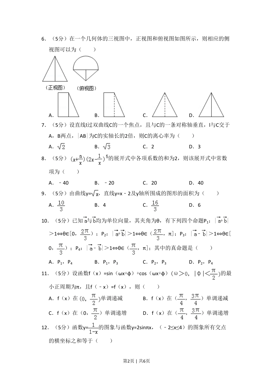 第1页|共6页2011年全国统一高考数学试卷(理科)(新课标)一、选择题(共12小题,每小题5分,满分60分)1.(5分)复数的共轭复数是()A.B.C.﹣iD.i2.(5分)下列函数中,既是偶函数又在(0,+∞)上单调递增的函数是()A.y=2x3B.y=|x|+1C.y=﹣x2+4D.y=2﹣|x|3.(5分)执行如图的程序框图,如果输入的N是6,那么输出的p是()A.120B.720C.1440D.50404.(5分)有3个兴趣小组,甲、乙两位同学各自参加其中一个小组,每位同学参加各个小组的可能性相同,则这两位同学参加同一个兴趣小组的概率为()A.B.C.D.5.(5分)已知角θ的顶点与原点重合,始边与x轴的正半轴重合,终边在直线y=2x上,则cos2θ=()A.﹣B.﹣C.D.第2页|共6页6.(5分)在一个几何体的三视图中,正视图和俯视图如图所示,则相应的侧视图可以为()A.B.C.D.7.(5分)设直线l过双曲线C的一个焦点,且与C的一条对称轴垂直,l与C交于A,B两点,|AB|为C的实轴长的2倍,则C的离心率为()A.B.C.2D.38.(5分)的展开式中各项系数的和为2,则该展开式中常数项为()A.﹣40B.﹣20C.20D.409.(5分)由曲线y=,直线y=x﹣2及y轴所围成的图形的面积为()A.B.4C.D.610.(5分)已知与均为单位向量,其夹角为θ,有下列四个命题P1:|+|>1⇔θ∈[0,);P2:|+|>1⇔θ∈(,π];P3:|﹣|>1⇔θ∈[0,);P4:|﹣|>1⇔θ∈(,π];其中的真命题是()A.P1,P4B.P1,P3C.P2,P3D.P2,P411.(5分)设函数f(x)=sin(ωx+φ)+cos(ωx+φ)的最小正周期为π,且f(﹣x)=f(x),则()A.f(x)在单调递减B.f(x)在(,)单调递减C.f(x)在(0,)单调递增D.f(x)在(,)单调递增12.(5分)函数y=的图象与函数y=2sinπx,(﹣2≤x≤4)的图象所有交点的横坐标之和等于()第3页|共6页A.8B.6C.4D.2二、填空题(共4小题,每小题5分,满分20分)13.(5分)若变量x,y满足约束条件,则z=x+2y的最小值为.14.(5分)在平面直角坐标系xOy,椭圆C的中心为原点,焦点F1F2在x轴上,离心率为.过Fl的直线交于A,B两点,且△ABF2的周长为16,那么C的方程为.15.(5分)已知矩形ABCD的顶点都在半径为4的球O的球面上,且AB=6,BC=2,则棱锥O﹣ABCD的体积为.16.(5分)在△ABC中,B=60°,AC=,则AB+2BC的最大值为.三、解答题(共8小题,满分70分)17.(12分)等比数列{an}的各项均为正数,且2a1+3a2=1,a32=9a2a6,(Ⅰ)求数列{an}的通项公式;(Ⅱ)设bn=log3a1+log3a2+…+log3an,求数列{}的前n项和.18.(12分)如图,四棱锥P﹣ABCD中,底面ABCD为平行四边形,∠DAB=60°,AB=2AD,PD⊥底面ABCD.(Ⅰ)证明:PA⊥BD;(Ⅱ)若PD=AD,求二面角A﹣PB﹣C的余弦值.第4页|共6页19.(12分)某种产品的质量以其质量指标值衡量,质量指标值越大表明质量越好,且质量指标值大于或等于102的产品为优质品,现用两种新配方(分别称为A配方和B配方)做试验,各生产了100件这种产品,并测量了每件产品的质量指标值,得到下面试验结果:A配方的频数分布表指标值分组[90,94)[94,98)[98,102)[102,106)[106,110]频数82042228B配方的频数分布表指标值分组[90,94)[94,98)[98,102)[102,106)[106,110]频数412423210(Ⅰ)分别估计用A配方,B配方生产的产品的优质品率;(Ⅱ)已知用B配方生成的一件产品的利润y(单位:元)与其质量指标值t的关系式为y=从用B配方生产的产品中任取一件,其利润记为X(单位:元),求X的分布列及数学期望.(以试验结果中质量指标值落入各组的频率作为一件产品的质量指标值落入相应组的概率)第5页|共6页20.(12分)在平面直角坐标系xOy中,已知点A(0,﹣1),B点在直线y=﹣3上,M点满足∥,=•,M点的轨迹为曲线C.(Ⅰ)求C的方程;(Ⅱ)P为C上的动点,l为C在P点处的切线,求O点到l距离的最小值.21.(12分)已知函数f(x)=+,曲线y=f(x)在点(1,f(1))处的切线方程为x+2y﹣3=0.(Ⅰ)求a、b的值;(Ⅱ)如果当x>0,且x≠1时,f(x)>+,求k的取值范围.22.(10分)如图,D,E分别为△ABC的边AB,AC上的点,且不与...
