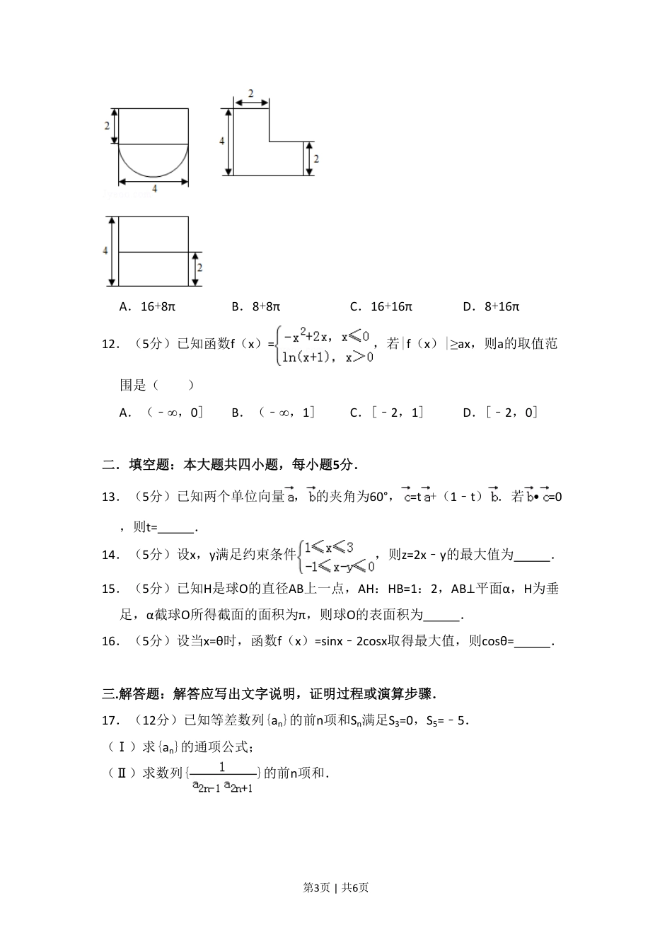 第1页|共6页2013年全国统一高考数学试卷(文科)(新课标Ⅰ)一、选择题共12小题.每小题5分,共60分.在每个小题给出的四个选项中,只有一项是符合题目要求的一项.1.(5分)已知集合A={1,2,3,4},B={x|x=n2,n∈A},则A∩B=()A.{1,4}B.{2,3}C.{9,16}D.{1,2}2.(5分)=()A.﹣1﹣iB.﹣1+iC.1+iD.1﹣i3.(5分)从1,2,3,4中任取2个不同的数,则取出的2个数之差的绝对值为2的概率是()A.B.C.D.4.(5分)已知双曲线C:(a>0,b>0)的离心率为,则C的渐近线方程为()A.y=B.y=C.y=±xD.y=5.(5分)已知命题p:∀x∈R,2x<3x;命题q:∃x∈R,x3=1﹣x2,则下列命题中为真命题的是()A.p∧qB.¬p∧qC.p∧¬qD.¬p∧¬q6.(5分)设首项为1,公比为的等比数列{an}的前n项和为Sn,则()A.Sn=2an﹣1B.Sn=3an﹣2C.Sn=4﹣3anD.Sn=3﹣2an7.(5分)执行程序框图,如果输入的t∈[﹣1,3],则输出的s属于()第2页|共6页A.[﹣3,4]B.[﹣5,2]C.[﹣4,3]D.[﹣2,5]8.(5分)O为坐标原点,F为抛物线C:y2=4x的焦点,P为C上一点,若|PF|=4,则△POF的面积为()A.2B.2C.2D.49.(5分)函数f(x)=(1﹣cosx)sinx在[﹣π,π]的图象大致为()A.B.C.D.10.(5分)已知锐角△ABC的内角A,B,C的对边分别为a,b,c,23cos2A+cos2A=0,a=7,c=6,则b=()A.10B.9C.8D.511.(5分)某几何体的三视图如图所示,则该几何体的体积为()第3页|共6页A.16+8πB.8+8πC.16+16πD.8+16π12.(5分)已知函数f(x)=,若|f(x)|≥ax,则a的取值范围是()A.(﹣∞,0]B.(﹣∞,1]C.[﹣2,1]D.[﹣2,0]二.填空题:本大题共四小题,每小题5分.13.(5分)已知两个单位向量,的夹角为60°,=t+(1﹣t).若•=0,则t=.14.(5分)设x,y满足约束条件,则z=2x﹣y的最大值为.15.(5分)已知H是球O的直径AB上一点,AH:HB=1:2,AB⊥平面α,H为垂足,α截球O所得截面的面积为π,则球O的表面积为.16.(5分)设当x=θ时,函数f(x)=sinx﹣2cosx取得最大值,则cosθ=.三.解答题:解答应写出文字说明,证明过程或演算步骤.17.(12分)已知等差数列{an}的前n项和Sn满足S3=0,S5=﹣5.(Ⅰ)求{an}的通项公式;(Ⅱ)求数列{}的前n项和.第4页|共6页18.(12分)为了比较两种治疗失眠症的药(分别成为A药,B药)的疗效,随机地选取20位患者服用A药,20位患者服用B药,这40位患者服用一段时间后,记录他们日平均增加的睡眠时间(单位:h)实验的观测结果如下:服用A药的20位患者日平均增加的睡眠时间:0.61.22.71.52.81.82.22.33.23.52.52.61.22.71.52.93.03.12.32.4服用B药的20位患者日平均增加的睡眠时间:3.21.71.90.80.92.41.22.61.31.41.60.51.80.62.11.12.51.22.70.5(Ⅰ)分别计算两种药的平均数,从计算结果看,哪种药的疗效更好?(Ⅱ)根据两组数据完成下面茎叶图,从茎叶图看,哪种药的疗效更好?19.(12分)如图,三棱柱ABC﹣A1B1C1中,CA=CB,AB=AA1,∠BAA1=60°(Ⅰ)证明:AB⊥A1C;(Ⅱ)若AB=CB=2,A1C=,求三棱柱ABC﹣A1B1C1的体积.第5页|共6页20.(12分)已知函数f(x)=ex(ax+b)﹣x2﹣4x,曲线y=f(x)在点(0,f(0))处切线方程为y=4x+4.(Ⅰ)求a,b的值;(Ⅱ)讨论f(x)的单调性,并求f(x)的极大值.21.(12分)已知圆M:(x+1)2+y2=1,圆N:(x﹣1)2+y2=9,动圆P与圆M外切并与圆N内切,圆心P的轨迹为曲线C.(Ⅰ)求C的方程;(Ⅱ)l是与圆P,圆M都相切的一条直线,l与曲线C交于A,B两点,当圆P的半径最长时,求|AB|.请考生在第22、23、24三题中任选一题作答。注意:只能做所选定的题目。如果多做,则按所做的第一个题目计分,作答时请用2B铅笔在答题卡上将所选题号后的方框涂黑。22.(10分)(选修4﹣1:几何证明选讲)如图,直线AB为圆的切线,切点为B,点C在圆上,∠ABC的角平分线BE交圆于点E,DB垂直BE交圆于D.(Ⅰ)证明:DB=DC;(Ⅱ)设圆的半径为1,BC=,延长CE交AB于点F,求△BCF外接圆的半径.第6页|共6页23.已知曲线C1的参数方程为(t为参数),以坐标原点为极点,x轴的正半轴为极轴建立极坐标系,曲线C2的极坐标方程为ρ=2sinθ.(1)把C1的参数方程化为极坐标方程;(2)求C1与C2交点的极坐标(ρ≥0,0≤θ<2π).24.已知函数f(x)=|2x﹣1|+|2x+a|,g(x)=x+3.(Ⅰ)当a=﹣2时,求不等式f(x)<g(x)的解集;(Ⅱ)设a>﹣1,且当x∈[﹣,]时,f(x)≤g(x),求a的取值范围.
