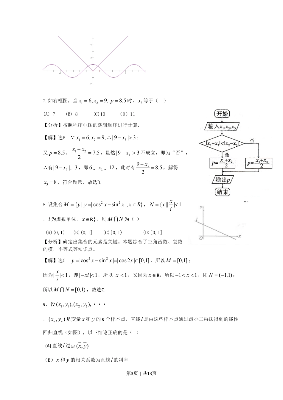 第1页|共13页2011年普通高等学校招生全国统一考试·陕西卷(文科)全解全析一、选择题:在每小题给出的四个选项中,只有一项是符合题目要求的(本大题共10小题,每小题5分,共50分).1.设ar,br是向量,命题“若ab=-rr,则||||ab=rr”的逆命题是()(A)若ab¹-rr,则||||ab¹rr(B)若ab=-rr,则||||ab¹rr(C)若||||ab¹rr,则ab¹-rr(D)若||||ab=rr,则ab=-rr【分析】首先确定原命题的条件和结论,然后交换条件和结论的位置即可得到逆命题。【解】选D原命题的条件是ab=-rr,作为逆命题的结论;原命题的结论是||||ab=rr,作为逆命题的条件,即得逆命题“若||||ab=rr,则ab=-rr”,故选D.2.设抛物线的顶点在原点,准线方程为2x=-,则抛物线的方程是()(A)28yx=-(B)24yx=-(C)28yx=(D)24yx=【分析】由准线确定抛物线的位置和开口方向是判断的关键.【解】选C由准线方程2x=-得22p-=-,且抛物线的开口向右(或焦点在x轴的正半轴),所以228ypxx==.3.设0ab<<,则下列不等式中正确的是()(A)2ababab+<<<(B)2abaabb+<<<(c)2abaabb+<<<(D)2ababab+<<<【分析】根据不等式的性质,结合作差法,放缩法,基本不等式或特殊值法等进行比较.【解】选B(方法一)已知ab<和2abab+<,比较a与ab,因为22()()0aabaab-=-<,所以aab<,同理由22()()0babbba-=->得abb<;作差法:022abbab+--=>,所以2abb+<,综上可得2abaabb+<<<;故选B.(方法二)取2a=,8b=,则4ab=,52ab+=,所以2abaabb+<<<.第2页|共13页4.函数13yx=的图像是()【分析】已知函数解析式和图像,可以用取点验证的方法判断.【解】选B取18x=,18-,则12y=,12-,选项B,D符合;取1x=,则1y=,选项B符合题意.5.某几何体的三视图如图所示,则它的体积是()(A)283p-(B)83p-(C)8-2π(D)23p【分析】根据已知的三视图想象出空间几何体,然后由几何体的组成和有关几何体体积公式进行计算.【解】选A由几何体的三视图可知几何体为一个组合体,即一个正方体中间去掉一个圆锥体,所以它的体积是3218222833Vpp=-´´´=-.6.方程cosxx=在,-¥+¥内()(A)没有根(B)有且仅有一个根(C)有且仅有两个根(D)有无穷多个根【分析】数形结合法,构造函数并画出函数的图象,观察直观判断.【解】选C构造两个函数||yx=和cosyx=,在同一个坐标系内画出它们的图像,如图所示,观察知图像有两个公共点,所以已知方程有且仅有两个根.第3页|共13页7.如右框图,当126,9,xx==8.5p=时,3x等于()(A)7(B)8(C)10(D)11【分析】按照程序框图的逻辑顺序进行计算.【解】选B 126,9,xx==∴3|9|3x->;又8.5p=,127.52xx+=,显然3|9|3x->不成立,即为“否”,∴有3|9|3x-„,即3612x„„,此时有398.52x+=,解得38x=,符合题意,故选B.8.设集合22{||cossin|,}MyyxxxR==-Î,{|||1xNxi=<,i为虚数单位,xÎR},则MNI为()(A)(0,1)(B)(0,1](C)[0,1)(D)[0,1]【分析】确定出集合的元素是关键。本题综合了三角函数、复数的模,不等式等知识点。【解】选C22|cossin||cos2|[0,1]yxxx=-=Î,所以[0,1]M=;因为||1xi<,即||1xi-<,所以||1x<,又因为xÎR,所以11x-<<,即(1,1)N=-;所以[0,1)MN=I,故选C.9.设1122(,),(,),xyxy···,(,)nnxy是变量x和y的n个样本点,直线l是由这些样本点通过最小二乘法得到的线性回归直线(如图),以下结论正确的是()(A)直线l过点(,)xy(B)x和y的相关系数为直线l的斜率第4页|共13页(C)x和y的相关系数在0到1之间(D)当n为偶数时,分布在l两侧的样本点的个数一定相同【分析】根据最小二乘法的有关概念:样本点的中心,相关系数线,性回归方程的意义等进行判断.【解】选A选项具体分析结论A回归直线l一定过样本点中心(,)xy;由回归直线方程的计算公式aybx=-可知直线l必过点(,)xy正确B相关系数用来衡量两个变量之间的相关程度,直线的斜率表示直线的倾斜程度;它们的计算公式也不相同不正确C相关系数的值有正有负,还可以是0;当相关系数在0到1之间时,两个变量为正相关,在1-到0之间时,两个变量负相关不正确Dl两侧的样本点的个数分布与n的奇偶性无关,也不一定是平均分布不正确10.植树节某班20名同学在...
