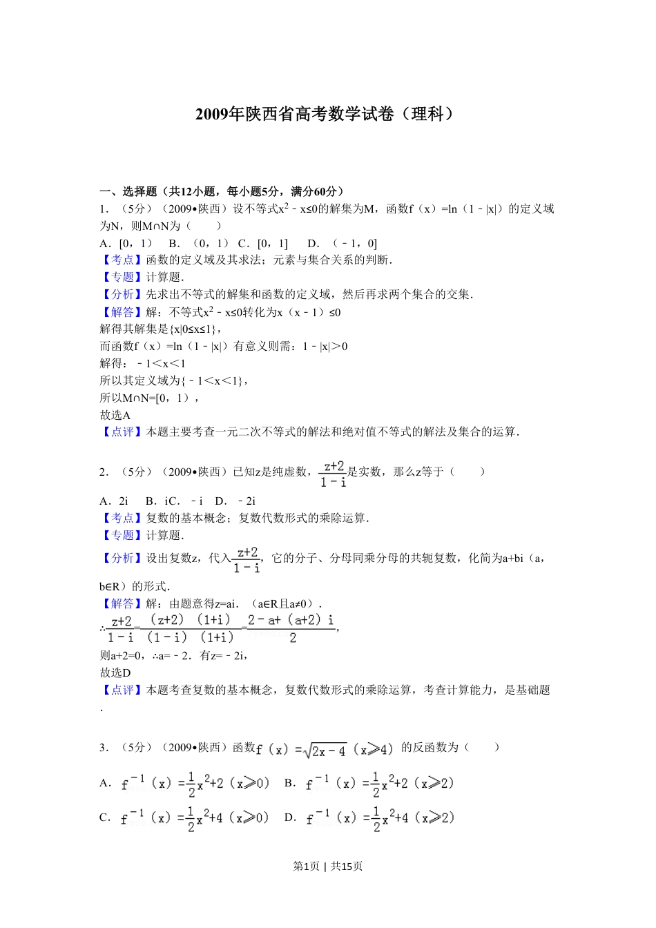 第1页|共15页2009年陕西省高考数学试卷(理科)一、选择题(共12小题,每小题5分,满分60分)1.(5分)(2009•陕西)设不等式x2﹣x≤0的解集为M,函数f(x)=ln(1﹣|x|)的定义域为N,则M∩N为()A.[0,1)B.(0,1)C.[0,1]D.(﹣1,0]【考点】函数的定义域及其求法;元素与集合关系的判断.菁优网版权所有【专题】计算题.【分析】先求出不等式的解集和函数的定义域,然后再求两个集合的交集.【解答】解:不等式x2﹣x≤0转化为x(x﹣1)≤0解得其解集是{x|0≤x≤1},而函数f(x)=ln(1﹣|x|)有意义则需:1﹣|x|>0解得:﹣1<x<1所以其定义域为{﹣1<x<1},所以M∩N=[0,1),故选A【点评】本题主要考查一元二次不等式的解法和绝对值不等式的解法及集合的运算.2.(5分)(2009•陕西)已知z是纯虚数,是实数,那么z等于()A.2iB.iC.﹣iD.﹣2i【考点】复数的基本概念;复数代数形式的乘除运算.菁优网版权所有【专题】计算题.【分析】设出复数z,代入,它的分子、分母同乘分母的共轭复数,化简为a+bi(a,b∈R)的形式.【解答】解:由题意得z=ai.(a∈R且a≠0).∴==,则a+2=0,∴a=﹣2.有z=﹣2i,故选D【点评】本题考查复数的基本概念,复数代数形式的乘除运算,考查计算能力,是基础题.3.(5分)(2009•陕西)函数的反函数为()A.B.C.D.第2页|共15页【考点】反函数.菁优网版权所有【专题】应用题.【分析】从条件中函数式数反解出x,再将x,y互换即得对数函数的函数,再依据互为反函数间的定义域与值域的关系求得反函数的定义域即可.【解答】解:,逐一验证,知B正确.故选B.【点评】求反函数,一般应分以下步骤:(1)由已知解析式y=f(x)反求出x=Ф(y);(2)交换x=Ф(y)中x、y的位置;(3)求出反函数的定义域(一般可通过求原函数的值域的方法求反函数的定义域).4.(5分)(2009•陕西)过原点且倾斜角为60°的直线被圆x2+y2﹣4y=0所截得的弦长为()A.B.2C.D.2【考点】直线的倾斜角;直线和圆的方程的应用.菁优网版权所有【专题】计算题.【分析】本题考查的知识点是直线与圆方程的应用,由已知圆x2+y2﹣4y=0,我们可以将其转化为标准方程的形式,求出圆心坐标和半径,又直线由过原点且倾斜角为60°,得到直线的方程,再结合半径、半弦长、弦心距满足勾股定理,即可求解.【解答】解:将圆x2+y2﹣4y=0的方程可以转化为:x2+(y﹣2)2=4,即圆的圆心为A(0,2),半径为R=2,∴A到直线ON的距离,即弦心距为1,∴ON=,∴弦长2,故选D.【点评】要求圆到割线的距离,即弦心距,我们最常用的性质是:半径、半弦长(BE)、弦心距(OE)构成直角三角形,满足勾股定理,求出半径和半弦长,代入即可求解.5.(5分)(2009•陕西)若3sinα+cosα=0,则的值为()A.B.C.D.﹣2第3页|共15页【考点】二倍角的余弦;同角三角函数基本关系的运用.菁优网版权所有【专题】计算题.【分析】首先考虑由3sinα+cosα=0求的值,可以联想到解sinα,cosα的值,在根据半角公式代入直接求解,即得到答案.【解答】解析:由3sinα+cosα=0⇒cosα≠0且tanα=﹣所以故选A.【点评】此题主要考查同角三角函数基本关系的应用,在三角函数的学习中要注重三角函数一系列性质的记忆和理解,在应用中非常广泛.6.(5分)(2009•陕西)若(1﹣2x)2009=a0+a1x+…+a2009x2009(x∈R),则的值为()A.2B.0C.﹣1D.﹣2【考点】二项式定理的应用.菁优网版权所有【专题】计算题;压轴题.【分析】通过给x赋值,0得到两等式,两式相减即得.【解答】解:令x=得0=令x=0得1=a0两式相减得=﹣1故选项为C【点评】本题考查赋值法是求展开式的系数和问题的重要方法.7.(5分)(2009•陕西)”m>n>0”是”方程mx2+ny2=1表示焦点在y轴上的椭圆”的()A.充分而不必要条件B.必要而不充分条件C.充要条件D.既不充分也不必要条件【考点】椭圆的应用.菁优网版权所有【专题】常规题型.【分析】将方程mx2+ny2=1转化为,然后根据椭圆的定义判断.第4页|共15页【解答】解:将方程mx2+ny2=1转化为,根据椭圆的定义,要使焦点在y轴上必须满足,且,即m>n...
