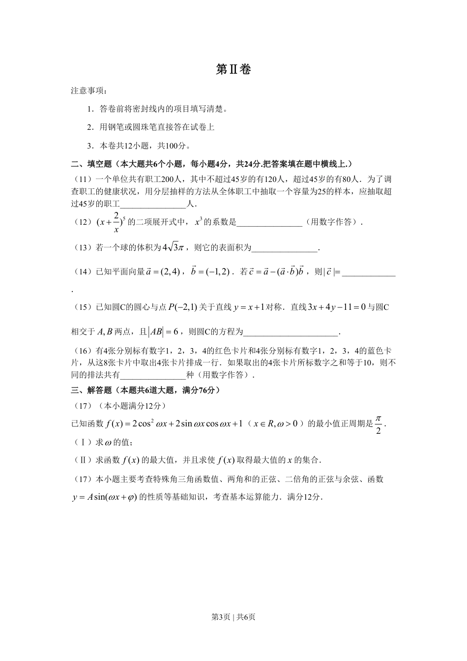 第1页|共6页绝密★启用前2008年普通高等学校招生全国统一考试(天津卷)数学(文史类)本试卷分第Ⅰ卷(选择题)和第Ⅱ卷(非选择题)两部分,共150分,考试用时120分钟。第Ⅰ卷1至2页,第Ⅱ卷3至10页。考试结束后,将本试卷和答题卡一并交回。祝各位考生考试顺利!第Ⅰ卷注意事项:1.答第Ⅰ卷前,考生务必将自己的姓名、准考证号、科目涂写在答题卡上,并在规定位置粘贴考试用条形码。2.每小题选出答案后,用铅笔把答题卡上对应题目的答案标号涂黑。如需改动,用橡皮擦干净后,再选涂其他答案标号。答在试卷上的无效。3.本卷共10小题,每小题5分,共50分。参考公式:如果时间A,B互斥,那么球的表面积公式P(A+B)=P(A)+P(B)24SRp=.如果事件A,B相互独立,那么其中R表示球的半径.P(A·B)=P(A)·P(B)一、选择题:在每小题给出的四个选项中只有一项是符合题目要求的.(1)设集合|0{8}xxNU=Î<£,{1,2,4,5}S=,{3,5,7}T=,则()UST=Ið(A){1,2,4}(B){1,2,3,4,5,7}(C){1,2}(D){1,2,4,5,6,8}(2)设变量yx,满足约束条件£1210yxyxyx,则目标函数yxz=5的最大值为(A)2(B)3(C)4(D)5第2页|共6页(3)函数1yx=(04x££)的反函数是(A)2(1)yx=(13x££)(B)2(1)yx=(04x££)(C)21yx=(13x££)(D)21yx=(04x££)(4)若等差数列{}na的前5项和525S=,且23a=,则7a=(A)12(B)13(C)14(D)15(5)设ba,是两条直线,,是两个平面,则ba的一个充分条件是(A),//,ba(B)//,,ba(C)//,,ba(D),//,ba(6)把函数sinyx=(xRÎ)的图象上所有点向左平行移动3p个单位长度,再把所得图象上所有点的横坐标缩短到原来的12倍(纵坐标不变),得到的图象所表示的函数是(A)sin(2)3yxp=,xRÎ(B)sin()26xyp=,xRÎ(C)sin(2)3yxp=,xRÎ(D)sin(2)32yxp=,xRÎ(7)设椭圆22221xymn=(0m>,0n>)的右焦点与抛物线28yx=的焦点相同,离心率为12,则此椭圆的方程为(A)2211216xy=(B)2211612xy=(C)2214864xy=(D)2216448xy=(8)已知函数2,0()2,0xxfxxx=>£,则不等式2()fxx的解集是(A)[1,1](B)[2,2](C)[2,1](D)[1,2](9)设5sin7ap=,2cos7bp=,2tan7cp=,则(A)cba<<(B)acb<<(C)acb<<(D)bac<<(10)设1a>,若对于任意的[,2]xaaÎ,都有2[,]yaaÎ满足方程loglog3aaxy=,这时a的取值集合为(A)2{|1}aa<£(B){|}2aa(C)3|}2{aa££(D){2,3}第3页|共6页第Ⅱ卷注意事项:1.答卷前将密封线内的项目填写清楚。2.用钢笔或圆珠笔直接答在试卷上3.本卷共12小题,共100分。二、填空题(本大题共6个小题,每小题4分,共24分.把答案填在题中横线上.)(11)一个单位共有职工200人,其中不超过45岁的有120人,超过45岁的有80人.为了调查职工的健康状况,用分层抽样的方法从全体职工中抽取一个容量为25的样本,应抽取超过45岁的职工________________人.(12)52()xx的二项展开式中,3x的系数是________________(用数字作答).(13)若一个球的体积为p34,则它的表面积为________________.(14)已知平面向量(2,4)a=r,(1,2)b=r.若()caabb=×rrrrr,则||c=r_____________.(15)已知圆C的圆心与点(2,1)P关于直线1yx=对称.直线34110xy=与圆C相交于BA,两点,且6=AB,则圆C的方程为_______________________.(16)有4张分别标有数字1,2,3,4的红色卡片和4张分别标有数字1,2,3,4的蓝色卡片,从这8张卡片中取出4张卡片排成一行.如果取出的4张卡片所标数字之和等于10,则不同的排法共有________________种(用数字作答).三、解答题(本题共6道大题,满分76分)(17)(本小题满分12分)已知函数22s(incoss1)2cofxxxxwww=(,0xRwÎ>)的最小值正周期是2p.(Ⅰ)求w的值;(Ⅱ)求函数()fx的最大值,并且求使()fx取得最大值的x的集合.(17)本小题主要考查特殊角三角函数值、两角和的正弦、二倍角的正弦与余弦、函数sin()yAxwj=的性质等基础知识,考查基本运算能力....