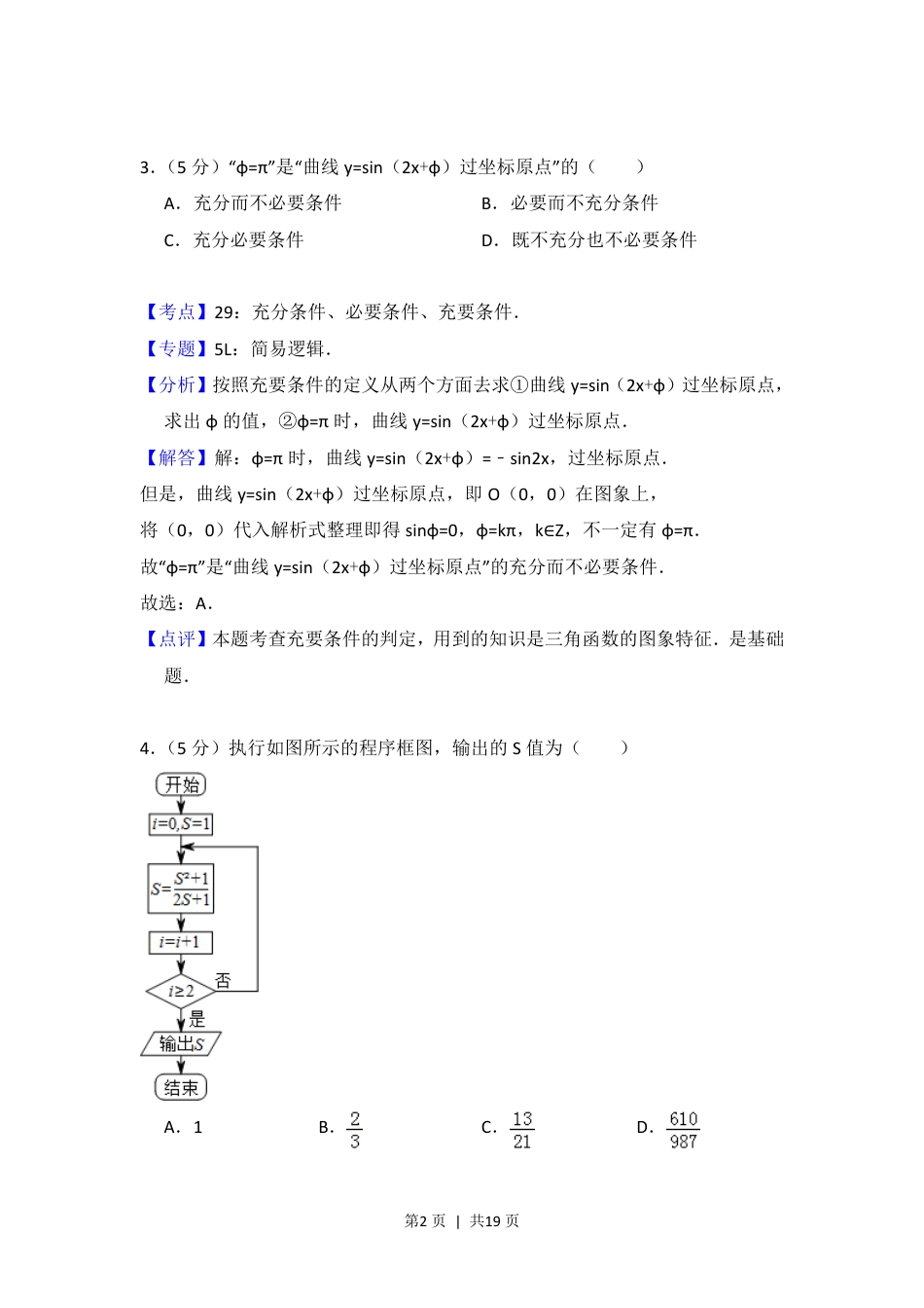 第1页|共19页2013年北京市高考数学试卷(理科)参考答案与试题解析一、选择题共8小题,每小题5分,共40分.在每小题列出的四个选项中,选出符合题目要求的一项.1.(5分)已知集合A={﹣1,0,1},B={x|﹣1≤x<1},则A∩B=()A.{0}B.{﹣1,0}C.{0,1}D.{﹣1,0,1}【考点】1E:交集及其运算.菁优网版权所有【专题】5J:集合.【分析】找出A与B的公共元素,即可确定出两集合的交集.【解答】解: A={﹣1,0,1},B={x|﹣1≤x<1},∴A∩B={﹣1,0}.故选:B.【点评】此题考查了交集及其运算,熟练掌握交集的定义是解本题的关键.2.(5分)在复平面内,复数(2﹣i)2对应的点位于()A.第一象限B.第二象限C.第三象限D.第四象限【考点】A4:复数的代数表示法及其几何意义.菁优网版权所有【专题】5N:数系的扩充和复数.【分析】化简复数为代数形式,求出复数对应点的坐标,即可判断复数对应点所在象限.【解答】解:复数(2﹣i)2=4﹣4i+i2=3﹣4i,复数对应的点(3,﹣4),所以在复平面内,复数(2﹣i)2对应的点位于第四象限.故选:D.【点评】本题考查复数的代数形式的混合运算,复数的几何意义,考查计算能力.第2页|共19页3.(5分)“φ=π”是“曲线y=sin(2x+φ)过坐标原点”的()A.充分而不必要条件B.必要而不充分条件C.充分必要条件D.既不充分也不必要条件【考点】29:充分条件、必要条件、充要条件.菁优网版权所有【专题】5L:简易逻辑.【分析】按照充要条件的定义从两个方面去求①曲线y=sin(2x+φ)过坐标原点,求出φ的值,②φ=π时,曲线y=sin(2x+φ)过坐标原点.【解答】解:φ=π时,曲线y=sin(2x+φ)=﹣sin2x,过坐标原点.但是,曲线y=sin(2x+φ)过坐标原点,即O(0,0)在图象上,将(0,0)代入解析式整理即得sinφ=0,φ=kπ,k∈Z,不一定有φ=π.故“φ=π”是“曲线y=sin(2x+φ)过坐标原点”的充分而不必要条件.故选:A.【点评】本题考查充要条件的判定,用到的知识是三角函数的图象特征.是基础题.4.(5分)执行如图所示的程序框图,输出的S值为()A.1B.C.D.第3页|共19页【考点】EF:程序框图.菁优网版权所有【专题】5K:算法和程序框图.【分析】从框图赋值入手,先执行一次运算,然后判断运算后的i的值与2的大小,满足判断框中的条件,则跳出循环,否则继续执行循环,直到条件满足为止.【解答】解:框图首先给变量i和S赋值0和1.执行,i=0+1=1;判断1≥2不成立,执行,i=1+1=2;判断2≥2成立,算法结束,跳出循环,输出S的值为.故选:C.【点评】本题考查了程序框图,考查了直到型结构,直到型循环是先执行后判断,不满足条件执行循环,直到条件满足结束循环,是基础题.5.(5分)函数f(x)的图象向右平移1个单位长度,所得图象与曲线y=ex关于y轴对称,则f(x)=()A.ex+1B.ex﹣1C.e﹣x+1D.e﹣x﹣1【考点】36:函数解析式的求解及常用方法;3A:函数的图象与图象的变换.菁优网版权所有【专题】51:函数的性质及应用.【分析】首先求出与函数y=ex的图象关于y轴对称的图象的函数解析式,然后换x为x+1即可得到要求的答案.【解答】解:函数y=ex的图象关于y轴对称的图象的函数解析式为y=e﹣x,而函数f(x)的图象向右平移1个单位长度,所得图象与曲线y=ex的图象关于y轴对称,所以函数f(x)的解析式为y=e﹣(x+1)=e﹣x﹣1.即f(x)=e﹣x﹣1.故选:D.【点评】本题考查了函数解析式的求解与常用方法,考查了函数图象的对称变换第4页|共19页和平移变换,函数图象的平移遵循“左加右减,上加下减”的原则,是基础题.6.(5分)若双曲线的离心率为,则其渐近线方程为()A.y=±2xB.C.D.【考点】KC:双曲线的性质.菁优网版权所有【专题】5D:圆锥曲线的定义、性质与方程.【分析】通过双曲线的离心率,推出a、b关系,然后直接求出双曲线的渐近线方程.【解答】解:由双曲线的离心率,可知c=a,又a2+b2=c2,所以b=a,所以双曲线的渐近线方程为:y==±x.故选:B.【点评】本题考查双曲线的基本性质,渐近线方程的求法,考查计算能力.7.(5分)直线l过抛物线C:x2=4y的焦点且与y轴垂直,则l与C所...