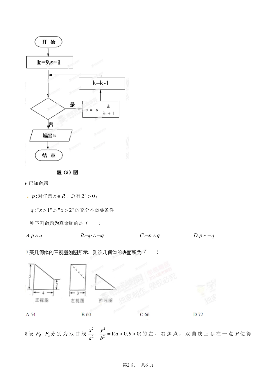 第1页|共6页一.选择题:本大题共10小题,每小题5分,共50分.在每小题给出的四个选项中,只有一项是符合题目要求的.1.复平面内表示复数(12)ii-的点位于().A第一象限.B第二象限.C第三象限.D第四象限2.对任意等比数列{}na,下列说法一定正确的是()139.,,Aaaa成等比数列236.,,Baaa成等比数列248.,,Caaa成等比数列369.,,Daaa成等比数列4.已知向量(,3),(1,4),(2,1)akbc===rrr,且(23)abc-rrr,则实数k=()9.2A-.0B.C3D.1525.执行如题(5)图所示的程序框图,若输出k的值为6,则判断框内可填入的条件是()A.12sB.35sC.710sD.45s第2页|共6页6.已知命题:p对任意xRÎ,总有20x;:"1"qx是"2"x的充分不必要条件则下列命题为真命题的是().ApqÙ.BpqØÙØ.CpqØÙ.DpqÙØ8.设21FF,分别为双曲线)0,0(12222=-babyax的左、右焦点,双曲线上存在一点P使得第3页|共6页,49||||,3||||2121abPFPFbPFPF==则该双曲线的离心率为()A.34B.35C.49D.39.某次联欢会要安排3个歌舞类节目、2个小品类节目和1个相声类节目的演出顺序,则同类节目不相邻的排法种数是()A.72B.120C.144D.168[来源:学科网]10.已知ABC的内角21)sin()sin(2sin,--=-BACCBAACBA满足,,面积S满足CBAcbaS,,,,21分别为,记所对的边,则下列不等式一定成立的是()A.8)(cbbcB.()162acabC.126abcD.1224abc二、填空题.考生注意:14、15、16三题为选做题,请从中任选两题作答,若三题全做,则按前两题给分.[来源:学,科,网]14.过圆外一点P作圆的切线PA(A为切点),再作割线PBC分别交圆于B、C,若6=PA,[来源:学_科_网]AC=8,BC=9,则AB=________.15.已知直线l的参数方程为==tytx32(t为参数),以坐标原点为极点,x轴的正半轴为极轴建立极坐标系,曲线C的极坐标方程为2sin4cos00,02rqqrqp-=³<,则直线l与曲线C的公共点的极径=r________.16.若不等式2212122³-aaxx对任意实数x恒成立,则实数a的取值范围是____________.三、解答题:本大题共6小题,共75分.解答应写出文字说明,证明过程或演算步骤.[来源:Zxxk.Com]17.(本小题13分,(I)小问5分,(II)小问8分)已知函数<-=220sin3pp,xxf的图像关于直线3p=x对称,且图像上相邻两个最高点的距离为p.第4页|共6页(I)求和的值;(II)若<<=326432ppf,求23cosp的值.19.(本小题满分13分,(Ⅰ)小问6分,(Ⅱ)小问7分)如题(19)图,四棱锥ABCDP-中,底面是以O为中心的菱形,PO底面ABCD,3,2p==BADAB,M为BC上一点,且APMPBM=,21.(Ⅰ)求PO的长;(Ⅱ)求二面角CPMA--的正弦值.20.(本小题满分12分,(Ⅰ)小问4分,(Ⅱ)小问3分,(Ⅲ)小问5分)[来源:学科网]已知函数22()(,,)xxfxaebecxabcR-=--Î的导函数'()fx为偶函数,且曲线()yfx=在点(0,(0))f处的切线的斜率为4c-.第5页|共6页(Ⅰ)确定,ab的值;(Ⅱ)若3c=,判断()fx的单调性;(Ⅲ)若()fx有极值,求c的取值范围.21.(本小题满分12分,(Ⅰ)小问5分,(Ⅱ)小问7分)如题(21)图,设椭圆22221(0)xyabab=的左、右焦点分别为12,FF,点D在椭圆上,112DFFF,121||22||FFDF=,12DFF的面积为22.(Ⅰ)求该椭圆的标准方程;(Ⅱ)设圆心在y轴上的圆与椭圆在x轴的上方有两个交点,且圆在这两个交点处的两条切线相互垂直并分别过不同的焦点,求圆的半径..第6页|共6页