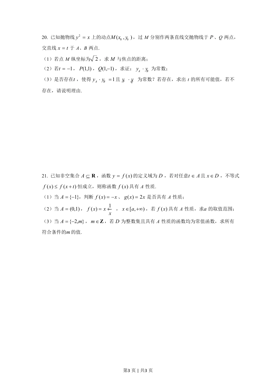 第1页|共3页2020年上海市春季高考数学试卷2020.01一.填空题(本大题共12题,满分54分,第1~6题每题4分,第7~12题每题5分)1.集合A{1,3},B{1,2,a},若AB,则a12.不等式3的解集为x3.函数ytan2x的最小正周期为4.已知复数z满足z2z6i,则z的实部为5.已知3sin2x2sinx,x(0,),则x1ya3x为偶函数,则a6.若函数3x7.已知直线l:xay1,l:axy1,若l∥l,则l与l的距离为1212128.已知二项式(2xx)5,则展开式中x3的系数为9.三角形ABC中,D是BC中点,AB2,BC3,AC4,则ADAB10.已知A{3,2,1,0,1,2,3},a、bA,则|a||b|的情况有种11.已知A、A、A、A、A五个点,满足AAAA0(n1,2,3),12345nn1n1n2|AA||AA|n1(n1,2,3),则|AA|的最小值为nn1n1n21512.已知f(x)x1,其反函数为f1(x),若f(x)af(xa)有实数根,则a的1取值范围为二.选择题(本大题共4题,每题5分,共20分)3n5n13.计算:lim()3n15n1n535A.3B.C.D.5314.“”是“sinA.充分非必要条件C.充要条件2cos21”的()B.必要非充分条件D.既非充分又非必要条件x2y21,作垂直于x轴的垂线交椭圆于A、B两点,作垂直于y轴的垂线交椭圆于C、D两点,且ABCD,两垂线相交于点P,则点P的轨迹是(A.椭圆B.双曲线C.圆D.抛物线15.已知椭圆2)第2页|共3页anan116.数列{an}各项均为实数,对任意nN*满足an3an,且行列式c为定an2an3值,则下列选项中不可能的是()A.a11,c1B.a12,c2C.a11,c4D.a12,c0三.解答题(本大题共5题,共14+14+14+16+18=76分)17.已知四棱锥PABCD,底面ABCD为正方形,边长为3,PD⊥平面ABCD.(1)若PC5,求四棱锥PABCD的体积;(2)若直线AD与BP的夹角为60°,求PD的长.18.已知各项均为正数的数列{a},其前n项和为S,a1.nn1(1)若数列{a}为等差数列,S70,求数列{a}的通项公式;n10n1(2)若数列{a}为等比数列,a,求满足S100a时n的最小值.n4nn819.有一条长为120米的步行道OA,A是垃圾投放点1,若以O为原点,OA为x轴正半轴建立直角坐标系,设点B(x,0),现要建设另一座垃圾投放点(t,0),函数f(x)表示与2tB点距离最近的垃圾投放点的距离.(1)若t60,求f(10)、f(80)、f(95)的值,并写出f(x)的函数解析式;60606060(2)若可以通过ft(x)与坐标轴围成的面积来测算扔垃圾的便利程度,面积越小越便利.问:垃圾投放点2建在何处才能比建在中点时更加便利?第3页|共3页20.已知抛物线yx上的动点M(x,y),过M分别作两条直线交抛物线于P、Q两点,200交直线xt于A、B两点.(1)若点M纵坐标为2,求M与焦点的距离;(2)若t1,P(1,1),Q(1,1),求证:yy为常数;AB(3)是否存在t,使得yy1且yy为常数?若存在,求出t的所有可能值,若不ABPQ存在,请说明理由.21.已知非空集合AR,函数yf(x)的定义域为D,若对任意tA且xD,不等式f(x)f(xt)恒成立,则称函数f(x)具有A性质.(1)当A{1},判断f(x)x、g(x)2x是否具有A性质;1(2)当A(0,1),f(x)x,x[a,),若f(x)具有A性质,求a的取值范围;x(3)当A{2,m},mZ,若D为整数集且具有A性质的函数均为常值函数,求所有符合条件的m的值.