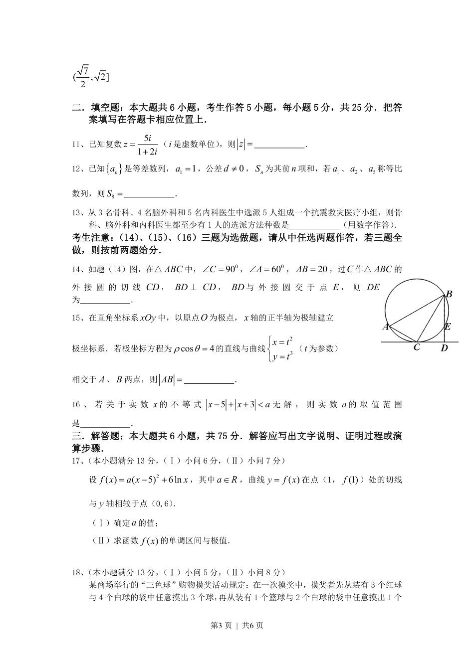 第1页|共6页特别提醒:zhangwlx(14)、(15)、(16)三题为选做题,请从中任选两题作答,若三题全做,则按前两题给分.一.选择题:本大题共10小题,每小题5分,共50分.在每小题给出的四个备选项中,只有一个选项是符合题目要求的.zhangwlx1、已知集合{1,2,3,4}U=,集合={1,2}A,={2,3}B,则()UAB=Uð(A){1,3,4}(B){3,4}(C){3}(D){4}2、命题“对任意xRÎ,都有20x³”的否定为(A)对任意xRÎ,使得20x<(B)不存在xRÎ,使得20x<(C)存在0xRÎ,都有200x³(D)存在0xRÎ,都有200x<3、(3)(6)aa-+(63a-££)的最大值为(A)9(B)92(C)3(D)3224、以下茎叶图记录了甲、乙两组各5名学生在一次英语听力测试中的成绩(单位:分).甲组乙组909x215y87424已知甲组数据的中位数为15,乙组数据的平均数为16.8,则x、y的值分别为(A)2、5(B)5、5(C)5,8(D)8,8zhangwlx第2页|共6页5、某几何体的三视图如题(5)图所示,则该几何体的体积为(A)5603(B)5803(C)200(D)240zhangwlx6、若abc<<,则函数()()()()()()()fxxaxbxbxcxcxa=--+--+--两个零点分别位于区间(A)(,)ab和(,)bc内(B)(,)a-¥和(,)ab内(C)(,)bc和(,)c+¥内(D)(,)a-¥和(,)c+¥内7、已知圆1C:22(2)(3)1xy-+-=,圆2C:22(3)(4)9xy-+-=,M、N分别是圆1C、2C上的动点,P为x轴上的动点,则PMPN+的最小值为(A)524-(B)171-(C)622-(D)178、执行如题(8)图所示的程序框图,如果输出3s=,那么判断框内应填入的条件是(A)6k£(B)7k£(C)8k£(D)9k£9、004cos50tan40-=zhangwlx(A)2(B)232+(C)3(D)221-10、在平面上,12ABAB^uuuruuuur,121OBOB==uuuruuuur,12APABAB=+uuuruuuruuuur.若12OP<uuur,则OAuuur的取值范围是(A)5(0,]2(B)57(,]22(C)5(,2]2(D)第3页|共6页7(,2]2二.填空题:本大题共6小题,考生作答5小题,每小题5分,共25分.把答案填写在答题卡相应位置上.11、已知复数512izi=+(i是虚数单位),则z=.zhangwlx12、已知na是等差数列,11a=,公差0d¹,nS为其前n项和,若1a、2a、5a称等比数列,则8S=.13、从3名骨科、4名脑外科和5名内科医生中选派5人组成一个抗震救灾医疗小组,则骨科、脑外科和内科医生都至少有1人的选派方法种数是(用数字作答).考生注意:(14)、(15)、(16)三题为选做题,请从中任选两题作答,若三题全做,则按前两题给分.14、如题(14)图,在△ABC中,090CÐ=,060AÐ=,20AB=,过C作△ABC的外接圆的切线CD,BD⊥CD,BD与外接圆交于点E,则DE的长为.zhangwlx15、在直角坐标系xOy中,以原点O为极点,x轴的正半轴为极轴建立极坐标系.若极坐标方程为cos4rq=的直线与曲线23xtytì=í=î(t为参数)相交于A、B两点,则AB=.16、若关于实数x的不等式53xxa-++<无解,则实数a的取值范围是.zhangwlx三.解答题:本大题共6小题,共75分.解答应写出文字说明、证明过程或演算步骤.17、(本小题满分13分,(Ⅰ)小问6分,(Ⅱ)小问7分)设2()(5)6lnfxaxx=-+,其中aRÎ,曲线()yfx=在点(1,(1)f)处的切线与y轴相较于点(0,6).(Ⅰ)确定a的值;(Ⅱ)求函数()fx的单调区间与极值.18、(本小题满分13分,(Ⅰ)小问5分,(Ⅱ)小问8分)某商场举行的“三色球”购物摸奖活动规定:在一次摸奖中,摸奖者先从装有3个红球与4个白球的袋中任意摸出3个球,再从装有1个篮球与2个白球的袋中任意摸出1个第4页|共6页球,根据摸出4个球中红球与篮球的个数,设一、二、三等奖如下:zhangwlx奖级摸出红、蓝球个数获奖金额一等奖3红1蓝200元二等奖3红0蓝50元三等奖2红1蓝10元其余情况无奖且每次摸奖最多只能获得一个奖级.(Ⅰ)求一次摸球恰好摸到1个红球的概率;(Ⅱ)求摸奖者在一次摸奖中获奖金额X的分布列与期望()EX.19、(本小题满分13分,(Ⅰ)小问5分,(Ⅱ)小问8分)如题(19)图,四棱锥PABCD-中,PA⊥底面ABCD,2BCCD==,4AC=,3ACBACDpÐ=Ð=,F为PC的中点,AF⊥PB.(Ⅰ)求PA的长;(Ⅱ)求二面角BAFD--的正弦值.zhangwlx20、(本小题满分12分,(Ⅰ)小问4分,(Ⅱ)小问8分)在△ABC中,内角A、B、C的对边分别是a、b...