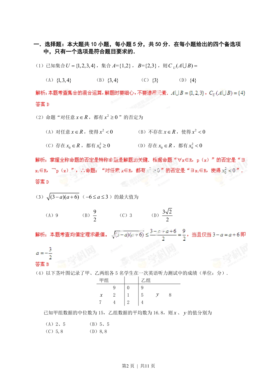 第1页|共11页革,有利于体现新课改精神。第2页|共11页一.选择题:本大题共10小题,每小题5分,共50分.在每小题给出的四个备选项中,只有一个选项是符合题目要求的.(1)已知集合{1,2,3,4}U=,集合={1,2}A,={2,3}B,则()UCAB=U(A){1,3,4}(B){3,4}(C){3}(D){4}(2)命题“对任意xRÎ,都有20x³”的否定为(A)对任意xRÎ,使得20x<(B)不存在xRÎ,使得20x<(C)存在0xRÎ,都有200x³(D)存在0xRÎ,都有200x<(3)(3)(6)aa-+(63a-££)的最大值为(A)9(B)92(C)3(D)322(4)以下茎叶图记录了甲、乙两组各5名学生在一次英语听力测试中的成绩(单位:分).甲组乙组909x215y87424已知甲组数据的中位数为15,乙组数据的平均数为16.8,则x、y的值分别为(A)2、5(B)5、5(C)5,8(D)8,8第3页|共11页(5)某几何体的三视图如题(5)图所示,则该几何体的体积为(A)5603(B)5803(C)200(D)240(6)若abc<<,则函数()()()()()()()fxxaxbxbxcxcxa=--+--+--两个零点分别位于区间(A)(,)ab和(,)bc内(B)(,)a-¥和(,)ab内(C)(,)bc和(,)c+¥内(D)(,)a-¥和(,)c+¥内(7)已知圆1C:22(2)(3)1xy-+-=,圆2C:22(3)(4)9xy-+-=,M、N分别是圆1C、2C上的动点,P为x轴上的动点,则PMPN+的最小值为(A)524-(B)171-(C)622-(D)17第4页|共11页(8)执行如题(8)图所示的程序框图,如果输出3S=,那么判断框内应填入的条件是(A)6k£(B)7k£(C)8k£(D)9k£(9)004cos50tan40-=(A)2(B)232+(C)3(D)221-解析:本题考查三角函数的化简求值,解题时要认真审题,仔细求解,注意三角函数恒等变换的合理运用.第5页|共11页二.填空题:本大题共6小题,考生作答5小题,每小题5分,共25分.把答案填写在答题卡相应位置上.(11)已知复数512izi=+(i是虚数单位),则z=.(12)已知na是等差数列,11a=,公差0d¹,nS为其前n项和,若1a、2a、5a成等比数列,则8S=.(13)从3名骨科、4名脑外科和5名内科医生中选派5人组成一个抗震救灾医疗小组,则骨科、脑外科和内科医生都至少有1人的选派方法种数是(用数字作答).第6页|共11页考生注意:(14)、(15)、(16)三题为选做题,请从中任选两题作答,若三题全做,则按前两题给分.(14)如题(14)图,在△ABC中,090CÐ=,060AÐ=,20AB=,过C作△ABC的外接圆的切线CD,BDCD^,BD与外接圆交于点E,则DE的长为.(15)在直角坐标系xOy中,以原点O为极点,x轴的正半轴为极轴建立极坐标系.若极坐标方程为cos4rq=的直线与曲线23xtytì=í=î(t为参数)相交于A、B两点,则AB=.三.解答题:本大题共6小题,共75分.解答应写出文字说明、证明过程或演算步骤.(17)(本小题满分13分,(Ⅰ)小问6分,(Ⅱ)小问7分)设2()(5)6lnfxaxx=-+,其中aRÎ,曲线()yfx=在点(1,(1)f)处的切线与y轴相较于点(0,6).(Ⅰ)确定a的值;(Ⅱ)求函数()fx的单调区间与极值.第7页|共11页(18)(本小题满分13分,(Ⅰ)小问5分,(Ⅱ)小问8分)某商场举行的“三色球”购物摸奖活动规定:在一次摸奖中,摸奖者先从装有3个红球与4个白球的袋中任意摸出3个球,再从装有1个篮球与2个白球的袋中任意摸出1个球,根据摸出4个球中红球与篮球的个数,设一、二、三等奖如下:奖级摸出红、蓝球个数获奖金额一等奖3红1蓝200元二等奖3红0蓝50元三等奖2红1蓝10元其余情况无奖且每次摸奖最多只能获得一个奖级.(Ⅰ)求一次摸球恰好摸到1个红球的概率;(Ⅱ)求摸奖者在一次摸奖中获奖金额X的分布列与期望()EX.第8页|共11页(19)(本小题满分13分,(Ⅰ)小问5分,(Ⅱ)小问8分)如题(19)图,四棱锥PABCD-中,PA⊥底面ABCD,2BCCD==,4AC=,3ACBACDpÐ=Ð=,F为PC的中点,AF⊥PB.(Ⅰ)求PA的长;(Ⅱ)求二面角BAFD--的余弦值.设平面FAD法向量为1111(,,),nxyz=ur平面FAB的法向量为2222(,,)nxyz=uur。由10nAF×=uruuur,第9页|共11页(20)(本小题满分12分,(Ⅰ)小问4分,(Ⅱ)小问8分)在△ABC中,内角A、B、C的对边分别是a、b、c,且2222ababc++=.(Ⅰ)求C;(Ⅱ)设32coscos5AB=,2cos()cos()2cos5ABaaa++=,求t...
