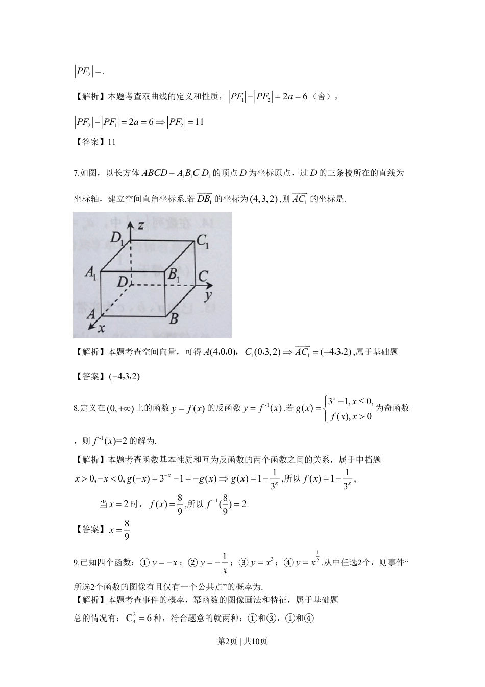 第1页|共10页2017年普通高等学校招生全国统一考试上海--数学试卷考生注意1.本场考试时间120分钟,试卷共4页,满分150分,答题纸共2页.2.作答前,在答题纸正面填写姓名、准考证号,反面填写姓名,将核对后的条形码贴在答题纸指定位置.3.所有作答务必填涂或书写在答题纸上与试卷题号对应的区域,不得错位.在试卷上作答一律不得分.4.用2B铅笔作答选择题,用黑色字迹钢笔、水笔或圆珠笔作答非选择题.一、填空题(本大题共有12题,满分54分,第1-6题每题4分,第7-12题每题5分)考生应在答题纸的相应位置直接填写结果.1.已知集合1,2,3,4,3,4,5AB==,则AB=I.【解析】本题考查集合的运算,交集,属于基础题【答案】3,42.若排列数6P654m=´´,则m=.【解析】本题考查排列的计算,属于基础题【答案】33.不等式11xx->的解集为.【解析】本题考查分式不等式的解法,属于基础题【答案】,0-¥4.已知球的体积为36p,则该球主视图的面积等于.【解析】本题考查球的体积公式和三视图的概念,343633RRpp=Þ=,所以29SRpp==,属于基础题【答案】9p5.已知复数z满足30zz+=,则z=.【解析】本题考查复数的四则运算和复数的模,2303zzz+=Þ=-设zabi=+,则22230,3ababiabi-+=-Þ==±,22zab=+,属于基础题【答案】36.设双曲线222109xybb-=>的焦点为12FF、,P为该双曲线上的一点.若15PF=,则第2页|共10页2PF=.【解析】本题考查双曲线的定义和性质,1226PFPFa-==(舍),2122611PFPFaPF-==Þ=【答案】117.如图,以长方体1111ABCDABCD-的顶点D为坐标原点,过D的三条棱所在的直线为坐标轴,建立空间直角坐标系.若1DBuuuur的坐标为(4,3,2),则1ACuuuur的坐标是.【解析】本题考查空间向量,可得11(400)(03,2)(432)ACACÞ=-uuuur,,,,,,,属于基础题【答案】(432)-,,8.定义在(0,)+¥上的函数()yfx=的反函数-1()yfx=.若31,0,()(),0xxgxfxxì-£=í>î为奇函数,则-1()=2fx的解为.【解析】本题考查函数基本性质和互为反函数的两个函数之间的关系,属于中档题10,0,()31()()13xxxxgxgxgx->-<-=-=-Þ=-,所以1()13xfx=-,当2x=时,8()9fx=,所以18()29f-=【答案】89x=9.已知四个函数:①yx=-;②1yx=-;③3yx=;④12yx=.从中任选2个,则事件“所选2个函数的图像有且仅有一个公共点”的概率为.【解析】本题考查事件的概率,幂函数的图像画法和特征,属于基础题总的情况有:42C6=种,符合题意的就两种:①和③,①和④第3页|共10页【答案】1310.已知数列na和nb,其中2,Nnann*=Î,nb的项是互不相等的正整数.若对于任意Nnnb*Î,中的第na项等于na中的第nb项,则149161234lglgbbbbbbbb=.【解析】本题考查数列概念的理解,对数的运算,属于中档题由题意可得:222222114293164(),,,nnabnnbabbbbbbbbbb=Þ=Þ====,所以214916123412341234lglg=2lglgbbbbbbbbbbbbbbbb=【答案】211.设12RaaÎ,,且121122sin2sin(2)aa+=++,则1210paa--的最小值等于.【解析】考查三角函数的性质和值域,121111,1,12sin32sin(2)3aaéùéùÎÎêúêú++ëûëû,,要使121122sin2sin(2)aa+=++,则111122221=122sin2,,1=12sin(2)4kkkZkpapapapaìì=-+ïï+ïïÞÎííïï=-+ïï+îî1212minmin31010(2)44kkppaappp--=+-+=,当122=11kk+时成立【答案】4p12.如图,用35个单位正方形拼成一个矩形,点1234,,,PPPP以及四个标记为“▲”的点在正方形的顶点处.设集合1234=,,,PPPPW,点PÎW.过P作直线Pl,使得不在Pl上的“▲”的点分布在Pl的两侧.用1()PDl和2()PDl分别表示Pl一侧和另一侧的“▲”的点到Pl的距离之和.若过P的直线Pl中有且只有一条满足12()=()PPDlDl,则W中所有这样的P为.第4页|共10页【解析】本题考查有向距离,以左下角的顶点为原点建立直角坐标系。四个标记为“▲”的点的坐标分别为(0,3),(1,0),(4,4),(7,1),设过P点的直线为:0axbyc++=,此时有向距离1234222222223447,,bcacabcabcddddabababab++++++====++++,且由1234+++12840320ddddabcabc=++=Þ++=则过1P的直线满足40bc+=;此时234abcbì=-ïíï=-î,直线为:2240(4)033bxbybbxy-+-=Þ-+-=:所以此时满足题意的直线...