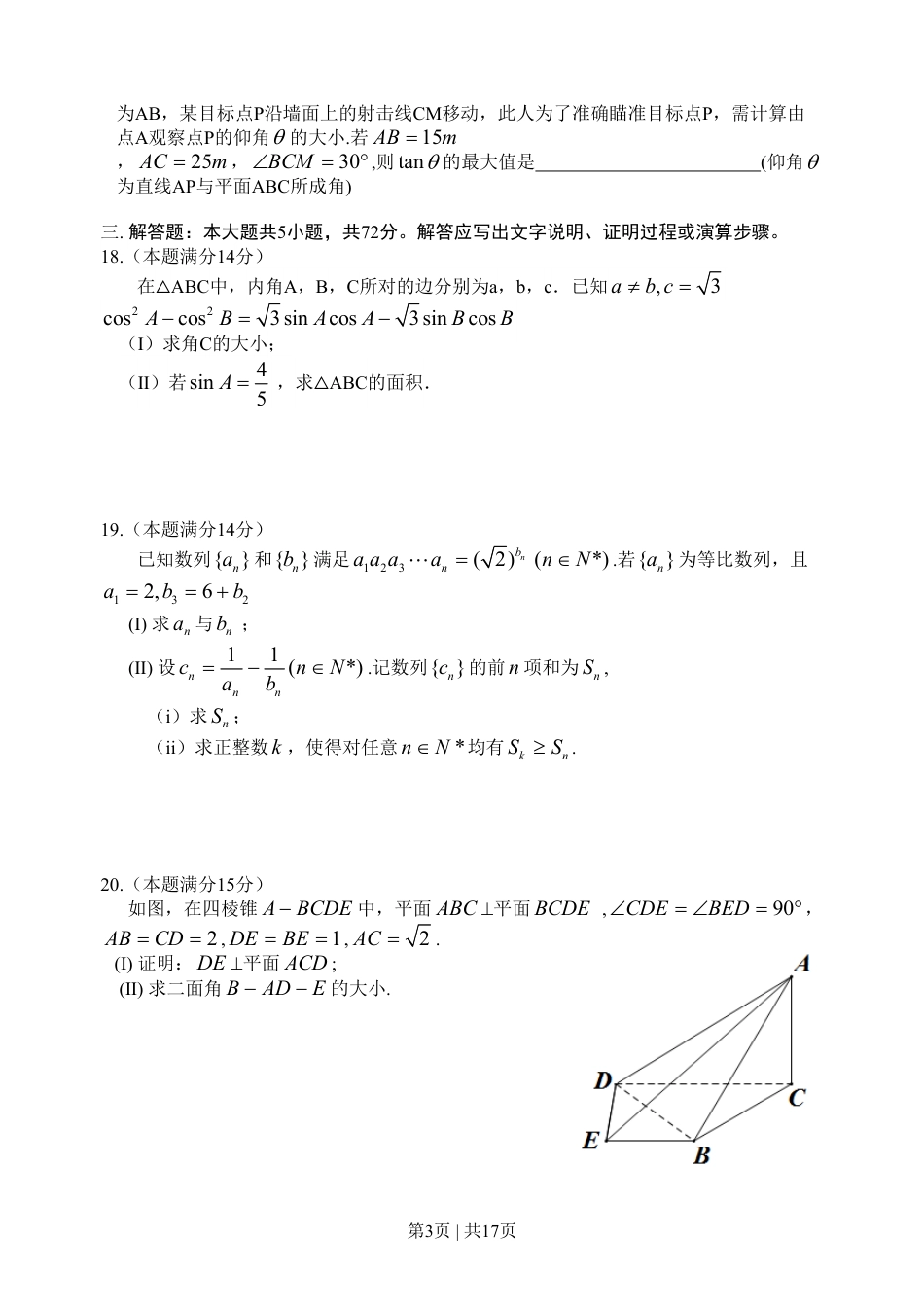 第1页|共17页2014年普通高等学校招生全国统一考试(浙江卷)数学(理科)一.选择题:本大题共10小题,每小题5分,共50分.在每小题给出的四个选项中,只有一项是符合题目要求的.1.设全集{|2}UxNx=γ,集合2{|5}AxNx=γ,则UCA=()A.ÆB.{2}C.{5}D.{2,5}2.已知i是虚数单位,,abRÎ,则“1ab==”是“2()2abii+=”的()A.充分不必要条件B.必要不充分条件C.充分必要条件D.既不充分也不必要条件3.某几何体的三视图(单位:cm)如图所示,则此几何体的表面积是()A.902cmB.1292cmC.1322cmD.1382cm4.为了得到函数sin3cos3yxx=+的图像,可以将函数2cos3yx=的图像()A.向右平移4p个单位B.向左平移4p个单位C.向右平移12p个单位D.向左平移12p个单位5.在64(1)(1)xy++的展开式中,记mnxy项的系数(,)fmn,则(3,0)(2,1)(1,2)(0,3)ffff+++=()A.45B.60C.120D.2106.已知函数32()fxxaxbxc=+++,且0(1)(2)(3)3fff<-=-=-£()A.3c£B.36c<£C.69c<£D.9c>7.在同一直角坐标系中,函数()(0)afxxx=³,()logagxx=的图像可能是()8.记,max{,},xxyxyyxy³ì=í<î,y,min{,}x,xyxyxy³ì=í<î,设,abrr为平面向量,则()A.min{||,||}min{||,||}ababab+-£rrrrrrB.min{||,||}min{||,||}ababab+-³rrrrrrC.2222max{||,||}||||ababab+-£+rrrrrrD.2222max{||,||}||||ababab+-³+rrrrrr9.第2页|共17页已知甲盒中仅有1个球且为红球,乙盒中有m个红球和n个篮球(3,3)mn³³,从乙盒中随机抽取(1,2)ii=个球放入甲盒中.(a)放入i个球后,甲盒中含有红球的个数记为(1,2)iix=;(b)放入i个球后,从甲盒中取1个球是红球的概率记为(1,2)ipi=.则()A.1212,()()ppEExx><B.1212,()()ppEExx<>C.1212,()()ppEExx>>D.1212,()()ppEExx<<10.设函数21()fxx=,22()2()fxxx=-,31()|sin2|3fxxp=,99iai=,,2,1,0=i99,,记10219998|()()||()()||()()|kkkkkkkIfafafafafafa=-+-++-,1,2,3k=则()A.123III<<B.213III<<C.D.321III<<二.填空题:本大题共7小题,每小题4分,共28分.11.若某程序框图如图所示,当输入50时,则该程序运算后输出的结果是________.12.随机变量x的取值为0,1,2,若1(0)5Px==,()1Ex=,则()Dx=________.13.当实数,xy满足240101xyxyx+-£ìï--£íï³î时,14axy£+£恒成立,则实数a的取值范围是________.14.在8张奖券中有一、二、三等奖各1张,其余5张无奖.将这8张奖券分配给4个人,每人2张,不同的获奖情况有_____种(用数字作答).15.设函数22,0(),0xxxfxxxì+<ï=í-³ïî若(())2ffa£,则实数a的取值范围是______16.设直线30xym-+=(0m¹)与双曲线12222=-byax(0,0ab>>)两条渐近线分别交于点A,B.若点(,0)Pm满足||||PAPB=,则该双曲线的离心率是__________17、如图,某人在垂直于水平地面ABC的墙面前的点A处进行射击训练.已知点A到墙面的距离132III<<第3页|共17页为AB,某目标点P沿墙面上的射击线CM移动,此人为了准确瞄准目标点P,需计算由点A观察点P的仰角q的大小.若15ABm=,25ACm=,30BCMÐ=°,则tanq的最大值是(仰角q为直线AP与平面ABC所成角)三.解答题:本大题共5小题,共72分。解答应写出文字说明、证明过程或演算步骤。18.(本题满分14分)在△ABC中,内角A,B,C所对的边分别为a,b,c.已知,3abc¹=22coscos3sincos3sincosABAABB-=-(Ⅰ)求角C的大小;(Ⅱ)若4sin5A=,求△ABC的面积.19.(本题满分14分)已知数列{}na和{}nb满足123(2)(*)nbnaaaanN=Î.若{}na为等比数列,且1322,6abb==+(Ⅰ)求na与nb;(Ⅱ)设11(*)nnncnNab=-Î.记数列{}nc的前n项和为nS,(i)求nS;(ii)求正整数k,使得对任意*nNÎ均有knSS³.20.(本题满分15分)如图,在四棱锥ABCDE-中,平面ABC平面BCDE,90CDEBEDÐ=Ð=°,2ABCD==,1DEBE==,2AC=.(Ⅰ)证明:DE平面ACD;(Ⅱ)求二面角BADE--的大小.第4页|共17页21(本题满分15分)如图,设椭圆C:)0(12222>>=+babyax动直线l与椭圆C只有一个公共点P,且点P在第一象限.(Ⅰ)已知直线l的斜率为k,用,,abk表示点P的坐标;(Ⅱ)若过原点O的直线1l与l垂直,证明:点P到直线1l的距离的最大值为ab-.22.(本题满分14分)已知函数33().fxxxaaR=+-Î(Ⅰ)若fx在1,1...