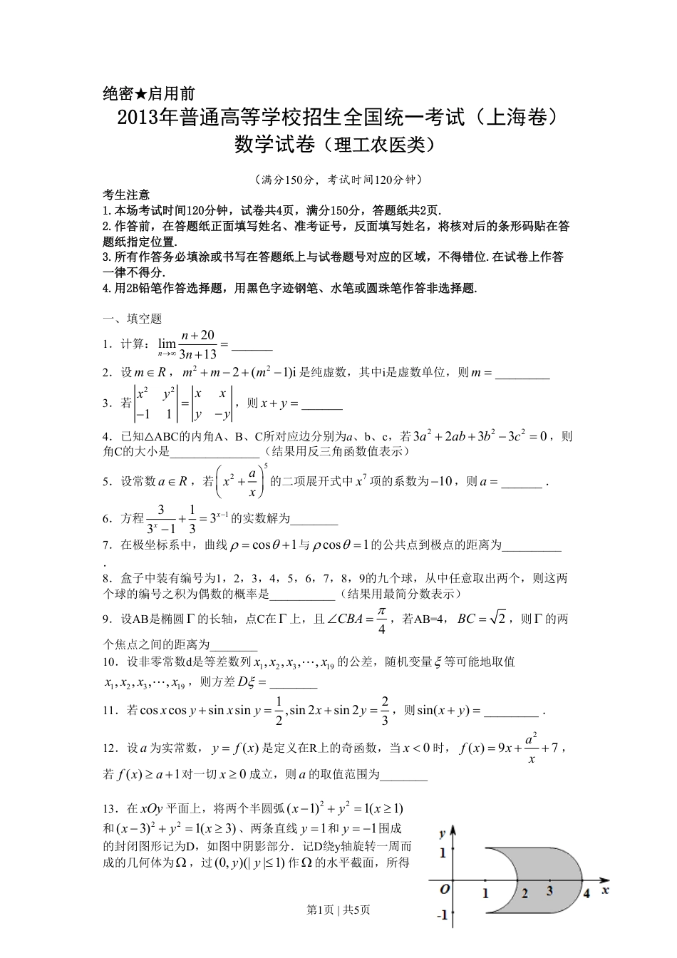第1页|共5页绝密★启用前2013年普通高等学校招生全国统一考试(上海卷)数学试卷(理工农医类)(满分150分,考试时间120分钟)考生注意1.本场考试时间120分钟,试卷共4页,满分150分,答题纸共2页.2.作答前,在答题纸正面填写姓名、准考证号,反面填写姓名,将核对后的条形码贴在答题纸指定位置.3.所有作答务必填涂或书写在答题纸上与试卷题号对应的区域,不得错位.在试卷上作答一律不得分.4.用2B铅笔作答选择题,用黑色字迹钢笔、水笔或圆珠笔作答非选择题.一、填空题1.计算:20lim______313nnn®¥+=+2.设mRÎ,222(1)immm+-+-是纯虚数,其中i是虚数单位,则________m=3.若2211xxxyyy=--,则______xy+=4.已知△ABC的内角A、B、C所对应边分别为a、b、c,若22232330aabbc++-=,则角C的大小是_______________(结果用反三角函数值表示)5.设常数aRÎ,若52axxæö+ç÷èø的二项展开式中7x项的系数为10-,则______a=.6.方程1313313xx-+=-的实数解为________7.在极坐标系中,曲线cos1rq=+与cos1rq=的公共点到极点的距离为__________.8.盒子中装有编号为1,2,3,4,5,6,7,8,9的九个球,从中任意取出两个,则这两个球的编号之积为偶数的概率是___________(结果用最简分数表示)9.设AB是椭圆G的长轴,点C在G上,且4CBApÐ=,若AB=4,2BC=,则G的两个焦点之间的距离为________10.设非零常数d是等差数列12319,,,,xxxxL的公差,随机变量x等可能地取值12319,,,,xxxxL,则方差_______Dx=11.若12coscossinsin,sin2sin223xyxyxy+=+=,则sin()________xy+=.12.设a为实常数,()yfx=是定义在R上的奇函数,当0x<时,2()97afxxx=++,若()1fxa³+对一切0x³成立,则a的取值范围为________13.在xOy平面上,将两个半圆弧22(1)1(1)xyx-+=³和22(3)1(3)xyx-+=³、两条直线1y=和1y=-围成的封闭图形记为D,如图中阴影部分.记D绕y轴旋转一周而成的几何体为W,过(0,)(||1)yy£作W的水平截面,所得第2页|共5页截面面积为2418ypp-+,试利用祖暅原理、一个平放的圆柱和一个长方体,得出W的体积值为__________14.对区间I上有定义的函数()gx,记(){|(),}gIyygxxI==Î,已知定义域为[0,3]的函数()yfx=有反函数1()yfx-=,且11([0,1))[1,2),((2,4])[0,1)ff--==,若方程()0fxx-=有解0x,则0_____x=二、选择题15.设常数aRÎ,集合{|(1)()0},{|1}AxxxaBxxa=--³=³-,若ABRÈ=,则a的取值范围为()(A)(,2)-¥(B)(,2]-¥(C)(2,)+¥(D)[2,)+¥16.钱大姐常说“便宜没好货”,她这句话的意思是:“不便宜”是“好货”的()(A)充分条件(B)必要条件(C)充分必要条件(D)既非充分也非必要条件17.在数列{}na中,21nna=-,若一个7行12列的矩阵的第i行第j列的元素,ijijijaaaaa=×++,(1,2,,7;1,2,,12ij==LL)则该矩阵元素能取到的不同数值的个数为()(A)18(B)28(C)48(D)6318.在边长为1的正六边形ABCDEF中,记以A为起点,其余顶点为终点的向量分别为12345,,,,aaaaauruuruuruuruur;以D为起点,其余顶点为终点的向量分别为12345,,,,ddddduuruuruuruuruur.若,mM分别为()()ijkrstaaaddd++×++uruuruuruuruuruur的最小值、最大值,其中{,,}{1,2,3,4,5}ijkÍ,{,,}{1,2,3,4,5}rstÍ,则,mM满足().(A)0,0mM=>(B)0,0mM<>(C)0,0mM<=(D)0,0mM<<三、解答题19.(本题满分12分)如图,在长方体ABCD-A1B1C1D1中,AB=2,AD=1,A1A=1,证明直线BC1平行于平面DA1C,并求直线BC1到平面D1AC的距离.20.(6分+8分)甲厂以x千克/小时的速度运输生产某种产品(生产条件要求110x££),每小时可获得利润是3100(51)xx+-元.(1)要使生产该产品2小时获得的利润不低于3000元,求x的取值范围;(2)要使生产900千克该产品获得的利润最大,问:甲厂应该选取何种生产速度?并求最大利润.D1C1B1A1DCBA第3页|共5页21.(6分+8分)已知函数()2sin()fxxw=,其中常数0w>;(1)若()yfx=在2[,]43pp-上单调递增,求w的取值范围;(2)令2w=,将函数()yfx=的图像向左平移6p个单位,再向上平移1个单位,得到函数()ygx=的图像,区间[,]ab(,abRÎ且ab<)满足:()ygx=在[,]ab上至少含有30个零点,在所有满足上述条件的[,]ab中,求ba-的最小值.第...