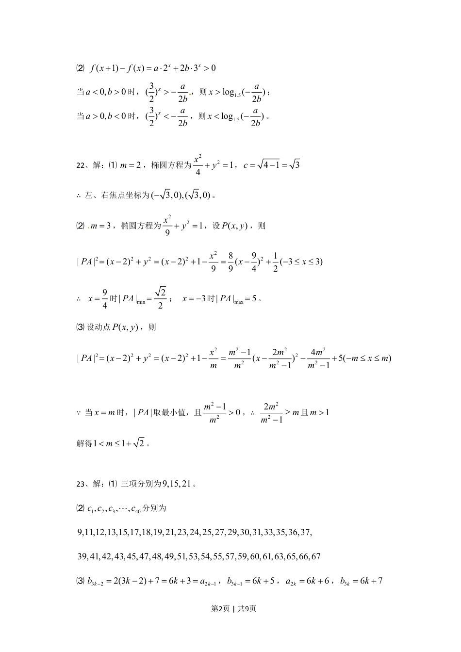 第1页|共9页2011年上海高考数学试题(文科)答案及解析一、填空题1、{|1}xx<;2、2-;3、32-;4、5;5、2110xy+-=;6、0x<或1x>;7、3p;8、6;9、52;10、2;11、6;12、152;13、0.985;14、[2,7]-。二、选择题15、A;16、D;17、A;18、B。三、解答题19、解:1(2)(1)1zii-+=-Þ12zi=-………………(4分)设22,zaiaR=+Î,则12(2)(2)(22)(4)zziaiaai=-+=++-,………………(12分)∵12zzRÎ,∴242zi=+………………(12分)20、解:⑴连1111,,,BDABBDAD,∵1111//,BDBDABAD=,∴异面直线BD与1AB所成角为11ABDÐ,记11ABDqÐ=,222111111110cos210ABBDADABBDq+-==´∴异面直线BD与1AB所成角为10arccos10。⑵连11,,ACCBCD,则所求四面体的体积11111111242433ABCDABCDCBCDVVV--=-´=-´=。21、解:⑴当0,0ab>>时,任意1212,,xxRxxÎ<,则121212()()(22)(33)xxxxfxfxab-=-+-∵121222,0(22)0xxxxaa<>Þ-<,121233,0(33)0xxxxbb<>Þ-<,∴12()()0fxfx-<,函数()fx在R上是增函数。当0,0ab<<时,同理,函数()fx在R上是减函数。DCBAD1C1B1A1第2页|共9页⑵(1)()2230xxfxfxab+-=×+×>当0,0ab<>时,3()22xab>-,则1.5log()2axb>-;当0,0ab><时,3()22xab<-,则1.5log()2axb<-。22、解:⑴2m=,椭圆方程为2214xy+=,413c=-=∴左、右焦点坐标为(3,0),(3,0)-。⑵3m=,椭圆方程为2219xy+=,设(,)Pxy,则222222891||(2)(2)1()(33)9942xPAxyxxx=-+=-+-=-+-££[来∴94x=时min2||2PA=;3x=-时max||5PA=。⑶设动点(,)Pxy,则222222222222124||(2)(2)1()5()11xmmmPAxyxxmxmmmmm-=-+=-+-=--+-££--∵当xm=时,||PA取最小值,且2210mm->,∴2221mmm³-且1m>解得112m<£+。23、解:⑴三项分别为9,15,21。⑵12340,,,,ccccL分别为9,11,12,13,15,17,18,19,21,23,24,25,27,29,30,31,33,35,36,37,39,41,42,43,45,47,48,49,51,53,54,55,57,59,60,61,63,65,66,67⑶32212(32)763kkbkka--=-+=+=,3165kbk-=+,266kak=+,367kbk=+第3页|共9页∵63656667kkkk+<+<+<+∴*63(43)65(42),66(41)67(4)nknkknkckNknkknk+=-ìï+=-ï=Îí+=-ïï+=î。43424142421kkkkcccck---+++=+2412344342414(1)()()242112332nnnnnnnSccccccccnnn---+=++++++++=´+=+L。第4页|共9页第5页|共9页第6页|共9页第7页|共9页第8页|共9页第9页|共9页