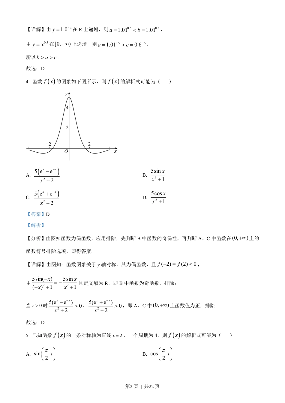 第1页|共22页2023年普通高等学校招生全国统一考试(天津卷)数学一、选择题(在每小题给出的四个选项中,只有一项是符合题目要求的)1.已知集合1,2,3,4,5,1,3,1,2,4UAB===,则UBA=Uð()A.1,3,5B.1,3C.1,2,4D.1,2,4,5【答案】A【解析】【分析】对集合B求补集,应用集合的并运算求结果;【详解】由{3,5}UB=ð,而{1,3}A=,所以{1,3,5}UBA=Uð.故选:A2.“22ab=”是“222abab+=”的()A.充分不必要条件B.必要不充分条件C.充分必要条件D.既不充分又不必要条件【答案】B【解析】【分析】根据充分、必要性定义判断条件的推出关系,即可得答案.【详解】由22ab=,则ab=±,当0ab=-¹时222abab+=不成立,充分性不成立;由222abab+=,则2()0ab-=,即ab=,显然22ab=成立,必要性成立;所以22ab=是222abab+=的必要不充分条件.故选:B3.若0.50.60.51.01,1.01,0.6abc===,则,,abc的大小关系为()A.cab>>B.cba>>C.abc>>D.bac>>【答案】D【解析】【分析】根据对应幂、指数函数的单调性判断大小关系即可.第2页|共22页【详解】由1.01xy=在R上递增,则0.50.61.011.01ab=<=,由0.5yx=在[0,)+¥上递增,则0.50.51.010.6ac=>=.所以bac>>.故选:D4.函数fx的图象如下图所示,则fx的解析式可能为()A.25ee2xxx--+B.25sin1xx+C.25ee2xxx-++D.25cos1xx+【答案】D【解析】【分析】由图知函数为偶函数,应用排除,先判断B中函数的奇偶性,再判断A、C中函数在(0,)+¥上的函数符号排除选项,即得答案.【详解】由图知:函数图象关于y轴对称,其为偶函数,且(2)(2)0ff-=<,由225sin()5sin()11xxxx-=--++且定义域为R,即B中函数为奇函数,排除;当0x>时25(ee)02xxx-->+、25(ee)02xxx-+>+,即A、C中(0,)+¥上函数值为正,排除;故选:D5.已知函数fx的一条对称轴为直线2x=,一个周期为4,则fx的解析式可能为()A.sin2xpæöç÷èøB.cos2xpæöç÷èø第3页|共22页C.sin4xpæöç÷èøD.cos4xpæöç÷èø【答案】B【解析】【分析】由题意分别考查函数的最小正周期和函数在2x=处的函数值,排除不合题意的选项即可确定满足题意的函数解析式.【详解】由函数的解析式考查函数的最小周期性:A选项中242Tpp==,B选项中242Tpp==,C选项中284Tpp==,D选项中284Tpp==,排除选项CD,对于A选项,当2x=时,函数值sin202pæö´=ç÷èø,故2,0是函数一个对称中心,排除选项A,对于B选项,当2x=时,函数值cos212pæö´=-ç÷èø,故2x=是函数的一条对称轴,故选:B.6.已知na为等比数列,nS为数列na的前n项和,122nnaS+=+,则4a的值为()A.3B.18C.54D.152【答案】C【解析】【分析】由题意对所给的递推关系式进行赋值,得到关于首项、公比的方程组,求解方程组确定首项和公比的值,然后结合等比数列通项公式即可求得4a的值.【详解】由题意可得:当1n=时,2122aa=+,即1122aqa=+,①当2n=时,31222aaa=++,即211122aqaaq=++,②联立①②可得12,3aq==,则34154aaq==.故选:C.7.调查某种群花萼长度和花瓣长度,所得数据如图所示,其中相关系数0.8245r=,下列说法正确的是()的第4页|共22页A.花瓣长度和花萼长度没有相关性B.花瓣长度和花萼长度呈现负相关C.花瓣长度和花萼长度呈现正相关D.若从样本中抽取一部分,则这部分的相关系数一定是0.8245【答案】C【解析】【分析】根据散点图的特点可分析出相关性的问题,从而判断ABC选项,根据相关系数的定义可以判断D选项.【详解】根据散点的集中程度可知,花瓣长度和花萼长度有相关性,A选项错误散点的分布是从左下到右上,从而花瓣长度和花萼长度呈现正相关性,B选项错误,C选项正确;由于0.8245r=是全部数据的相关系数,取出来一部分数据,相关性可能变强,可能变弱,即取出的数据的相关系数不一定是0.8245,D选项错误故选:C8.在三棱锥-PABC中,线段PC上的点M满足13PMPC=,线段PB上的点N满足23PNPB=,则三棱锥PAMN-和三棱锥-PABC的体积之比为()A.19B.29C.13D.49【答案】B【解析】【分析】分别过,MC作,MMPACCPA¢¢^^,垂足分别为,MC¢¢.过B作BB¢^平面PAC,垂足为B¢,连接PB¢,过N作NNPB¢¢^,垂...