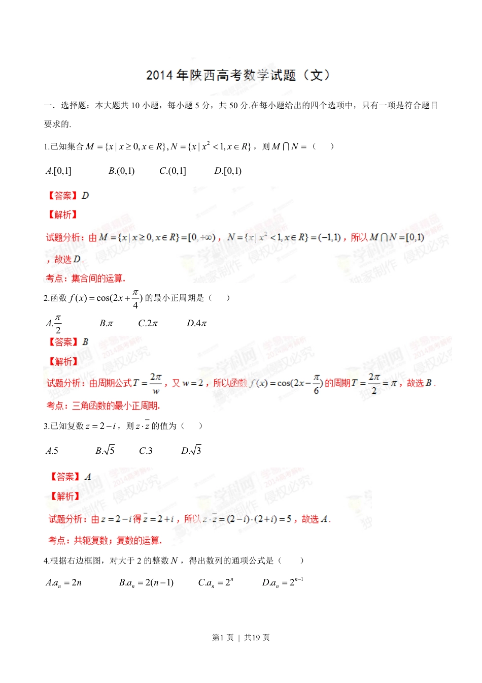 第1页|共19页一.选择题:本大题共10小题,每小题5分,共50分.在每小题给出的四个选项中,只有一项是符合题目要求的.1.已知集合,则()2.函数的最小正周期是()3.已知复数,则的值为()4.根据右边框图,对大于2的整数,得出数列的通项公式是()2{|0,},{|1,}MxxxRNxxxR=³Î=<ÎMN=I.[0,1]A.(0,1)B.(0,1]C.[0,1)D()cos(2)4fxxp=+.2Ap.Bp.2Cp.4Dp2zi=-zz×.5A.5B.3C.3DN.2nAan=.2(1)nBan=-.2nnCa=1.2nnDa-=第2页|共19页5.将边长为1的正方形以其一边所在直线为旋转轴旋转一周,所得几何体的侧面积为()【答案】【解析】试题分析:将边长为1的正方形以其学科网一边所在直线为旋转轴旋转一周得到的几何体为底面为半径为的圆、高为1的圆柱,其侧面展开图为长为,宽为1,所以所得几何体的侧面积为.4Ap.3Bp.2Cp.DpC1r=22rpp=第3页|共19页.故选.考点:旋转体;几何体的侧面积.6.从正方形四个顶点及其中心这5个点中,任取2个点,则这2个点的距离小于该正方形边长的概率为()考点:古典概型及其概率计算公式.7.下了函数中,满足“”的单调递增函数是()(A)(B)(C)(D)定义在上减函数,所以错误;故选.212pp´=C1.5A2.5B3.5C4.5Dfxyfxfy+=3fxx=3xfx=23fxx=12xfx=RDB第4页|共19页考点:函数求值;函数的单调性.8.原命题为“若,,则为递减数列”,关于逆命题,否命题,逆否命题真假性的判断依次如下,正确的是()(A)真,真,真(B)假,假,真(C)真,真,假(D)假,假,假9.某公司位员工的月工资(单位:元)为,,…,,其均值和方差分别为和,若从下月起每位员工的月工资增加元,则这位员工下月工资的均值和方差分别为()(A),(B),(C),(D),方差12nnnaaa++<nN+Îna101x2x10xx2s10010x22s100+100x+22s100+x2s100x+2s2221210[(100)(100)][(100)(100)][(100)(100)]10xxxxxx+-+++-++×××++-+=第5页|共19页故选考点:均值和方差.10.如图,修建一条公路需要一段环湖弯曲路段与两条直道平滑连续(相切),已知环湖弯曲路段为某三次函数图像的一部分,则该函数的解析式为()(A)(B)(C)(D)[来源:学科网ZXXK]二、填空题:把答案填写在答题卡相应题号后的横线上(本大题共5小题,每小题5分,共25分).11.抛物线的准线方程为________.222221210()()()101010xxxxxxss-+-++-===LD321122yxxx=--3211322yxxx=+-314yxx=-3211242yxxx=+-24yx=第6页|共19页12.已知,,则________.13.设,向量,若,则______.14.已知,若,则的表达式为________.42a=lgxa=x=20p<<)cos,1(),cos,2(sin-==ba0=×ba=tan0,1)(³+=xxxxf++Î==Nnxffxfxfxfnn)),(()(),()(11)(2014xf第7页|共19页,当时,,,考点:数列的通项公式;数列与函数之间的关系.[来源:Z§xx§k.Com]15.(考生注意:请在下列三题中任选一题作答,如果多做,则按所做的第一题评分)A.(不等式选做题)设,且,则的最小值为______.B.(几何证明选做题)如图,中,,以为直径的半圆分别交于点,若,则=_______.C.(坐标系与参数方程选做题)在极坐标系中,点到直线的距离是_______.【答案】1【解析】()(0)1nxfxxnx\=>+0x=0(0)010nf==+()(0)1nxfxxnx\=³+2014()12014xfxx\=+RnmbaÎ,,,5,522=+=+nbmaba22nm+ABC6=BCBCACAB,FE,AEAC2=EF)6,2(p1)6sin(=-p第8页|共19页试题分析:直线化为直角坐标方程为,点的直角坐标为,点到直线的距离,故答案为1.考点:极坐标方程;点到直线距离.三、解答题.16.(本小题满分12分)的内角所对的边分别为.(1)若成等差数列,证明:;(2)若成等比数列,且,求的值.sin()16p-=311022yx--=(2,)6p(3,1)(3,1)311022yx--=2231|1310|22113()()22d´-´-===-+ABCCBA,,cba,,cba,,)sin(2sinsinCACA+=+cba,,ac2=Bcos第9页|共19页17.(本小题满分12分)[来源:Z&xx&k.Com]四面体及其三视图如图所示,平行于棱的平面分别交四面体的棱22bac\=ABCDBCAD,第10页|共19页于点.(1)求四面体的体积;(2)证明:四边形是矩形.由题设,∥面,面面,面面,所以∥,CADCBDAB,,,HGFE,,,ABCDEFGHBCEFGHEFGHIBDCFG=EFGHIABCEH=BCFG第11页|共19页18.(...