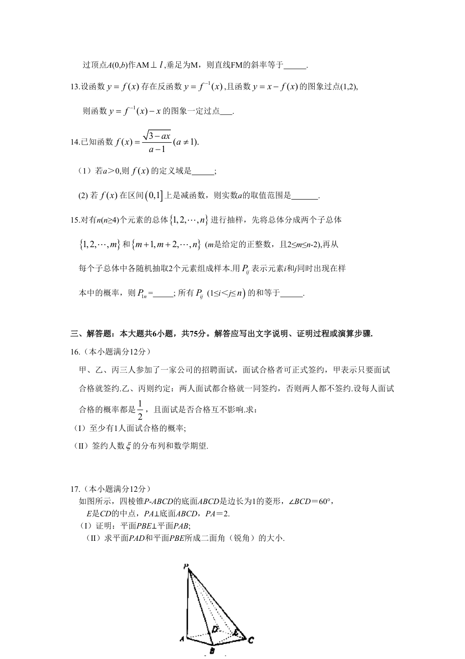 第1页|共5页2008高考湖南理科数学试题及全解全析一、选择题:本大题共10小题,每小题5分,共50分.在每小题给出的四个选项中,只有一项是符合题目要求的.1.复数31()ii-等于()A.8B.-8C.8iD.-8i2.“12x-<成立”是“(3)0xx-<成立”的()A.充分不必要条件B.必要不充分条件C.充分必要条件D.既不充分也不必要条件3.已知变量x、y满足条件1,0,290,xxyxy--则xy的最大值是()A.2B.5C.6D.84.设随机变量x服从正态分布(2,9)N,若(1)(1)PcPcxx>=<-,则c=()A.1B.2C.3D.45.设有直线m、n和平面、,下列四个命题中,正确的是()A.若m∥,n∥,则m∥nB.若m,n,m∥,n∥,则∥C.若,m,则mD.若,m,m,则m∥6.函数2()sin3sincosfxxxx=在区间,42上的最大值是()A.1B.132C.32D.1+37.设D、E、F分别是△ABC的三边BC、CA、AB上的点,且2,DCBD=uuuruuur2,CEEA=uuuruuur2,AFFB=uuuruuur则ADBECFuuuruuuruuur与BCuuur()第2页|共5页C1D1B1A1ODCBAA.反向平行B.同向平行C.互相垂直D.既不平行也不垂直8.若双曲线22221xyab-=(a>0,b>0)上横坐标为32a的点到右焦点的距离大于它到左准线的距离,则双曲线离心率的取值范围是()A.(1,2)B.(2,+)C.(1,5)D.(5,+)9.长方体ABCD-A1B1C1D1的8个顶点在同一球面上,且AB=2,AD=3,AA1=1,则顶点A、B间的球面距离是()A.22B.2C.22D.2410.设[x]表示不超过x的最大整数(如[2]=2,[54]=1),对于给定的nN*,定义(1)(1),(1)(1)xnnnnxCxxxx--=--LLx1,,则当x3,32时,函数8xC的值域是()A.16,283B.16,563C.284,328,56D.16284,,2833二、填空题:本大题共5小题,每小题5分,共25分。把答案填在对应题号后的横线上。11.211lim______34xxxx®-=-.12.已知椭圆22221xyab=(a>b>0)的右焦点为F,右准线为l,离心率e=5.5第3页|共5页过顶点A(0,b)作AMl,垂足为M,则直线FM的斜率等于.13.设函数()yfx=存在反函数1()yfx-=,且函数()yxfx=-的图象过点(1,2),则函数1()yfxx-=-的图象一定过点.14.已知函数3()(1).1axfxaa-=¹-(1)若a>0,则()fx的定义域是;(2)若()fx在区间0,1上是减函数,则实数a的取值范围是.15.对有n(n≥4)个元素的总体1,2,,nL进行抽样,先将总体分成两个子总体1,2,,mL和1,2,,mmnL(m是给定的正整数,且2≤m≤n-2),再从每个子总体中各随机抽取2个元素组成样本.用ijP表示元素i和j同时出现在样本中的概率,则1nP=;所有ijP(1≤i<j≤n的和等于.三、解答题:本大题共6小题,共75分。解答应写出文字说明、证明过程或演算步骤.16.(本小题满分12分)甲、乙、丙三人参加了一家公司的招聘面试,面试合格者可正式签约,甲表示只要面试合格就签约.乙、丙则约定:两人面试都合格就一同签约,否则两人都不签约.设每人面试合格的概率都是12,且面试是否合格互不影响.求:(Ⅰ)至少有1人面试合格的概率;(Ⅱ)签约人数x的分布列和数学期望.17.(本小题满分12分)如图所示,四棱锥P-ABCD的底面ABCD是边长为1的菱形,∠BCD=60°,E是CD的中点,PA⊥底面ABCD,PA=2.(Ⅰ)证明:平面PBE⊥平面PAB;(Ⅱ)求平面PAD和平面PBE所成二面角(锐角)的大小.第4页|共5页18.(本小题满分12分)数列221221,2,(1cos)sin,1,2,3,.22nnnnnaaaaan====L满足(Ⅰ)求34,,aa并求数列na的通项公式;(Ⅱ)设21122,.nnnnnabSbbba-==L证明:当162.nnSn-<时,19.(本小题满分13分)在一个特定时段内,以点E为中心的7海里以内海域被设为警戒水域.点E正北55海里处有一个雷达观测站A.某时刻测得一艘匀速直线行驶的船只位于点A北偏东45o且与点A相距402海里的位置B,经过40分钟又测得该船已行驶到点A北偏东45o+(其中sin=2626,090<<oo)且与点A相距1013海里的位置C.(I)求该船的行驶速度(单位:海里/小时);(II)若该船不改变航行方向继续行驶.判断它是否会进入警戒水域,并说明理由.20.(本小题满分13分)若A、B是抛物线y2=4x上的不同两点,弦AB...