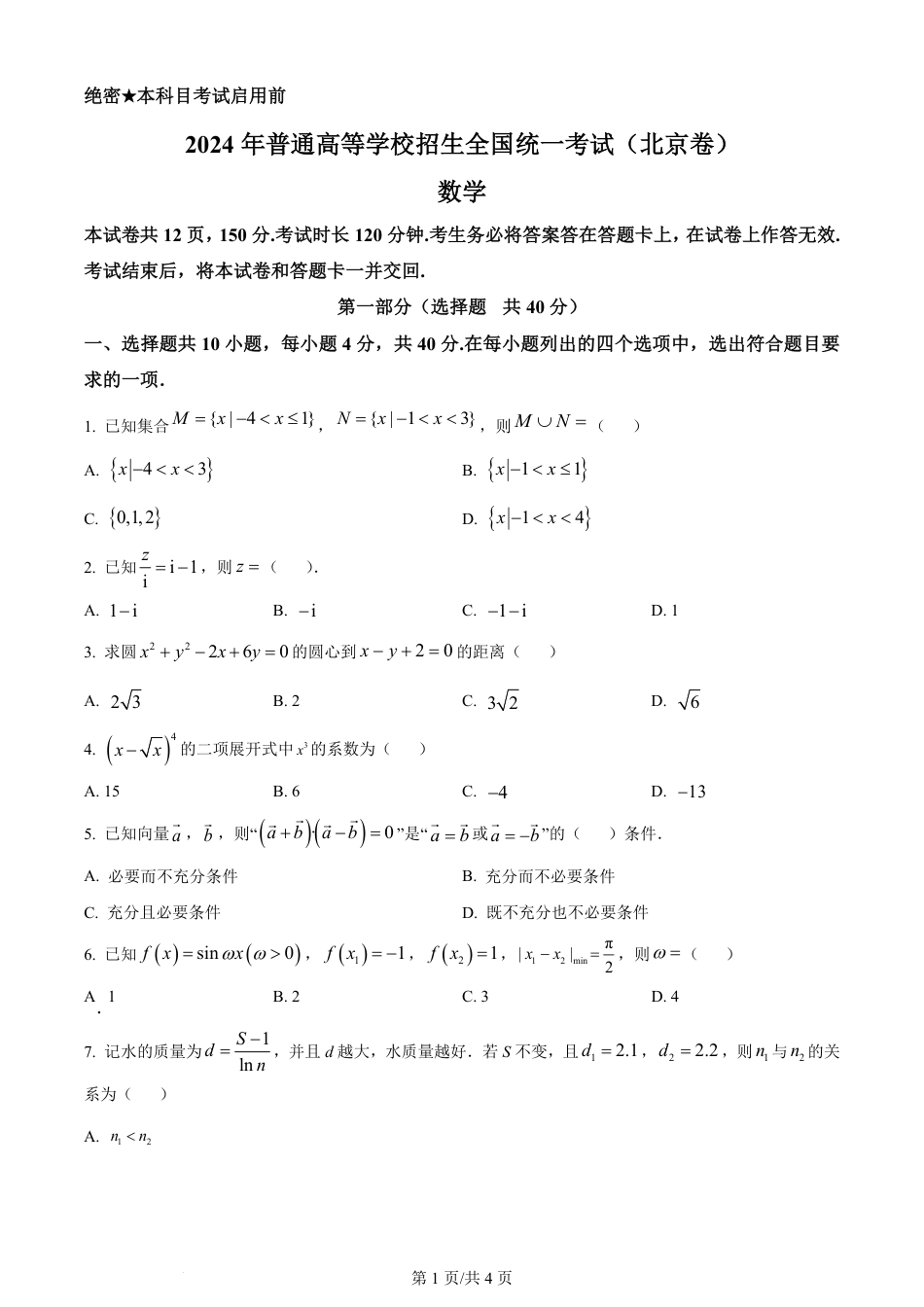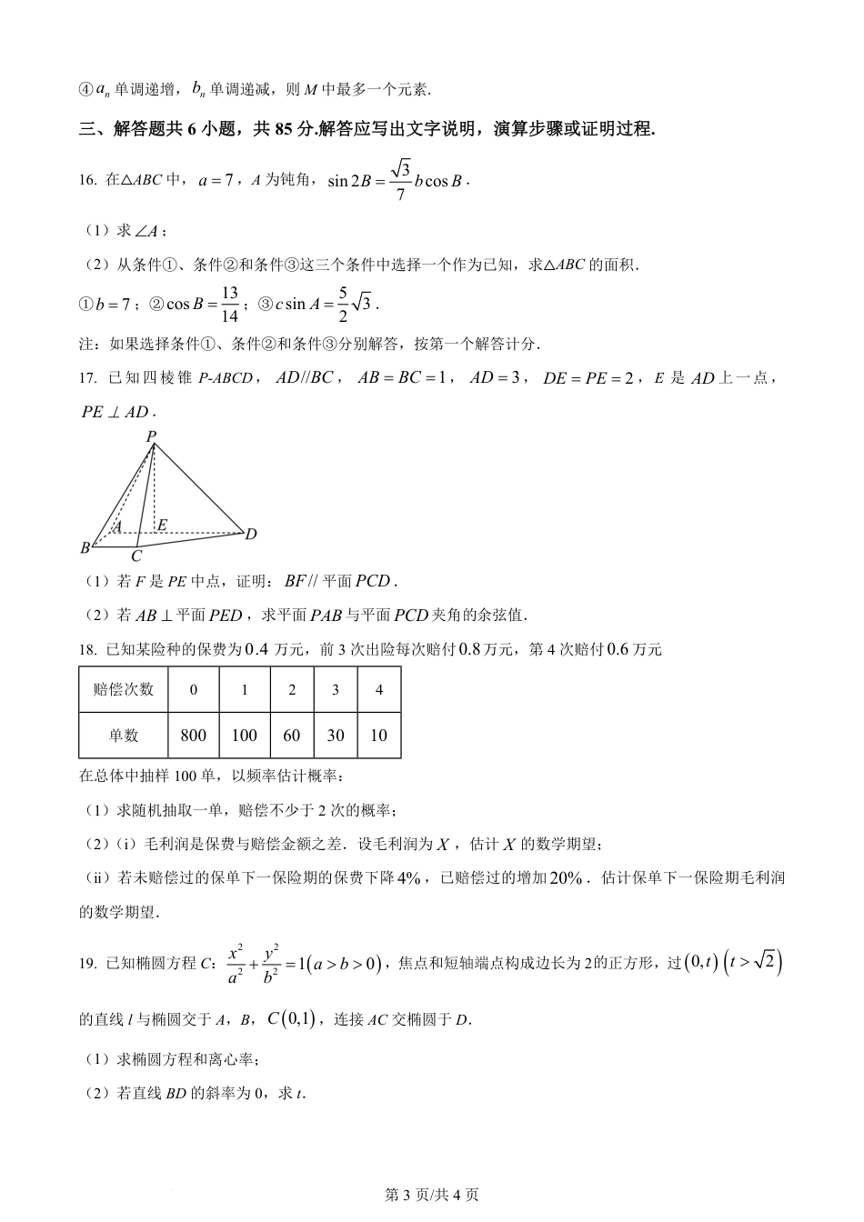 第1页/共4页学科网(北京)股份有限公司绝密★本科目考试启用前2024年普通高等学校招生全国统一考试(北京卷)数学本试卷共12页,150分.考试时长120分钟.考生务必将答案答在答题卡上,在试卷上作答无效.考试结束后,将本试卷和答题卡一并交回.第一部分(选择题共40分)一、选择题共10小题,每小题4分,共40分.在每小题列出的四个选项中,选出符合题目要求的一项.1.已知集合{|41}Mxx=-<£,{|13}Nxx=-<<,则MNÈ=()A.43xx-<<B.11xx-<£C.0,1,2D.14xx-<<2.已知i1iz=-,则z=().A.1i-B.i-C.1i--D.13.求圆22260xyxy+-+=的圆心到20xy-+=的距离()A.23B.2C.32D.64.4xx-的二项展开式中3x的系数为()A.15B.6C.4-D.13-5.已知向量ar,br,则“·0abab+-=rrrr”是“ab=rr或ab=-rr”的()条件.A.必要而不充分条件B.充分而不必要条件C.充分且必要条件D.既不充分也不必要条件6.已知sin0fxxww=>,11fx=-,21fx=,12minπ||2xx-=,则w=()A1B.2C.3D.47.记水的质量为1lnSdn-=,并且d越大,水质量越好.若S不变,且12.1d=,22.2d=,则1n与2n的关系为()A.12nn<.第2页/共4页学科网(北京)股份有限公司B12nn>C.若1S<,则12nn<;若1S>,则12nn>;D.若1S<,则12nn>;若1S>,则12nn<;8.已知以边长为4的正方形为底面的四棱锥,四条侧棱分别为4,4,22,22,则该四棱锥的高为()A.22B.32C.23D.39.已知11,xy,22,xy是函数2xy=图象上不同的两点,则下列正确的是()A.12122log22yyxx++>B.12122log22yyxx++<C.12212log2yyxx+>+D.12212log2yyxx+<+10.若集合2,|(),01,12xyyxtxxtx=+-££££表示的图形中,两点间最大距离为d、面积为S,则()A.3d=,1S<B.3d=,1S>C.10d=,1S<D.10d=,1S>第二部分(非选择题共110分)二、填空题共5小题,每小题5分,共25分.11.已知抛物线216yx=,则焦点坐标为________.12.已知ππ,63aéùÎêúëû,且α与β的终边关于原点对称,则cosb的最大值为________.13.已知双曲线2214xy-=,则过3,0且和双曲线只有一个交点的直线的斜率为________.14.已知三个圆柱的体积为公比为10的等比数列.第一个圆柱的直径为65mm,第二、三个圆柱的直径为325mm,第三个圆柱的高为230mm,求前两个圆柱的高度分别为________.15.已知|kkMkab==,na,nb不为常数列且各项均不相同,下列正确是______.①na,nb均为等差数列,则M中最多一个元素;②na,nb均为等比数列,则M中最多三个元素;③na为等差数列,nb为等比数列,则M中最多三个元素;.的第3页/共4页学科网(北京)股份有限公司④na单调递增,nb单调递减,则M中最多一个元素.三、解答题共6小题,共85分.解答应写出文字说明,演算步骤或证明过程.16.在△ABC中,7a=,A为钝角,3sin2cos7BbB=.(1)求AÐ;(2)从条件①、条件②和条件③这三个条件中选择一个作为已知,求△ABC的面积.①7b=;②13cos14B=;③5sin32cA=.注:如果选择条件①、条件②和条件③分别解答,按第一个解答计分.17.已知四棱锥P-ABCD,//ADBC,1ABBC==,3AD=,2DEPE==,E是AD上一点,PEAD^.(1)若F是PE中点,证明://BF平面PCD.(2)若AB^平面PED,求平面PAB与平面PCD夹角余弦值.18.已知某险种的保费为0.4万元,前3次出险每次赔付0.8万元,第4次赔付0.6万元赔偿次数01234单数800100603010在总体中抽样100单,以频率估计概率:(1)求随机抽取一单,赔偿不少于2次的概率;(2)(i)毛利润是保费与赔偿金额之差.设毛利润为X,估计X的数学期望;(ⅱ)若未赔偿过的保单下一保险期的保费下降4%,已赔偿过的增加20%.估计保单下一保险期毛利润的数学期望.19.已知椭圆方程C:222210xyabab+=>>,焦点和短轴端点构成边长为2正方形,过0,t2t>的直线l与椭圆交于A,B,0,1C,连接AC交椭圆于D.(1)求椭圆方程和离心率;(2)若直线BD的斜率为0,求t.的的第4页/共4页学科网(北京)股份有限公司20.已知ln1fxxkx=++在,0tftt>处切线为l.(1)若切线l的斜率1k=-,求fx单调区间;(2)证明:切线l不经过0,0;(3)已知1k=,,Atft,...
