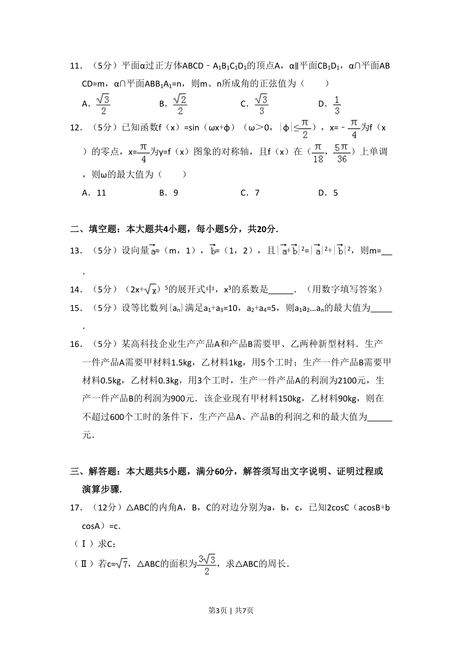第1页|共7页2016年全国统一高考数学试卷(理科)(新课标Ⅰ)一、选择题:本大题共12小题,每小题5分,在每小题给出的四个选项中,只有一项是符合题目要求的.1.(5分)设集合A={x|x2﹣4x+3<0},B={x|2x﹣3>0},则A∩B=()A.(﹣3,﹣)B.(﹣3,)C.(1,)D.(,3)2.(5分)设(1+i)x=1+yi,其中x,y是实数,则|x+yi|=()A.1B.C.D.23.(5分)已知等差数列{an}前9项的和为27,a10=8,则a100=()A.100B.99C.98D.974.(5分)某公司的班车在7:00,8:00,8:30发车,小明在7:50至8:30之间到达发车站乘坐班车,且到达发车站的时刻是随机的,则他等车时间不超过10分钟的概率是()A.B.C.D.5.(5分)已知方程﹣=1表示双曲线,且该双曲线两焦点间的距离为4,则n的取值范围是()A.(﹣1,3)B.(﹣1,)C.(0,3)D.(0,)6.(5分)如图,某几何体的三视图是三个半径相等的圆及每个圆中两条相互垂直的半径.若该几何体的体积是,则它的表面积是()A.17πB.18πC.20πD.28π7.(5分)函数y=2x2﹣e|x|在[﹣2,2]的图象大致为()第2页|共7页A.B.C.D.8.(5分)若a>b>1,0<c<1,则()A.ac<bcB.abc<bacC.alogbc<blogacD.logac<logbc9.(5分)执行下面的程序框图,如果输入的x=0,y=1,n=1,则输出x,y的值满足()A.y=2xB.y=3xC.y=4xD.y=5x10.(5分)以抛物线C的顶点为圆心的圆交C于A、B两点,交C的准线于D、E两点.已知|AB|=4,|DE|=2,则C的焦点到准线的距离为()A.2B.4C.6D.8第3页|共7页11.(5分)平面α过正方体ABCD﹣A1B1C1D1的顶点A,α∥平面CB1D1,α∩平面ABCD=m,α∩平面ABB1A1=n,则m、n所成角的正弦值为()A.B.C.D.12.(5分)已知函数f(x)=sin(ωx+φ)(ω>0,|φ|≤),x=﹣为f(x)的零点,x=为y=f(x)图象的对称轴,且f(x)在(,)上单调,则ω的最大值为()A.11B.9C.7D.5二、填空题:本大题共4小题,每小题5分,共20分.13.(5分)设向量=(m,1),=(1,2),且|+|2=||2+||2,则m=.14.(5分)(2x+)5的展开式中,x3的系数是.(用数字填写答案)15.(5分)设等比数列{an}满足a1+a3=10,a2+a4=5,则a1a2…an的最大值为.16.(5分)某高科技企业生产产品A和产品B需要甲、乙两种新型材料.生产一件产品A需要甲材料1.5kg,乙材料1kg,用5个工时;生产一件产品B需要甲材料0.5kg,乙材料0.3kg,用3个工时,生产一件产品A的利润为2100元,生产一件产品B的利润为900元.该企业现有甲材料150kg,乙材料90kg,则在不超过600个工时的条件下,生产产品A、产品B的利润之和的最大值为元.三、解答题:本大题共5小题,满分60分,解答须写出文字说明、证明过程或演算步骤.17.(12分)△ABC的内角A,B,C的对边分别为a,b,c,已知2cosC(acosB+bcosA)=c.(Ⅰ)求C;(Ⅱ)若c=,△ABC的面积为,求△ABC的周长.第4页|共7页18.(12分)如图,在以A,B,C,D,E,F为顶点的五面体中,面ABEF为正方形,AF=2FD,∠AFD=90°,且二面角D﹣AF﹣E与二面角C﹣BE﹣F都是60°.(Ⅰ)证明平面ABEF⊥平面EFDC;(Ⅱ)求二面角E﹣BC﹣A的余弦值.19.(12分)某公司计划购买2台机器,该种机器使用三年后即被淘汰.机器有一易损零件,在购进机器时,可以额外购买这种零件作为备件,每个200元.在机器使用期间,如果备件不足再购买,则每个500元.现需决策在购买机器时应同时购买几个易损零件,为此搜集并整理了100台这种机器在三年使用期内更换的易损零件数,得如图柱状图:以这100台机器更换的易损零件数的频率代替1台机器更换的易损零件数发生的概率,记X表示2台机器三年内共需更换的易损零件数,n表示购买2台机器的同时购买的易损零件数.(Ⅰ)求X的分布列;(Ⅱ)若要求P(X≤n)≥0.5,确定n的最小值;(Ⅲ)以购买易损零件所需费用的期望值为决策依据,在n=19与n=20之中选其一,应选用哪个?第5页|共7页20.(12分)设圆x2+y2+2x﹣15=0的圆心为A,直线l过点B(1,0)且与x轴不重合,l交圆A于C,D两点,过B作AC的平行线交AD于点E.(Ⅰ)证明|EA|+|EB|为定值,并写出点E的轨迹方程;(Ⅱ)设...