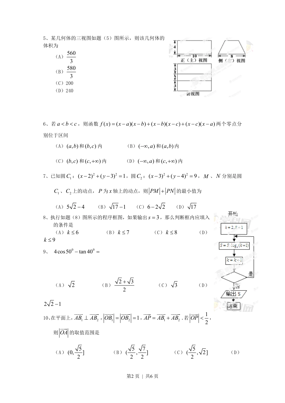 第1页|共6页特别提醒:zhangwlx(14)、(15)、(16)三题为选做题,请从中任选两题作答,若三题全做,则按前两题给分.一.选择题:本大题共10小题,每小题5分,共50分.在每小题给出的四个备选项中,只有一个选项是符合题目要求的.zhangwlx1、已知集合{1,2,3,4}U=,集合={1,2}A,={2,3}B,则()UAB=Uð(A){1,3,4}(B){3,4}(C){3}(D){4}2、命题“对任意xRÎ,都有20x³”的否定为(A)对任意xRÎ,使得20x<(B)不存在xRÎ,使得20x<(C)存在0xRÎ,都有200x³(D)存在0xRÎ,都有200x<3、(3)(6)aa-+(63a-££)的最大值为(A)9(B)92(C)3(D)3224、以下茎叶图记录了甲、乙两组各5名学生在一次英语听力测试中的成绩(单位:分).甲组乙组909x215y87424已知甲组数据的中位数为15,乙组数据的平均数为16.8,则x、y的值分别为(A)2、5(B)5、5(C)5,8(D)8,8zhangwlx第2页|共6页5、某几何体的三视图如题(5)图所示,则该几何体的体积为(A)5603(B)5803(C)200(D)240zhangwlx6、若abc<<,则函数()()()()()()()fxxaxbxbxcxcxa=--+--+--两个零点分别位于区间(A)(,)ab和(,)bc内(B)(,)a-¥和(,)ab内(C)(,)bc和(,)c+¥内(D)(,)a-¥和(,)c+¥内7、已知圆1C:22(2)(3)1xy-+-=,圆2C:22(3)(4)9xy-+-=,M、N分别是圆1C、2C上的动点,P为x轴上的动点,则PMPN+的最小值为(A)524-(B)171-(C)622-(D)178、执行如题(8)图所示的程序框图,如果输出3s=,那么判断框内应填入的条件是(A)6k£(B)7k£(C)8k£(D)9k£9、004cos50tan40-=zhangwlx(A)2(B)232+(C)3(D)221-10、在平面上,12ABAB^uuuruuuur,121OBOB==uuuruuuur,12APABAB=+uuuruuuruuuur.若12OP<uuur,则OAuuur的取值范围是(A)5(0,]2(B)57(,]22(C)5(,2]2(D)第3页|共6页7(,2]2二.填空题:本大题共6小题,考生作答5小题,每小题5分,共25分.把答案填写在答题卡相应位置上.11、已知复数512izi=+(i是虚数单位),则z=.zhangwlx12、已知na是等差数列,11a=,公差0d¹,nS为其前n项和,若1a、2a、5a称等比数列,则8S=.13、从3名骨科、4名脑外科和5名内科医生中选派5人组成一个抗震救灾医疗小组,则骨科、脑外科和内科医生都至少有1人的选派方法种数是(用数字作答).考生注意:(14)、(15)、(16)三题为选做题,请从中任选两题作答,若三题全做,则按前两题给分.14、如题(14)图,在△ABC中,090CÐ=,060AÐ=,20AB=,过C作△ABC的外接圆的切线CD,BD⊥CD,BD与外接圆交于点E,则DE的长为.zhangwlx15、在直角坐标系xOy中,以原点O为极点,x轴的正半轴为极轴建立极坐标系.若极坐标方程为cos4rq=的直线与曲线23xtytì=í=î(t为参数)相交于A、B两点,则AB=.16、若关于实数x的不等式53xxa-++<无解,则实数a的取值范围是.zhangwlx三.解答题:本大题共6小题,共75分.解答应写出文字说明、证明过程或演算步骤.17、(本小题满分13分,(Ⅰ)小问6分,(Ⅱ)小问7分)设2()(5)6lnfxaxx=-+,其中aRÎ,曲线()yfx=在点(1,(1)f)处的切线与y轴相较于点(0,6).(Ⅰ)确定a的值;(Ⅱ)求函数()fx的单调区间与极值.18、(本小题满分13分,(Ⅰ)小问5分,(Ⅱ)小问8分)某商场举行的“三色球”购物摸奖活动规定:在一次摸奖中,摸奖者先从装有3个红球与4个白球的袋中任意摸出3个球,再从装有1个篮球与2个白球的袋中任意摸出1个第4页|共6页球,根据摸出4个球中红球与篮球的个数,设一、二、三等奖如下:zhangwlx奖级摸出红、蓝球个数获奖金额一等奖3红1蓝200元二等奖3红0蓝50元三等奖2红1蓝10元其余情况无奖且每次摸奖最多只能获得一个奖级.(Ⅰ)求一次摸球恰好摸到1个红球的概率;(Ⅱ)求摸奖者在一次摸奖中获奖金额X的分布列与期望()EX.19、(本小题满分13分,(Ⅰ)小问5分,(Ⅱ)小问8分)如题(19)图,四棱锥PABCD-中,PA⊥底面ABCD,2BCCD==,4AC=,3ACBACDpÐ=Ð=,F为PC的中点,AF⊥PB.(Ⅰ)求PA的长;(Ⅱ)求二面角BAFD--的正弦值.zhangwlx20、(本小题满分12分,(Ⅰ)小问4分,(Ⅱ)小问8分)在△ABC中,内角A、B、C的对边分别是a、b...