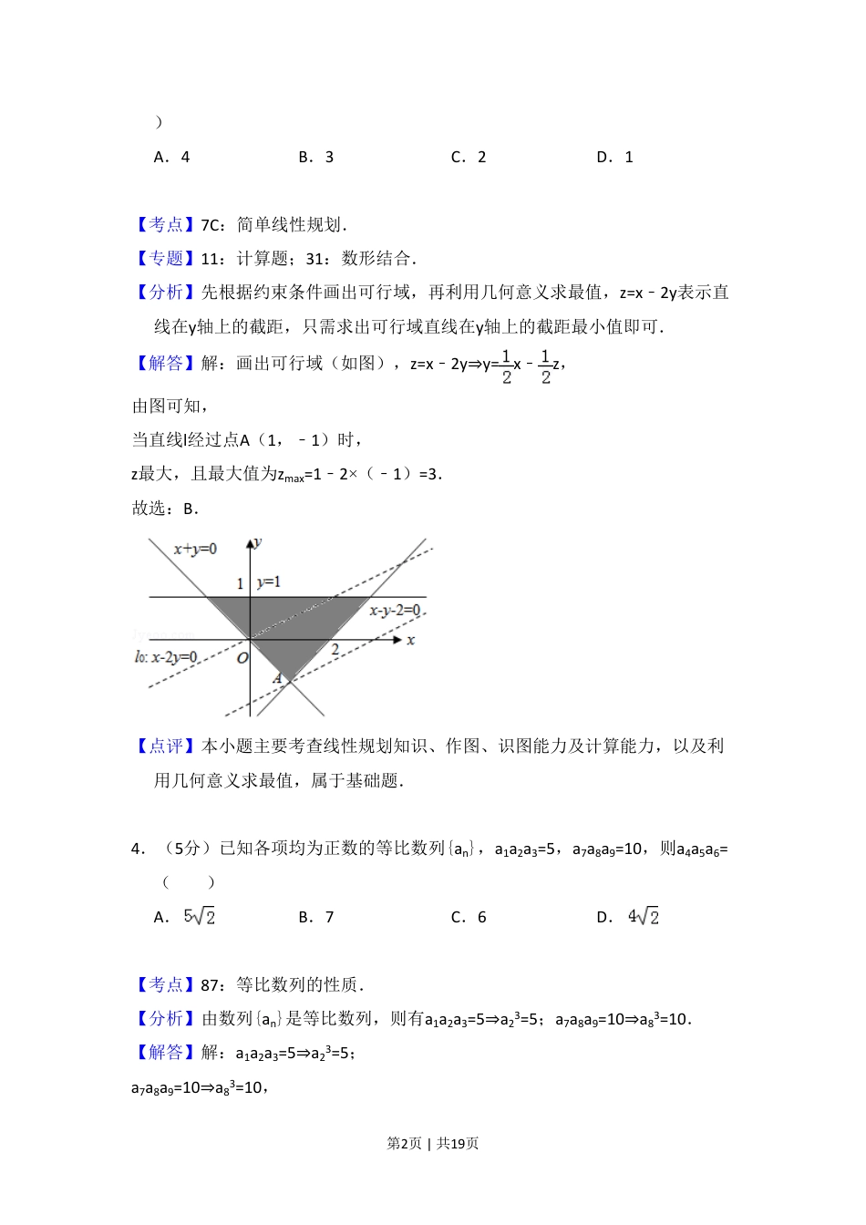 第1页|共19页2010年全国统一高考数学试卷(文科)(大纲版Ⅰ)参考答案与试题解析一、选择题(共12小题,每小题5分,满分60分)1.(5分)cos300°=()A.B.﹣C.D.【考点】GO:运用诱导公式化简求值.菁优网版权所有【专题】11:计算题.【分析】利用三角函数的诱导公式,将300°角的三角函数化成锐角三角函数求值.【解答】解: .故选:C.【点评】本小题主要考查诱导公式、特殊三角函数值等三角函数知识.2.(5分)设全集U={1,2,3,4,5},集合M={1,4},N={1,3,5},则N∩(∁UM)=()A.{1,3}B.{1,5}C.{3,5}D.{4,5}【考点】1H:交、并、补集的混合运算.菁优网版权所有【分析】根据补集意义先求CUM,再根据交集的意义求N∩(CUM).【解答】解:(CUM)={2,3,5},N={1,3,5},则N∩(CUM)={1,3,5}∩{2,3,5}={3,5}.故选:C.【点评】本小题主要考查集合的概念、集合运算等集合有关知识,属容易题.3.(5分)若变量x,y满足约束条件,则z=x﹣2y的最大值为(第2页|共19页)A.4B.3C.2D.1【考点】7C:简单线性规划.菁优网版权所有【专题】11:计算题;31:数形结合.【分析】先根据约束条件画出可行域,再利用几何意义求最值,z=x﹣2y表示直线在y轴上的截距,只需求出可行域直线在y轴上的截距最小值即可.【解答】解:画出可行域(如图),z=x﹣2y⇒y=x﹣z,由图可知,当直线l经过点A(1,﹣1)时,z最大,且最大值为zmax=1﹣2×(﹣1)=3.故选:B.【点评】本小题主要考查线性规划知识、作图、识图能力及计算能力,以及利用几何意义求最值,属于基础题.4.(5分)已知各项均为正数的等比数列{an},a1a2a3=5,a7a8a9=10,则a4a5a6=()A.B.7C.6D.【考点】87:等比数列的性质.菁优网版权所有【分析】由数列{an}是等比数列,则有a1a2a3=5⇒a23=5;a7a8a9=10⇒a83=10.【解答】解:a1a2a3=5⇒a23=5;a7a8a9=10⇒a83=10,第3页|共19页a52=a2a8,∴,∴,故选:A.【点评】本小题主要考查等比数列的性质、指数幂的运算、根式与指数式的互化等知识,着重考查了转化与化归的数学思想.5.(5分)(1﹣x)4(1﹣)3的展开式x2的系数是()A.﹣6B.﹣3C.0D.3【考点】DA:二项式定理.菁优网版权所有【分析】列举(1﹣x)4与可以出现x2的情况,通过二项式定理得到展开式x2的系数.【解答】解:将看作两部分与相乘,则出现x2的情况有:①m=1,n=2;②m=2,n=0;系数分别为:①=﹣12;②=6;x2的系数是﹣12+6=﹣6故选:A.【点评】本小题主要考查了考生对二项式定理的掌握情况,尤其是展开式的通项公式的灵活应用,以及能否区分展开式中项的系数与其二项式系数,同时也考查了考生的一些基本运算能力.6.(5分)直三棱柱ABC﹣A1B1C1中,若∠BAC=90°,AB=AC=AA1,则异面直线BA1与AC1所成的角等于()第4页|共19页A.30°B.45°C.60°D.90°【考点】LM:异面直线及其所成的角.菁优网版权所有【专题】1:常规题型.【分析】延长CA到D,根据异面直线所成角的定义可知∠DA1B就是异面直线BA1与AC1所成的角,而三角形A1DB为等边三角形,可求得此角.【解答】解:延长CA到D,使得AD=AC,则ADA1C1为平行四边形,∠DA1B就是异面直线BA1与AC1所成的角,又A1D=A1B=DB=AB,则三角形A1DB为等边三角形,∴∠DA1B=60°故选:C.【点评】本小题主要考查直三棱柱ABC﹣A1B1C1的性质、异面直线所成的角、异面直线所成的角的求法,考查转化思想,属于基础题.7.(5分)已知函数f(x)=|lgx|.若a≠b且,f(a)=f(b),则a+b的取值范围是()A.(1,+∞)B.[1,+∞)C.(2,+∞)D.[2,+∞)【考点】34:函数的值域;3A:函数的图象与图象的变换;4O:对数函数的单调性与特殊点.菁优网版权所有【专题】11:计算题.【分析】由已知条件a≠b,不妨令a<b,又y=lgx是一个增函数,且f(a)=f(b),故可得,0<a<1<b,则lga=﹣lgb,再化简整理即可求解;或采用线性规划问题处理也可以.第5页|共19页【解答】解:(方法一)因为f(a)=f(b),所以|lga|=|lgb|,不妨设0<a<b,则0<a<1<b,∴lga=﹣lgb,lga+lgb=0∴lg(ab)=0∴ab=1,又a>0,b>0,且a≠b∴...